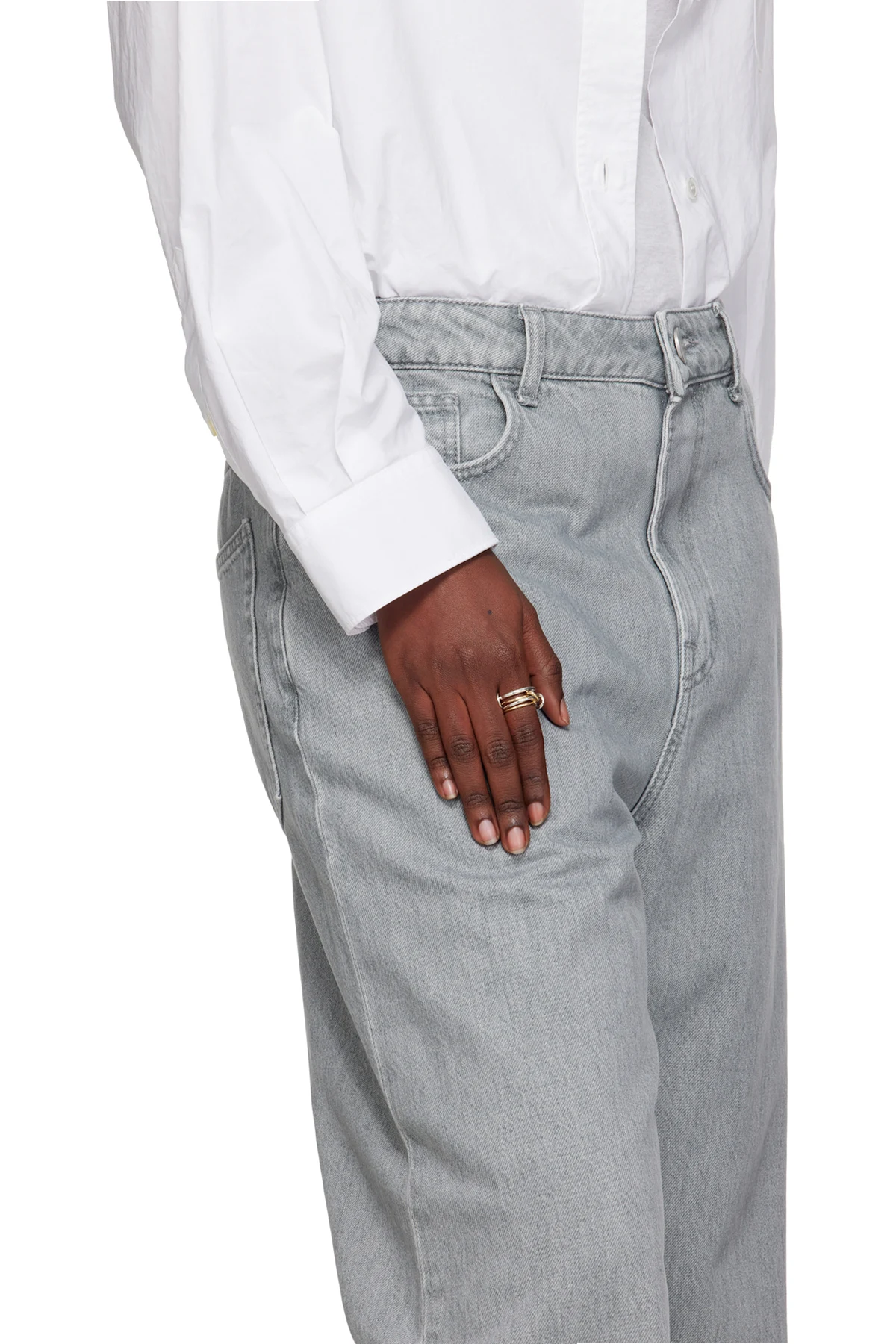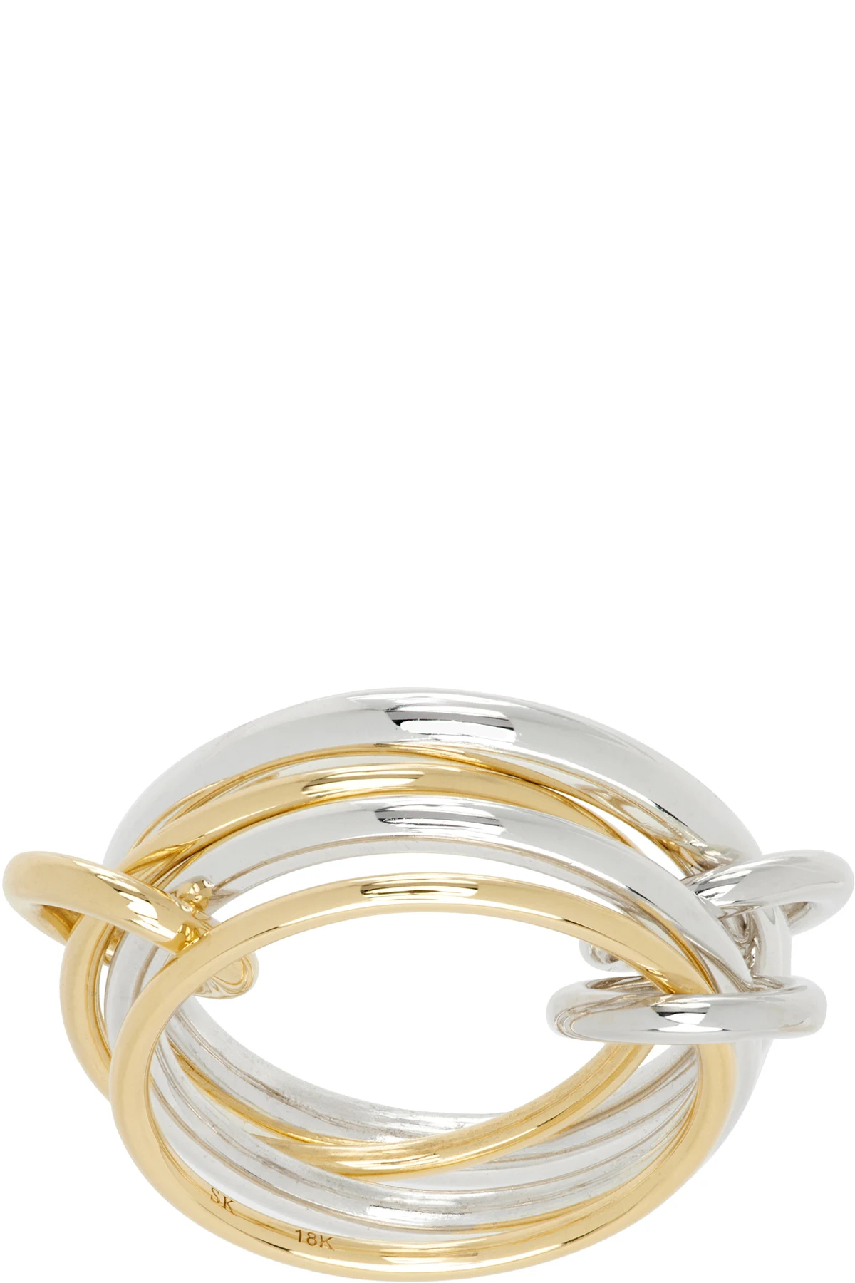 Handcrafted stacked rings in 18k gold and sterling silver. Connecting hoops at length.