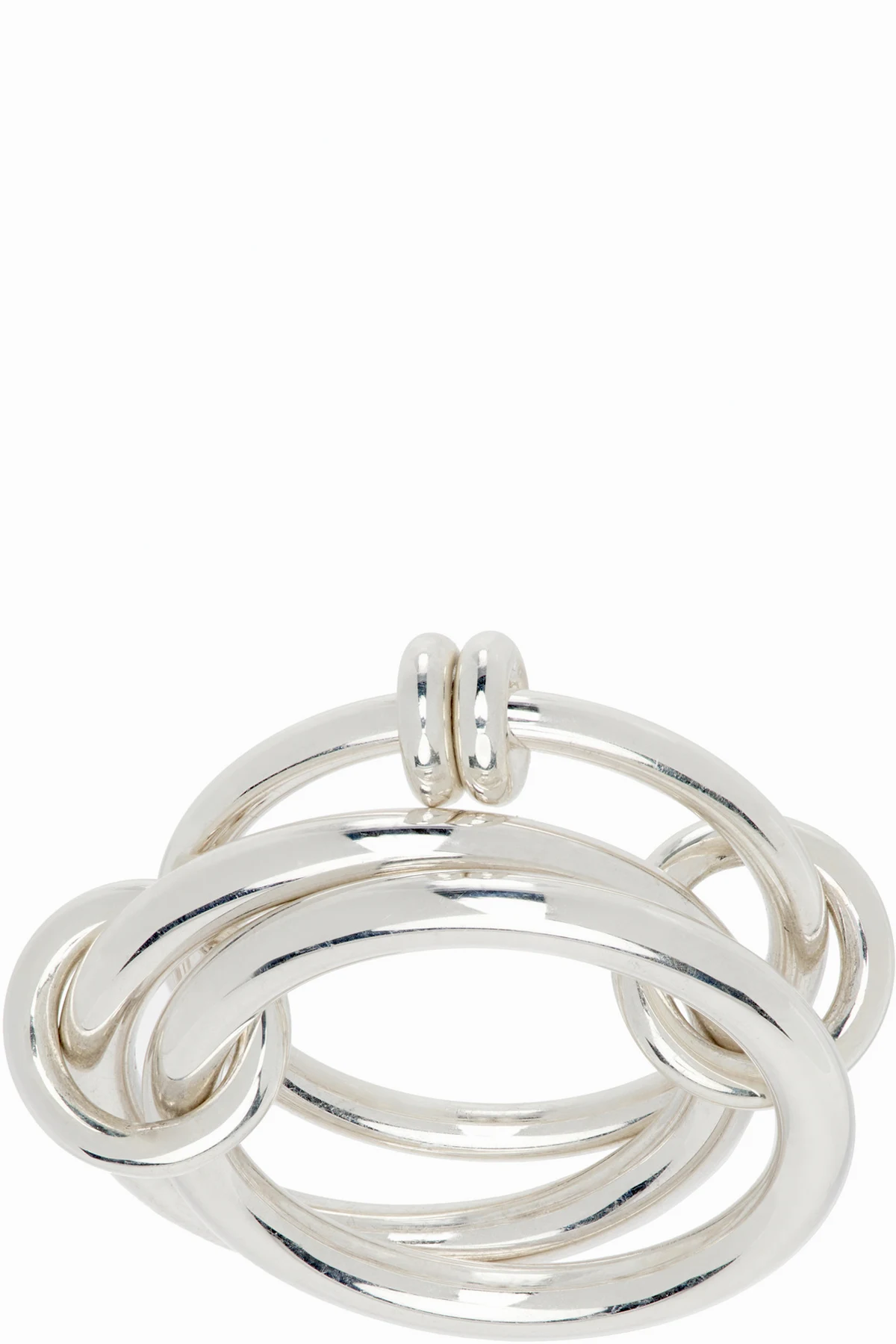 Connected and stacked band rings in sterling silver.