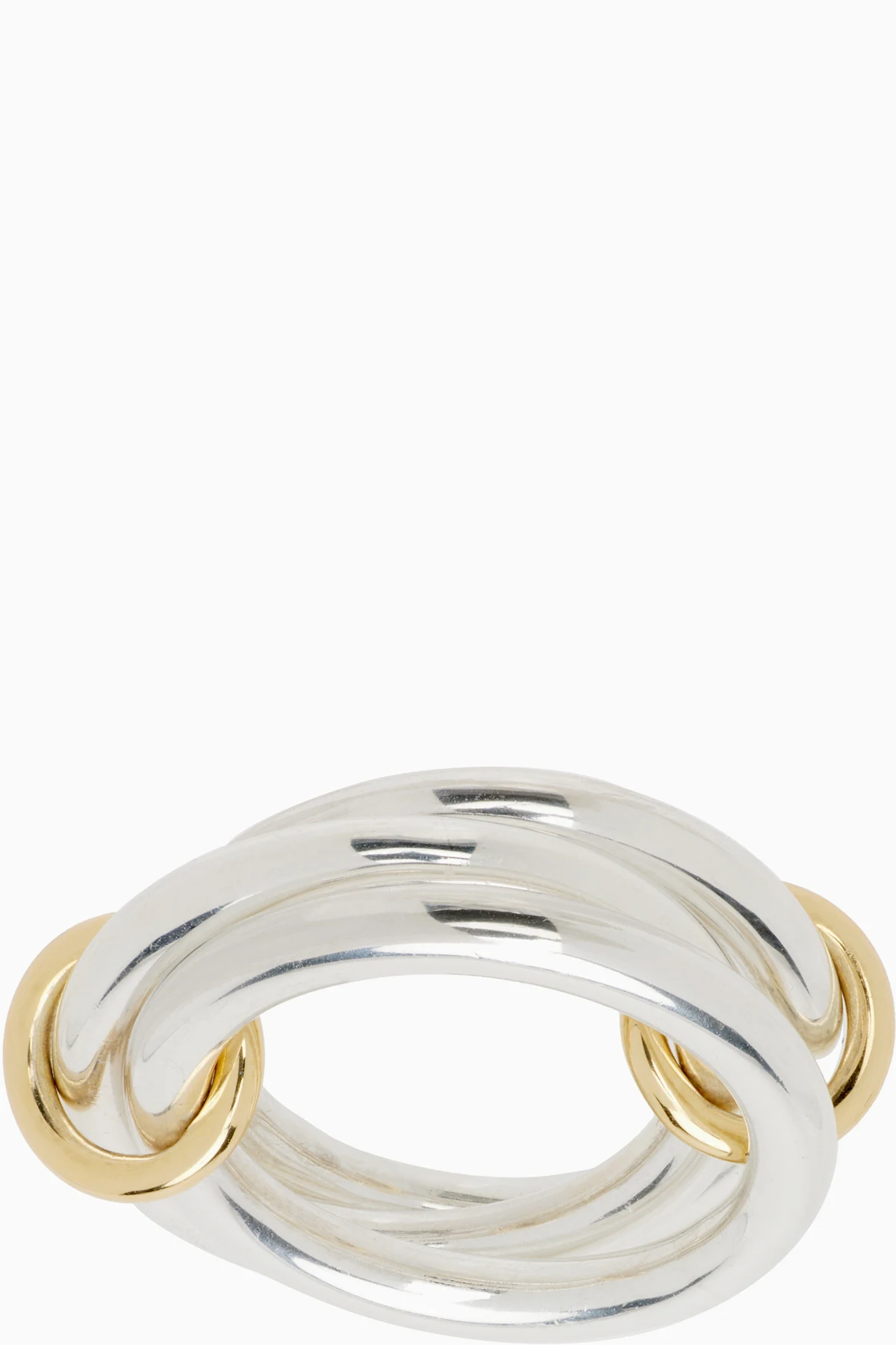 Connected and stacked band rings in sterling silver.