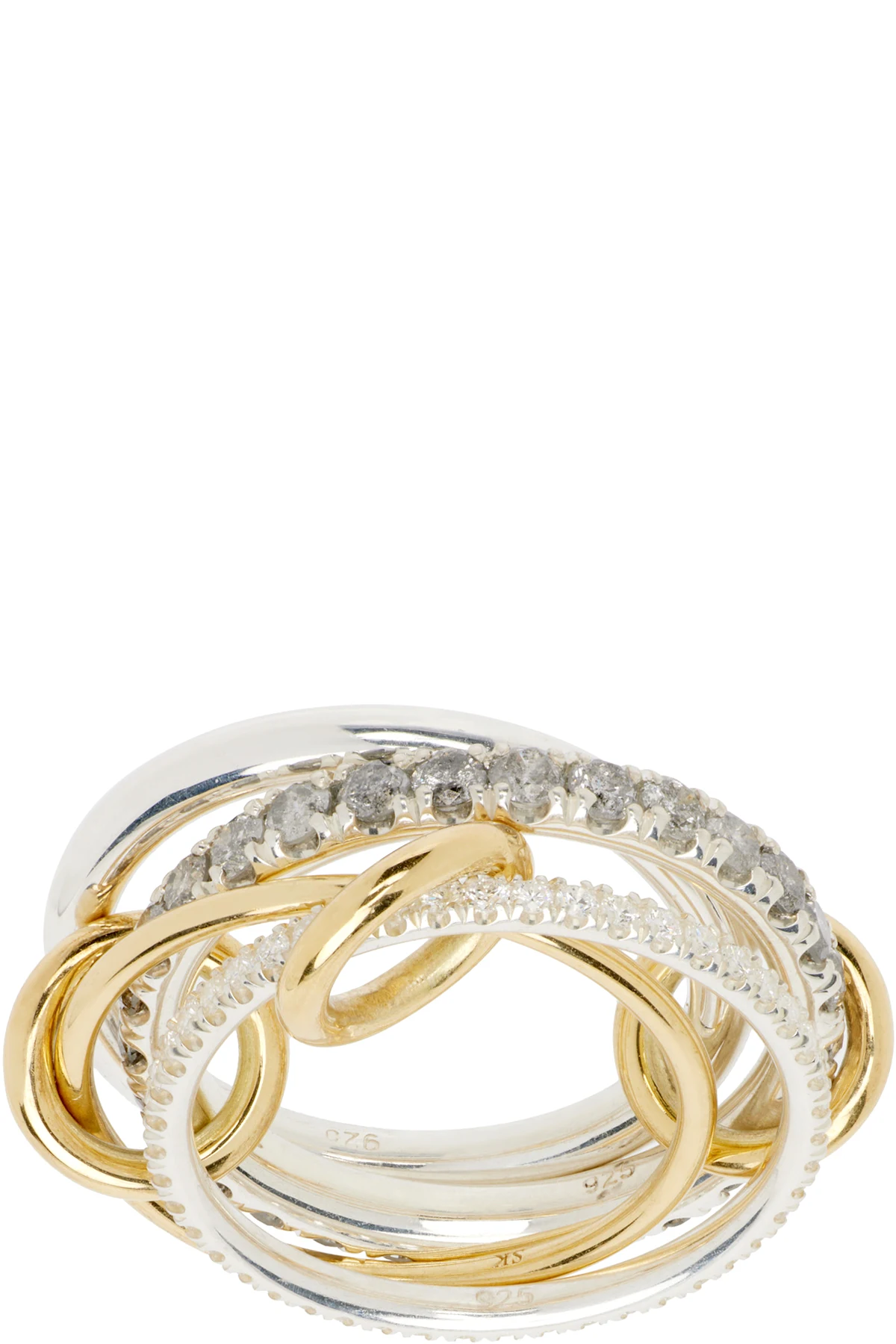 Connected and stacked band rings in sterling silver and 18k yellow gold.