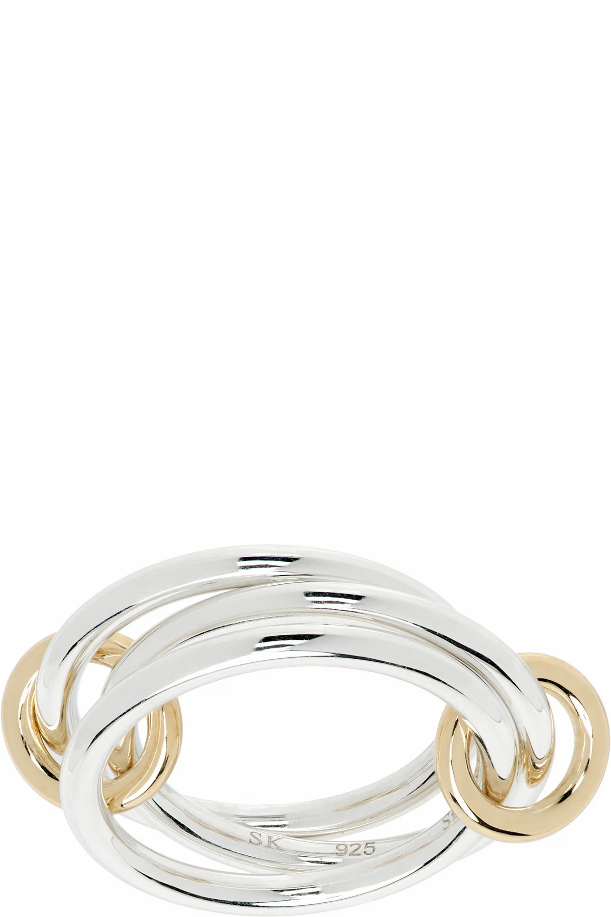Connected and stacked band rings in sterling silver.