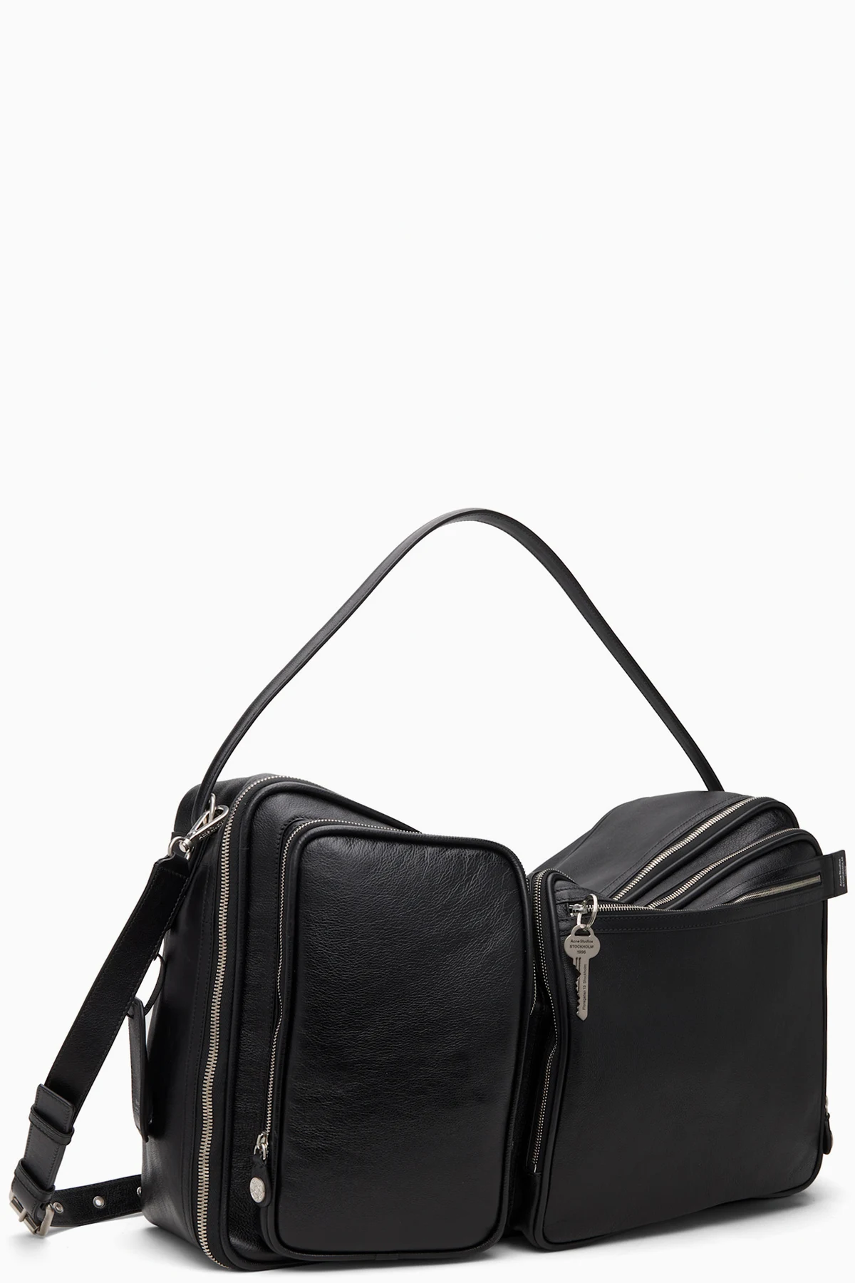 · Logo stamp, key charm, and zip pockets at face
