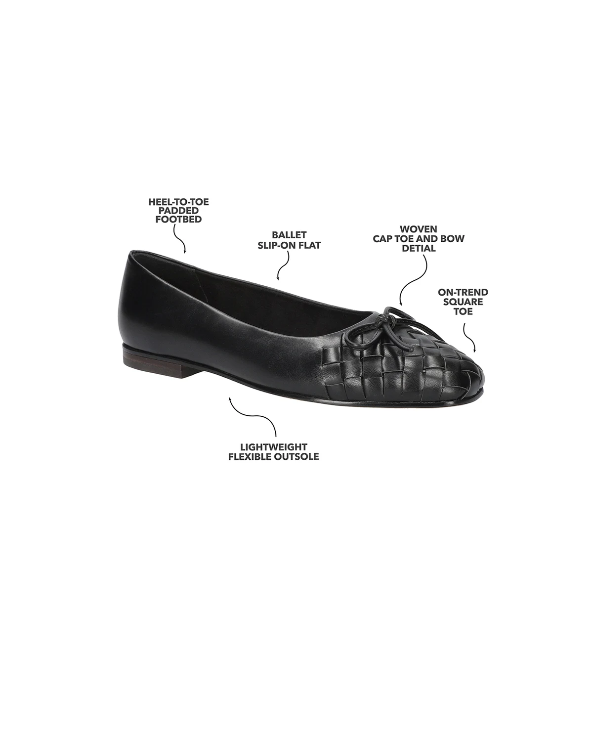 Elevate your everyday style with the on-trend Francie square-toe flat by Bella Vita. Its graceful woven cap toe and charming bow detail add a touch of refinement to your wardrobe. Combining comfort and elegance in a single design, the lightweight outsole and cushioned insole make every step effortless. Experience the perfect combination of style and comfort with the very versatile Francie flat.