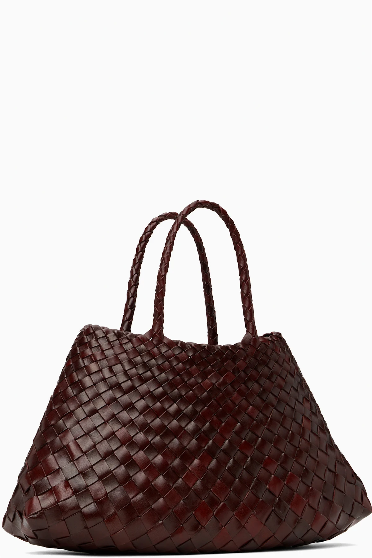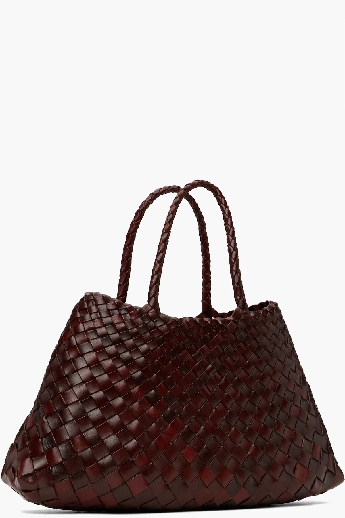 Handcrafted basket-woven buffalo calfskin tote in burgundy.
