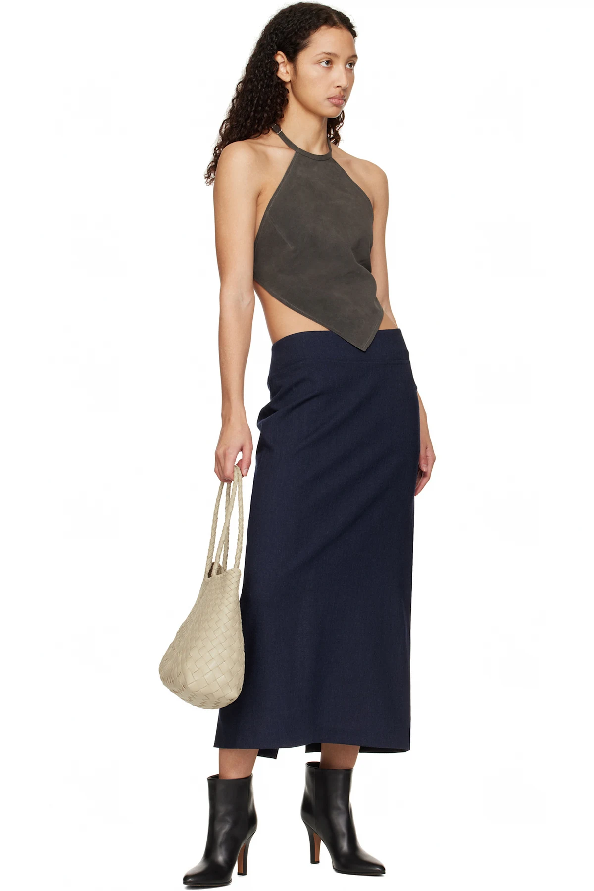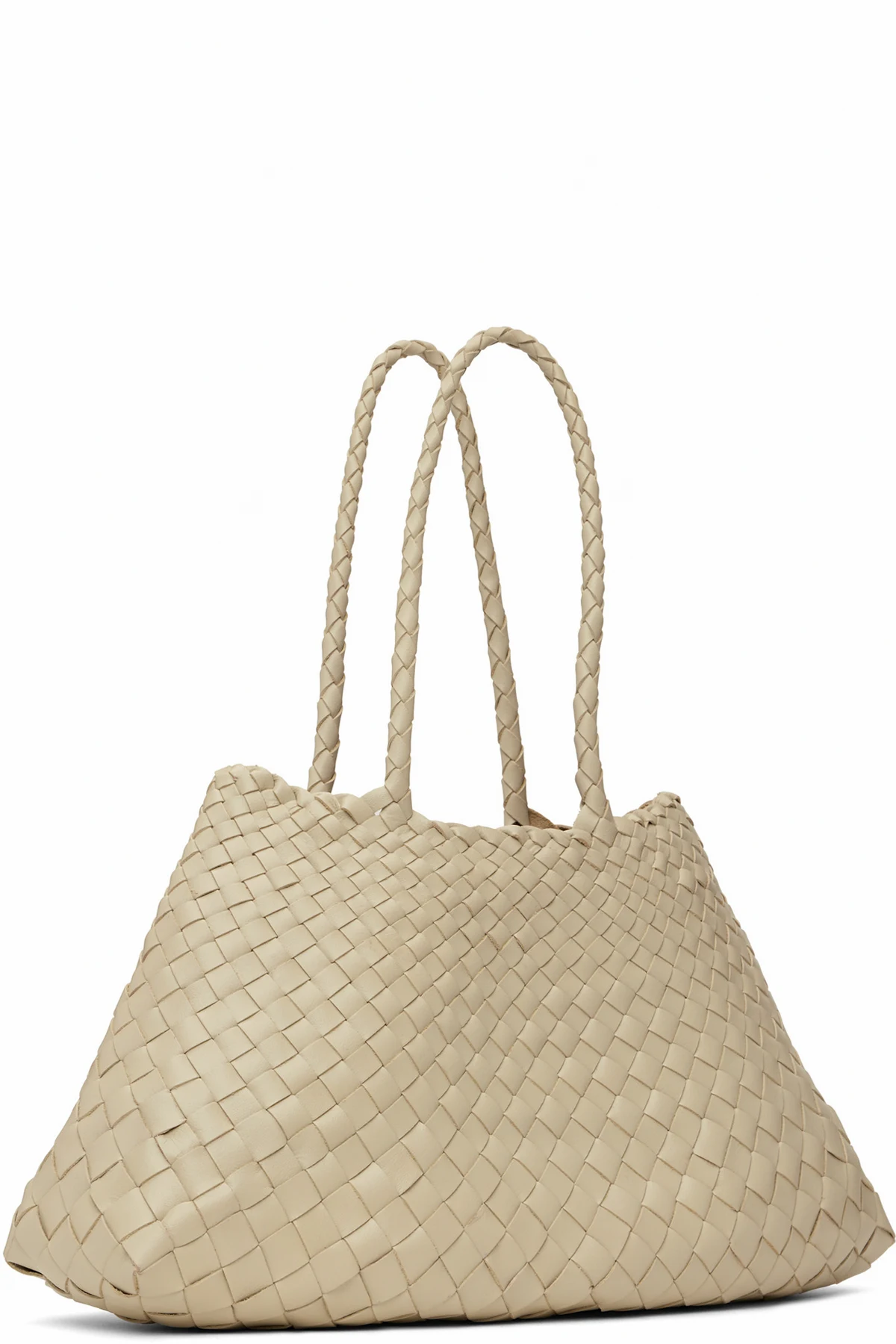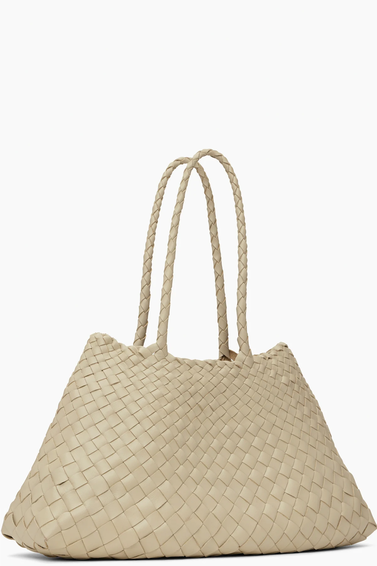 Handcrafted basket-woven buffalo calfskin tote in off-white.