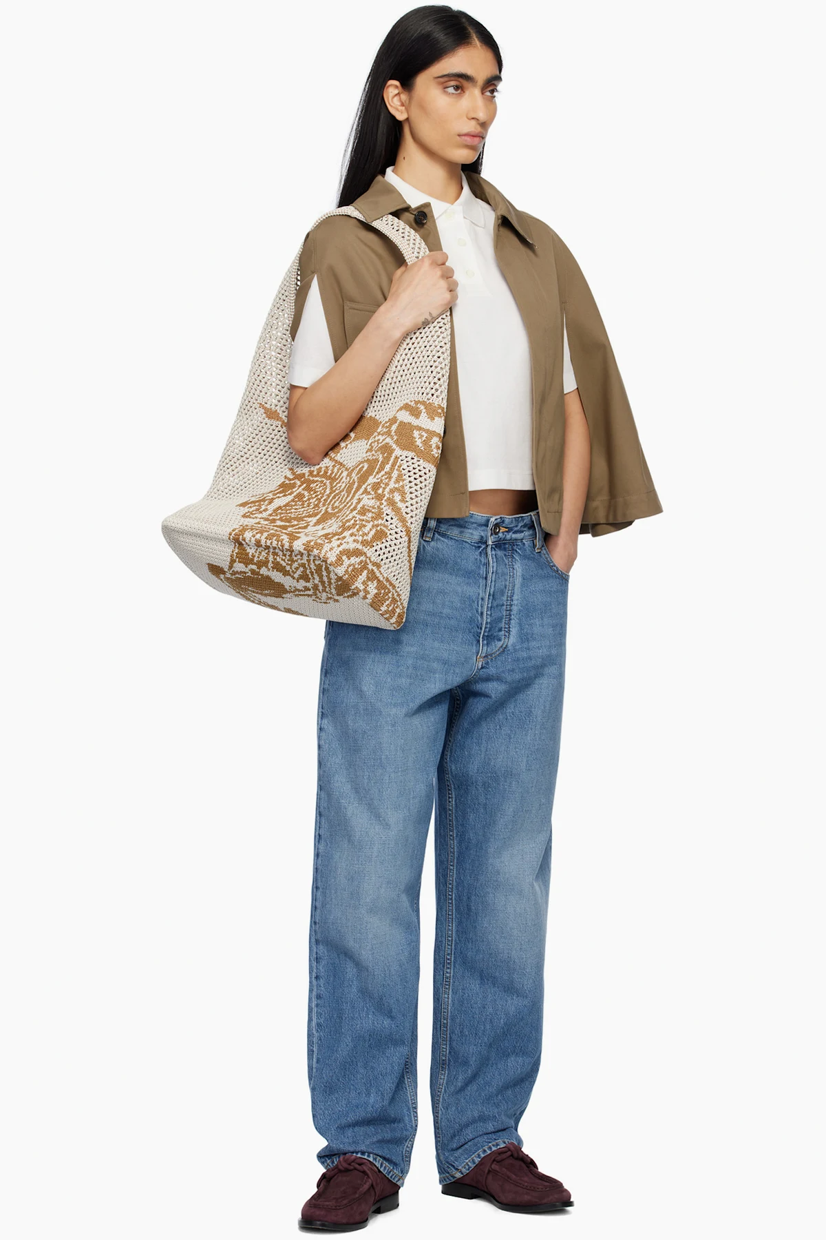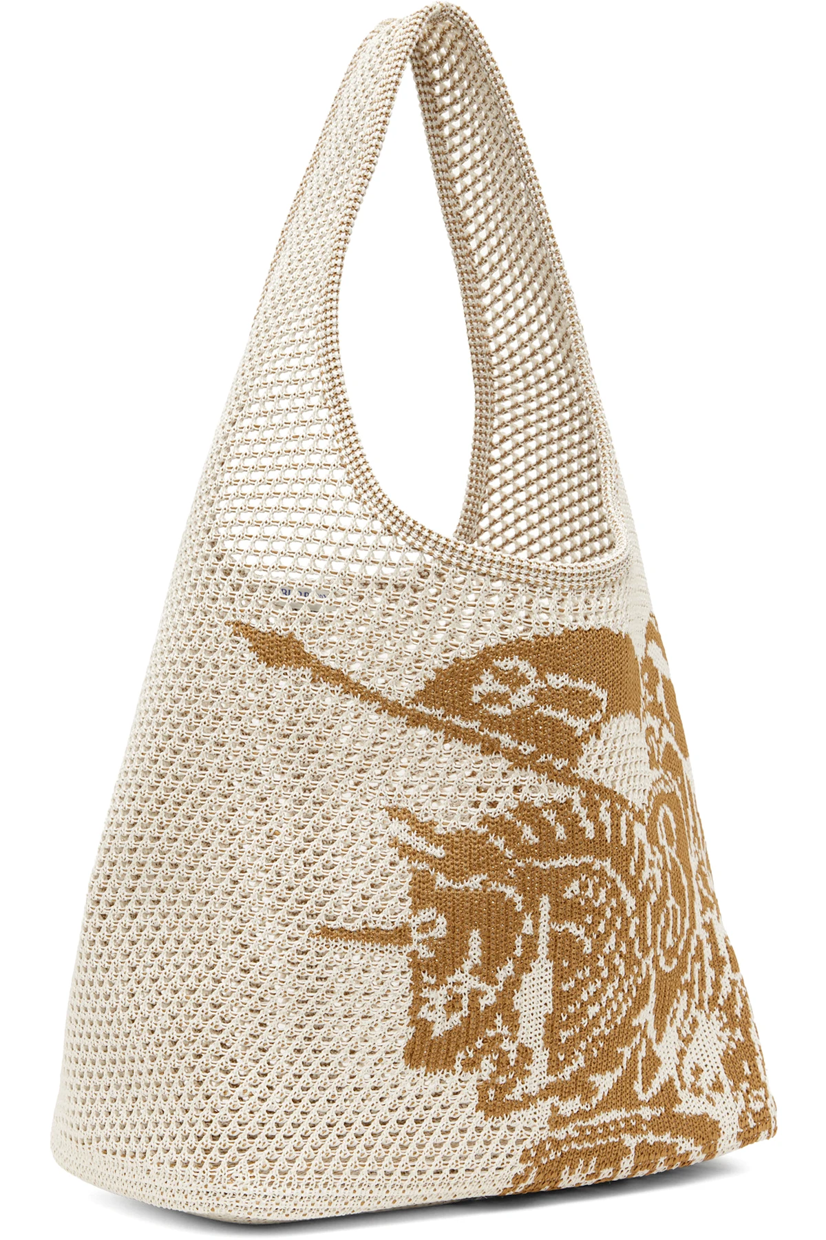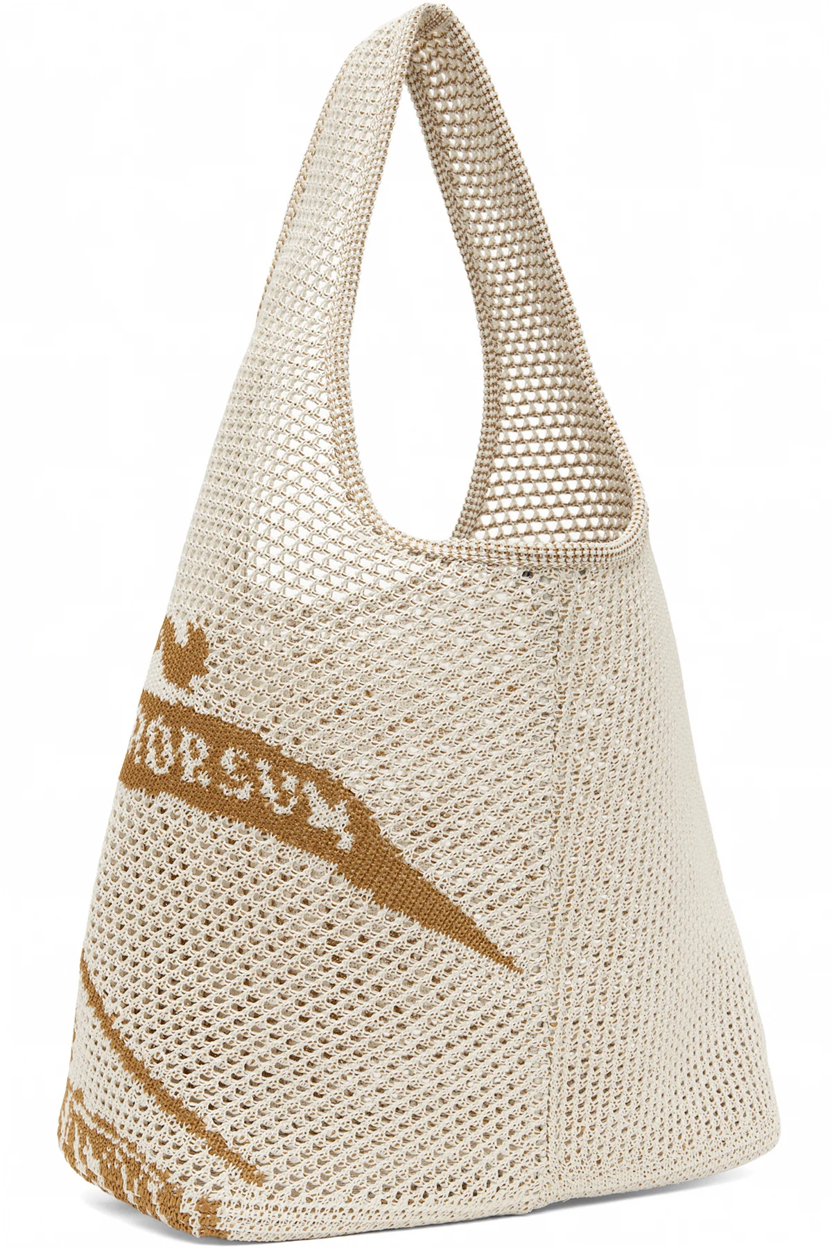 Open-knit tote in white and tan.