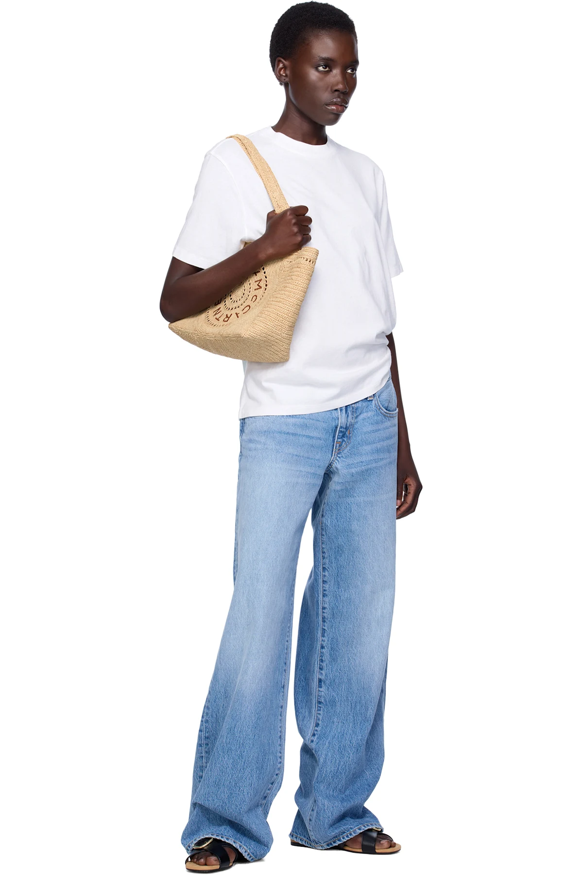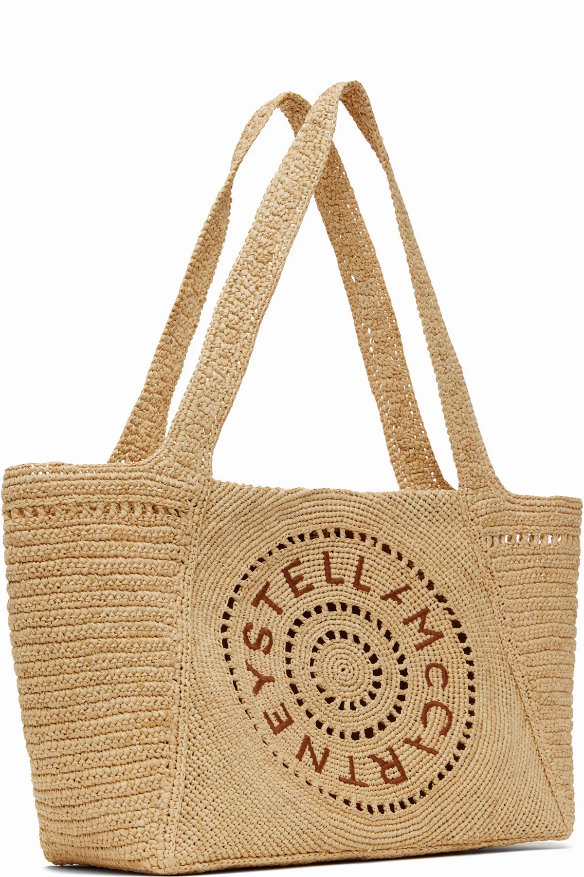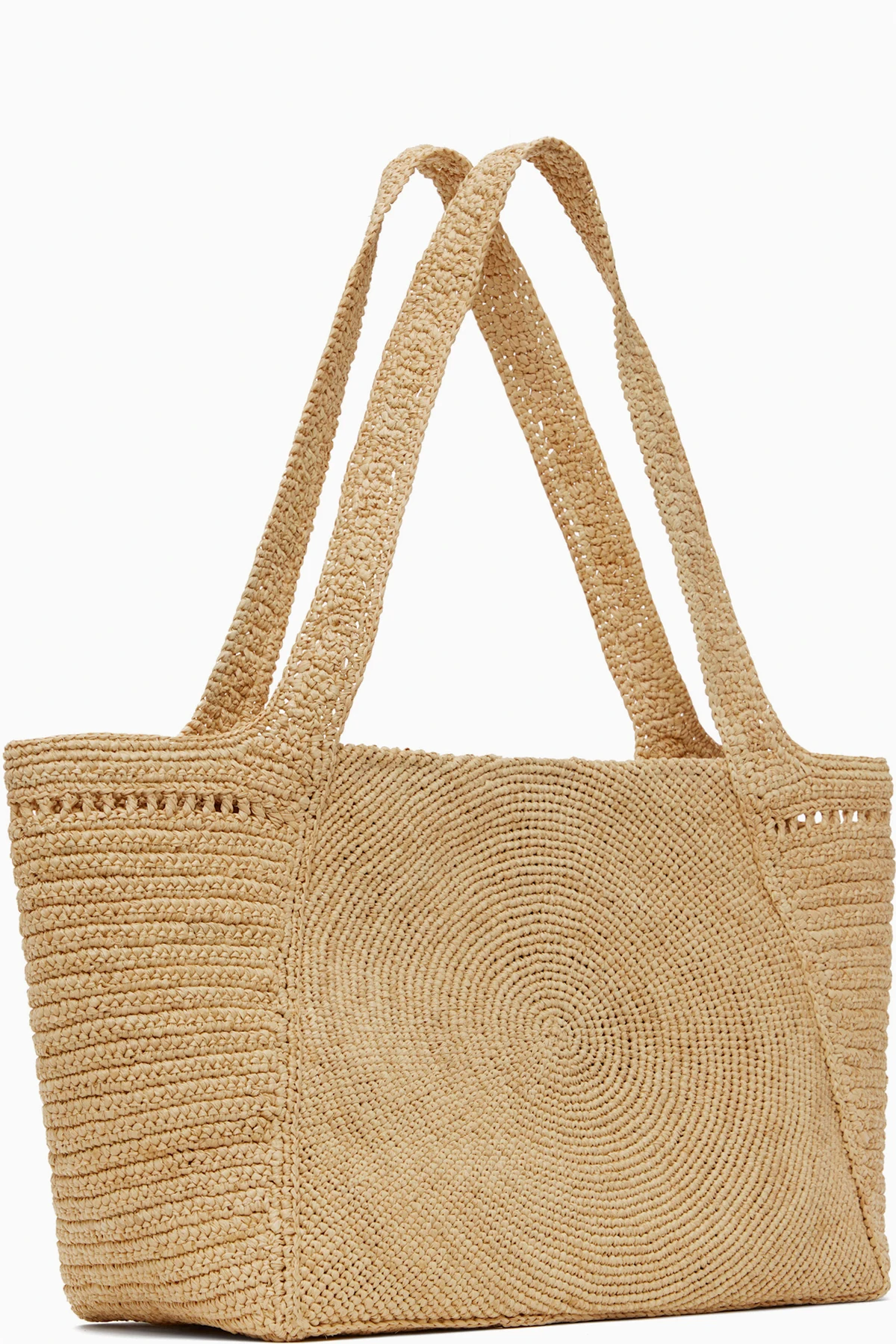 Handcrafted woven raffia tote in beige.