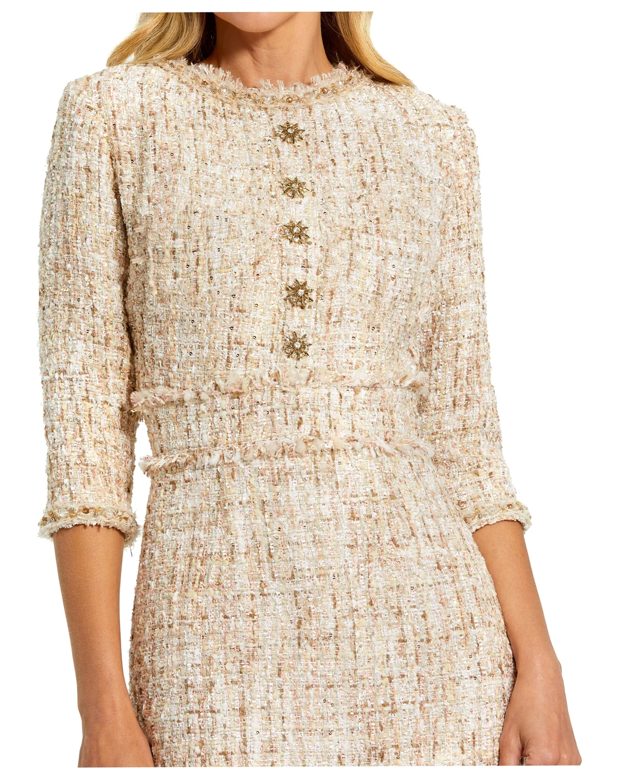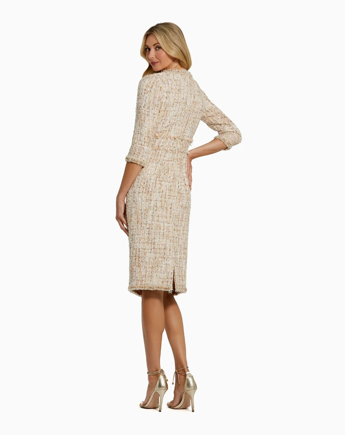 Elegant tweed sheath dress featuring a tailored silhouette with a classic round neckline and three-quarter sleeves. Finished with decorative buttons and subtle texture, this fully lined style is perfect for work events, luncheons, and daytime events.