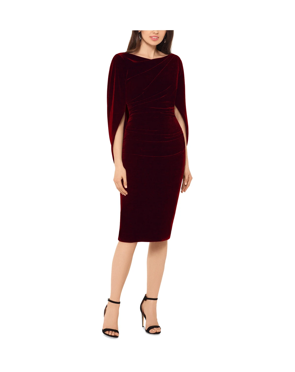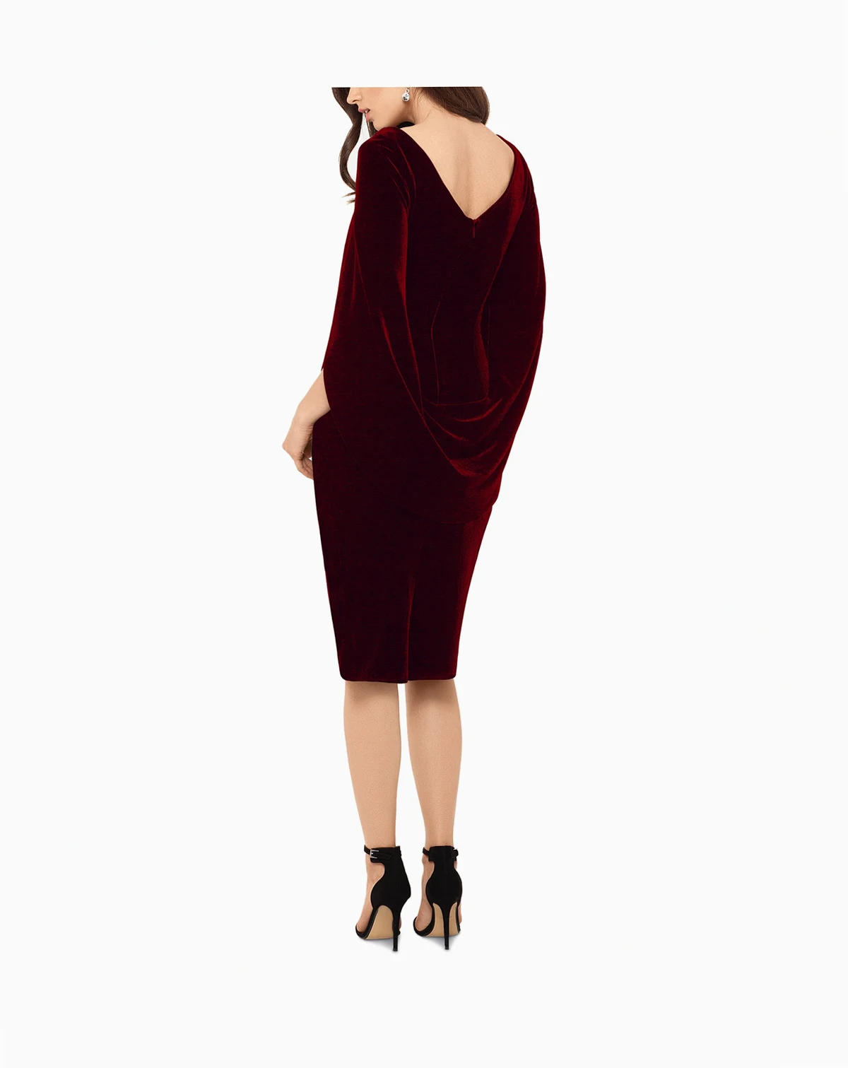 Soft and flowy sleeves with the elegance of a cape and a deep drape in back define the plush velvet shape of this Betsy & Adam sheath that brings standout style to a party.