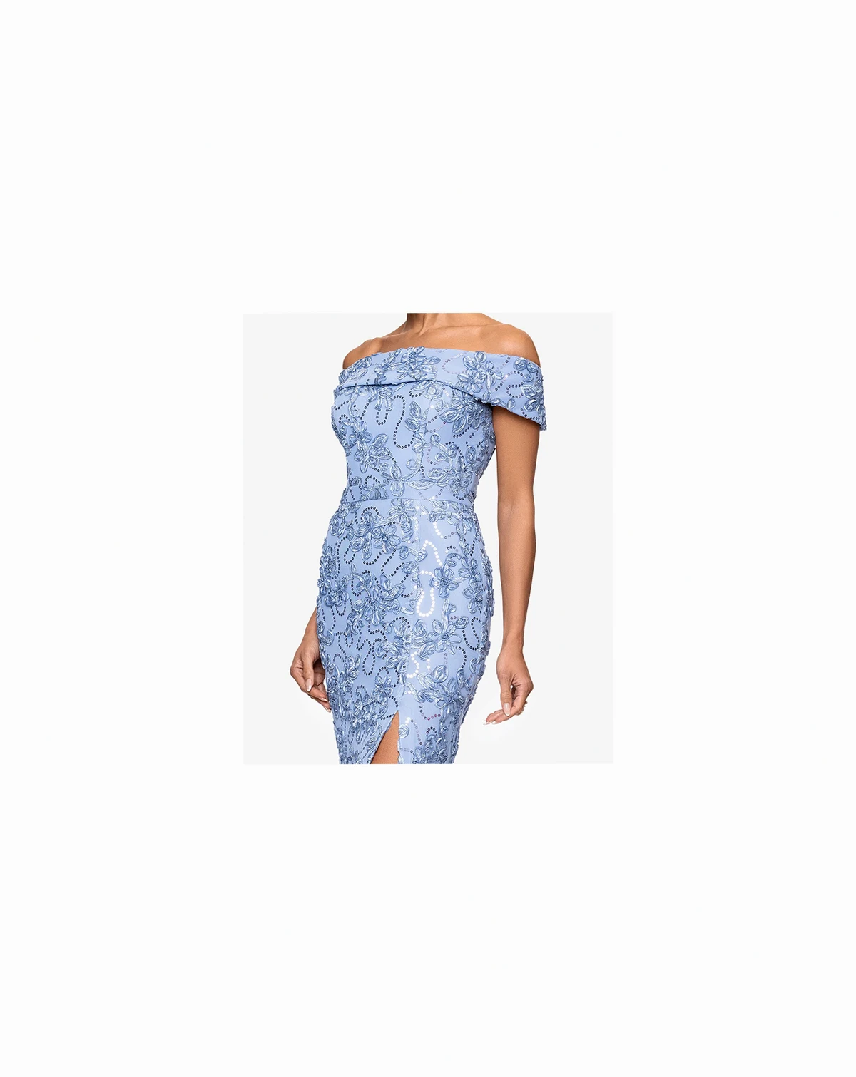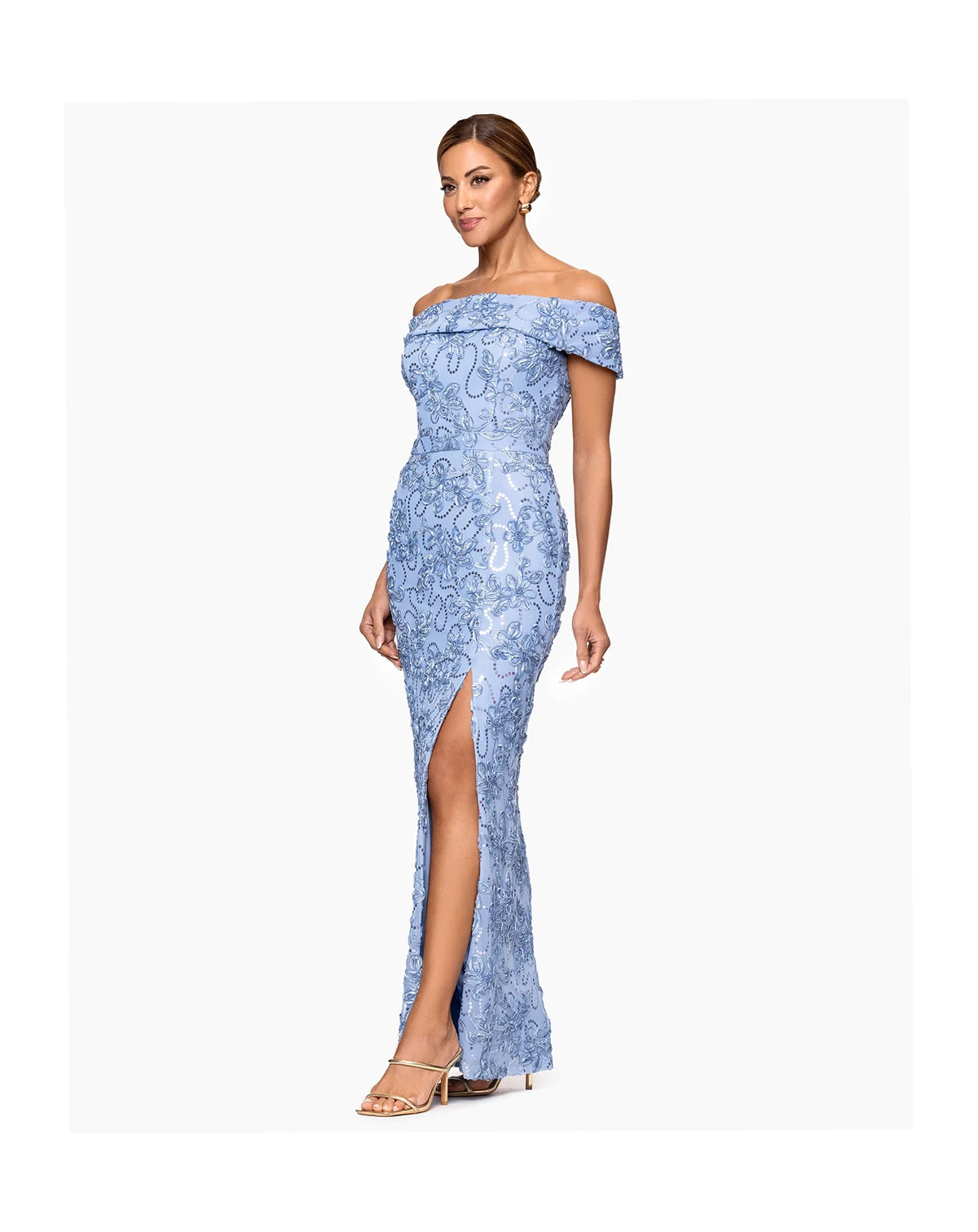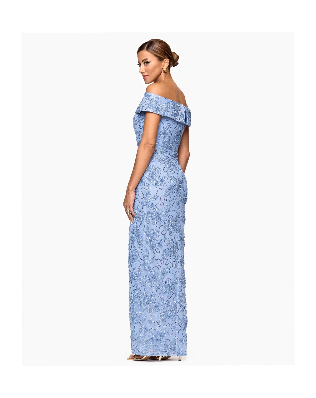 Displaying an off-the-shoulder design, this dress by XSCAPE includes a contemporary slit for a modern twist. The long sheath shape provides a graceful and streamlined figure.