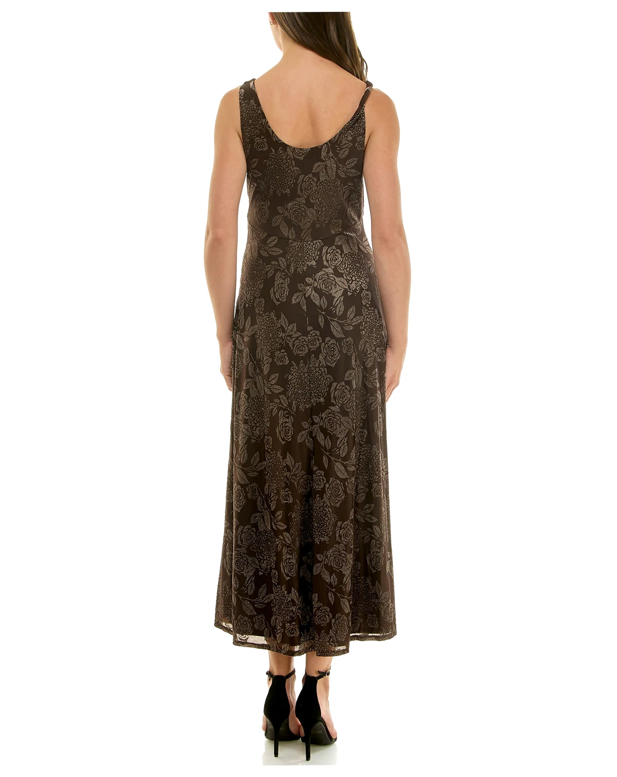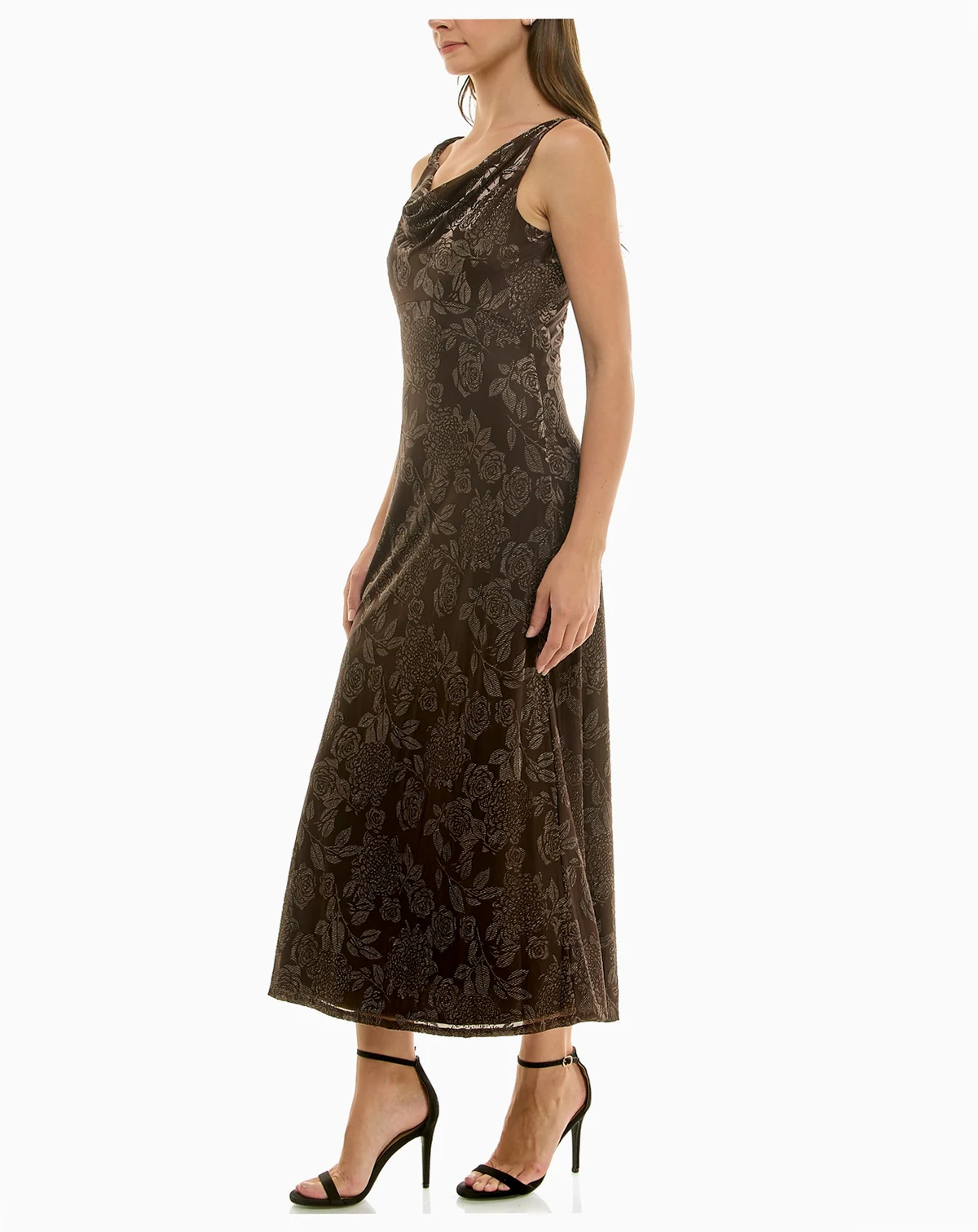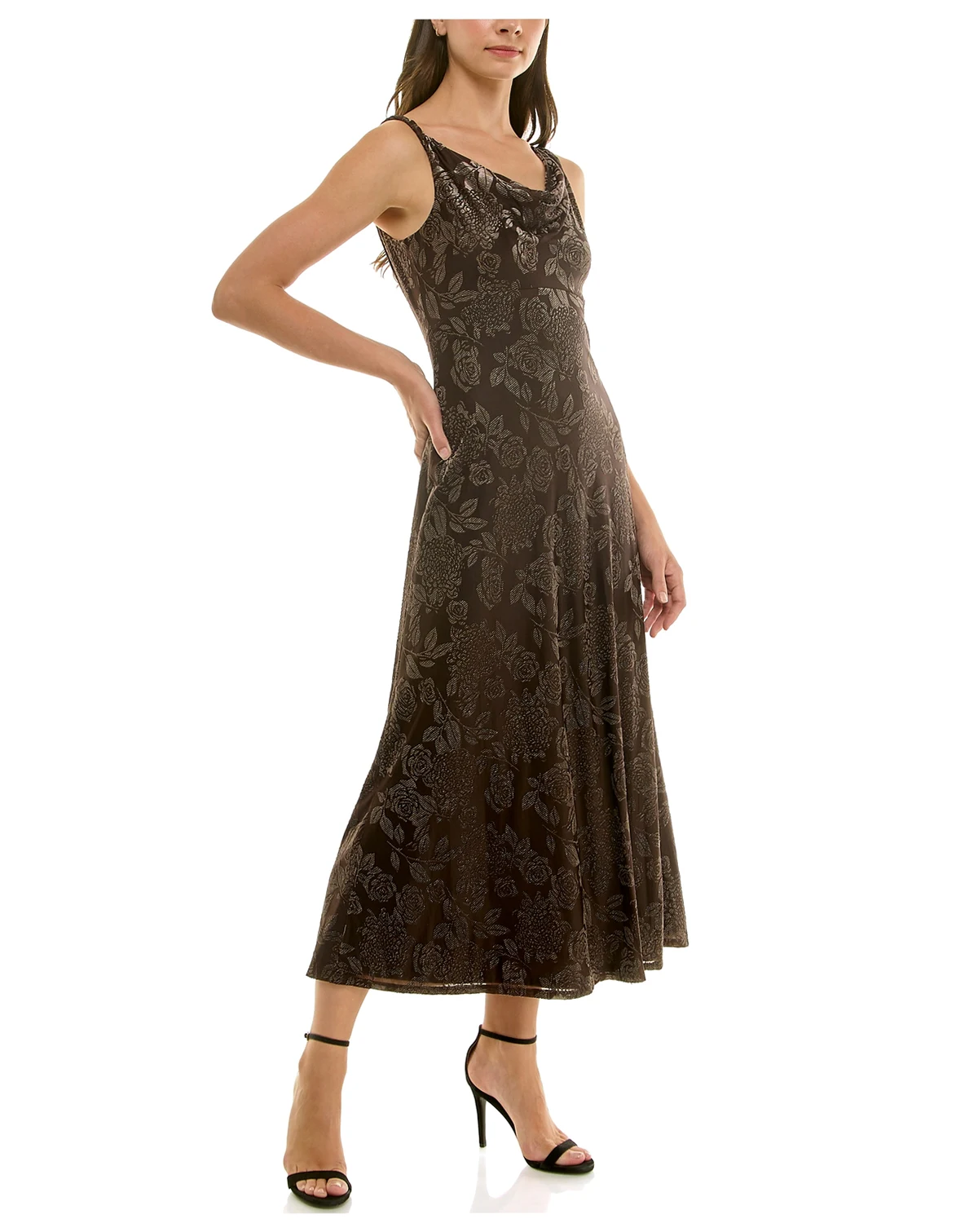 Flowing with an elegant midi length, this Taylor dress features a draped cowl neck and a sleek fit and flare silhouette. The sleeveless design and invisible side zipper offer a sophisticated look for special occasions.