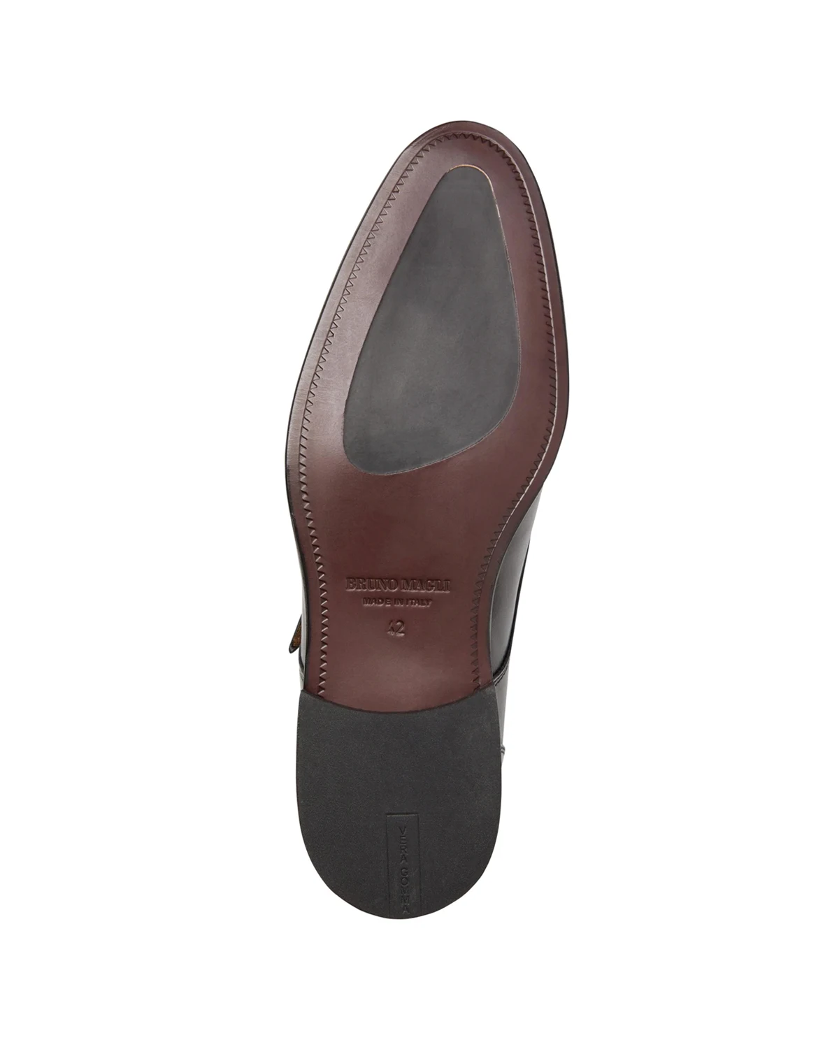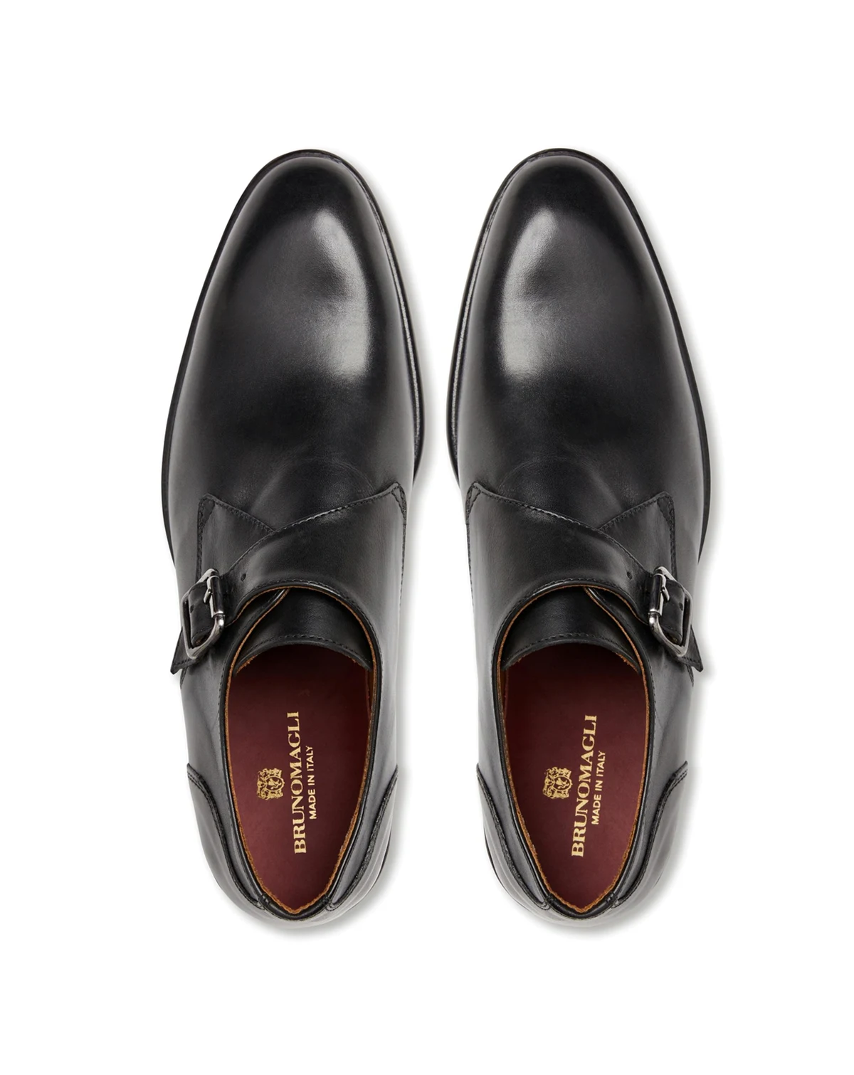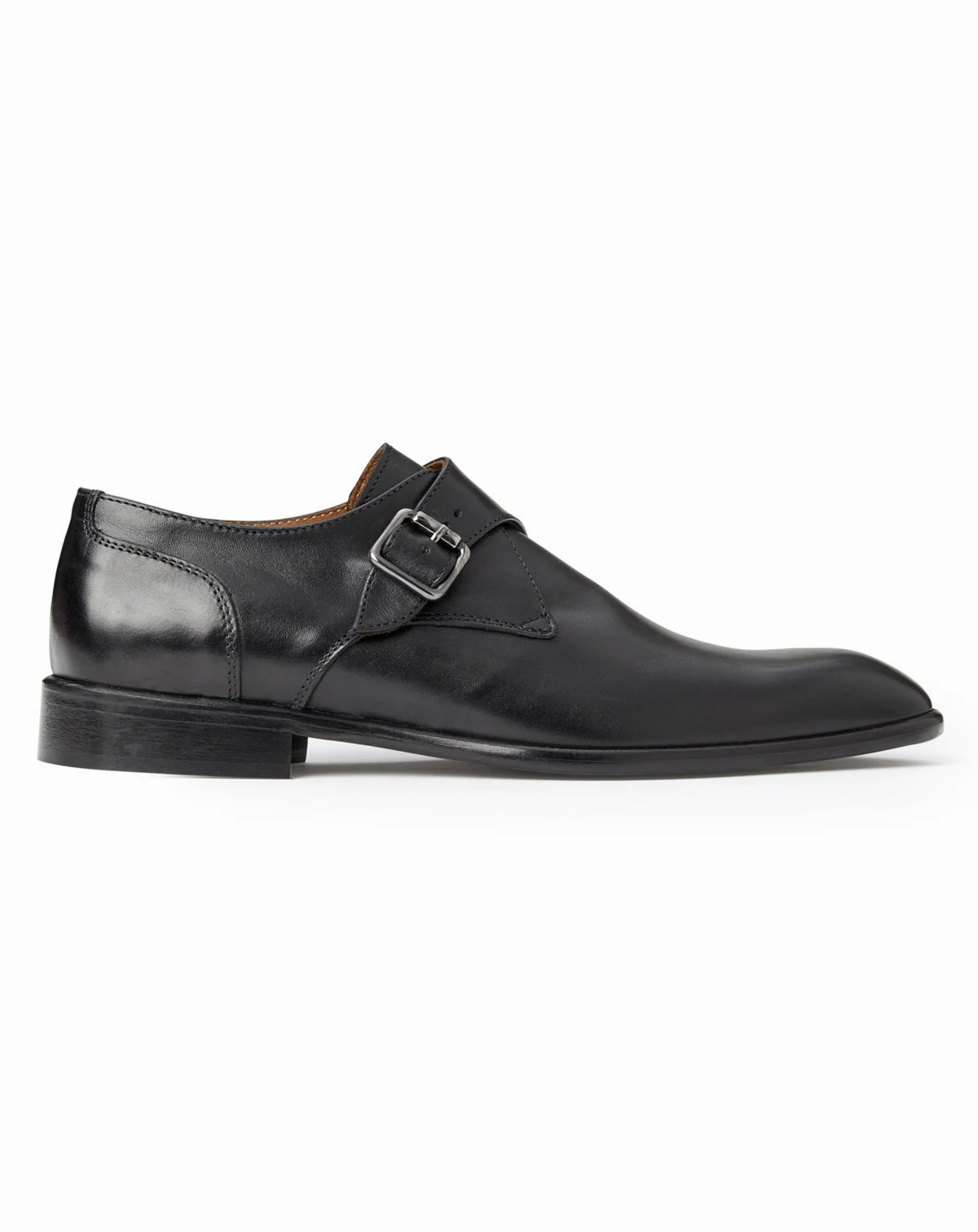 Single classic monk strap construction. Handed buffed leather upper construction. Outsole consists of both leather and rubber combination for durability.