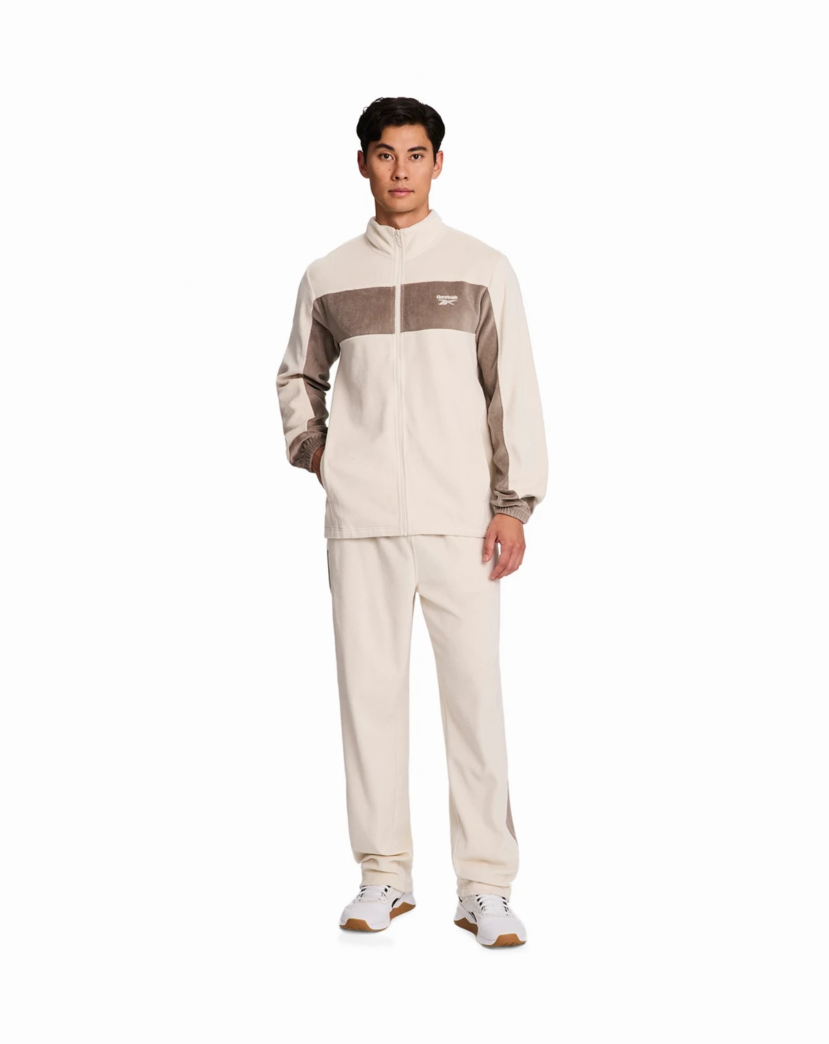 Display your sporty side by wearing this velour jacket by Reebok, featuring long-sleeves and elasticized cuffs. An embroidered stacked logo on the left chest and an enamel-coated zipper add distinct brand details.