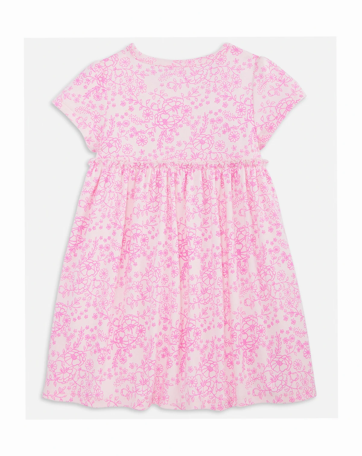 Celebrate springtime in this linear flower printed dress from First Impressions, showcasing a delightful floral pattern. A crewneck and short sleeves provide a comfortable and breathable fit for active toddlers.