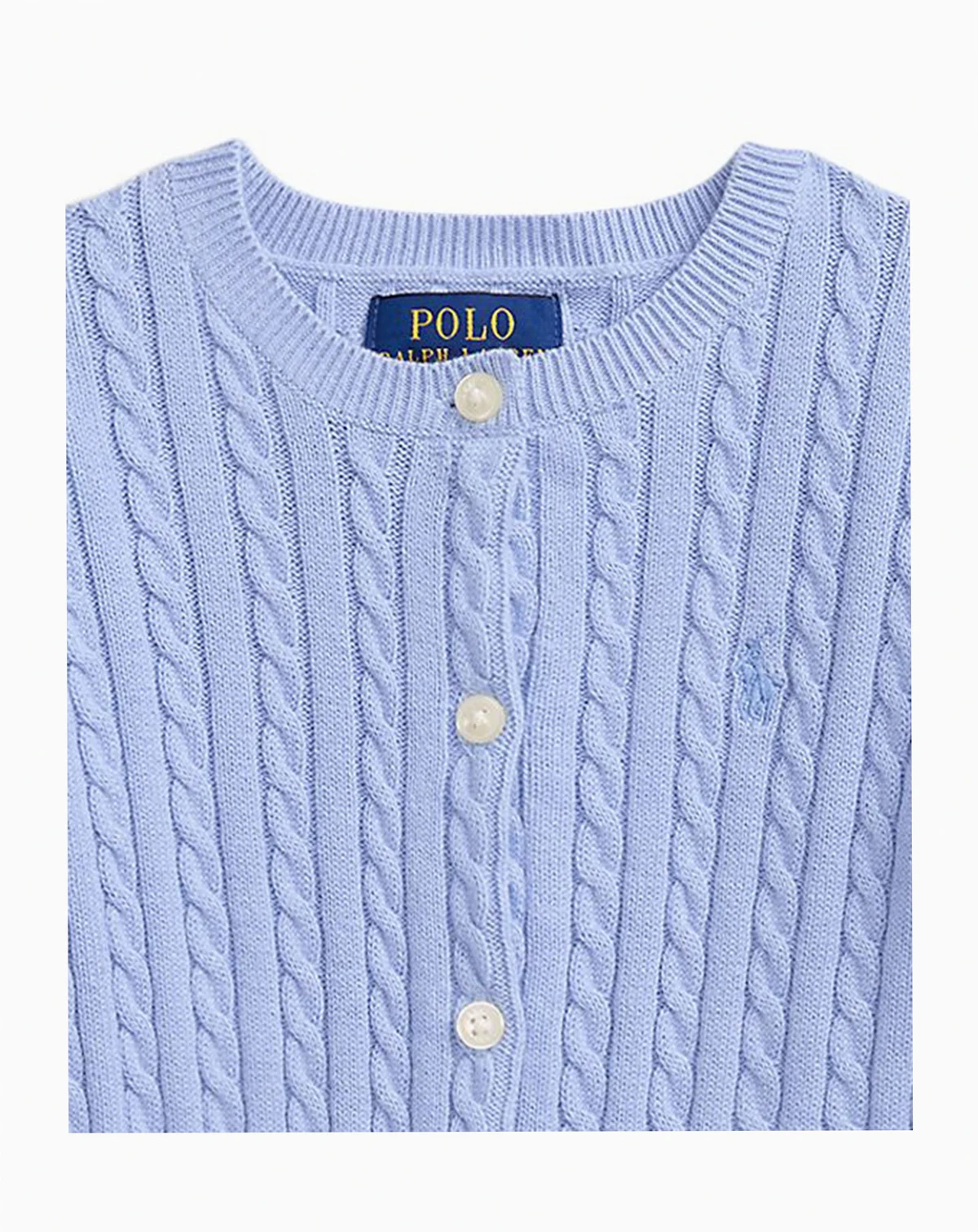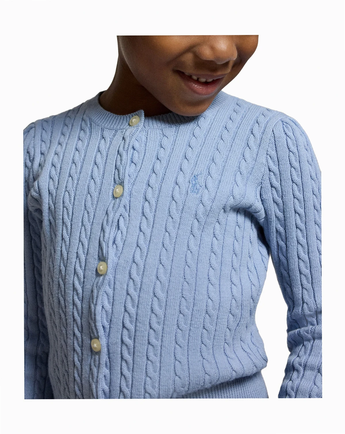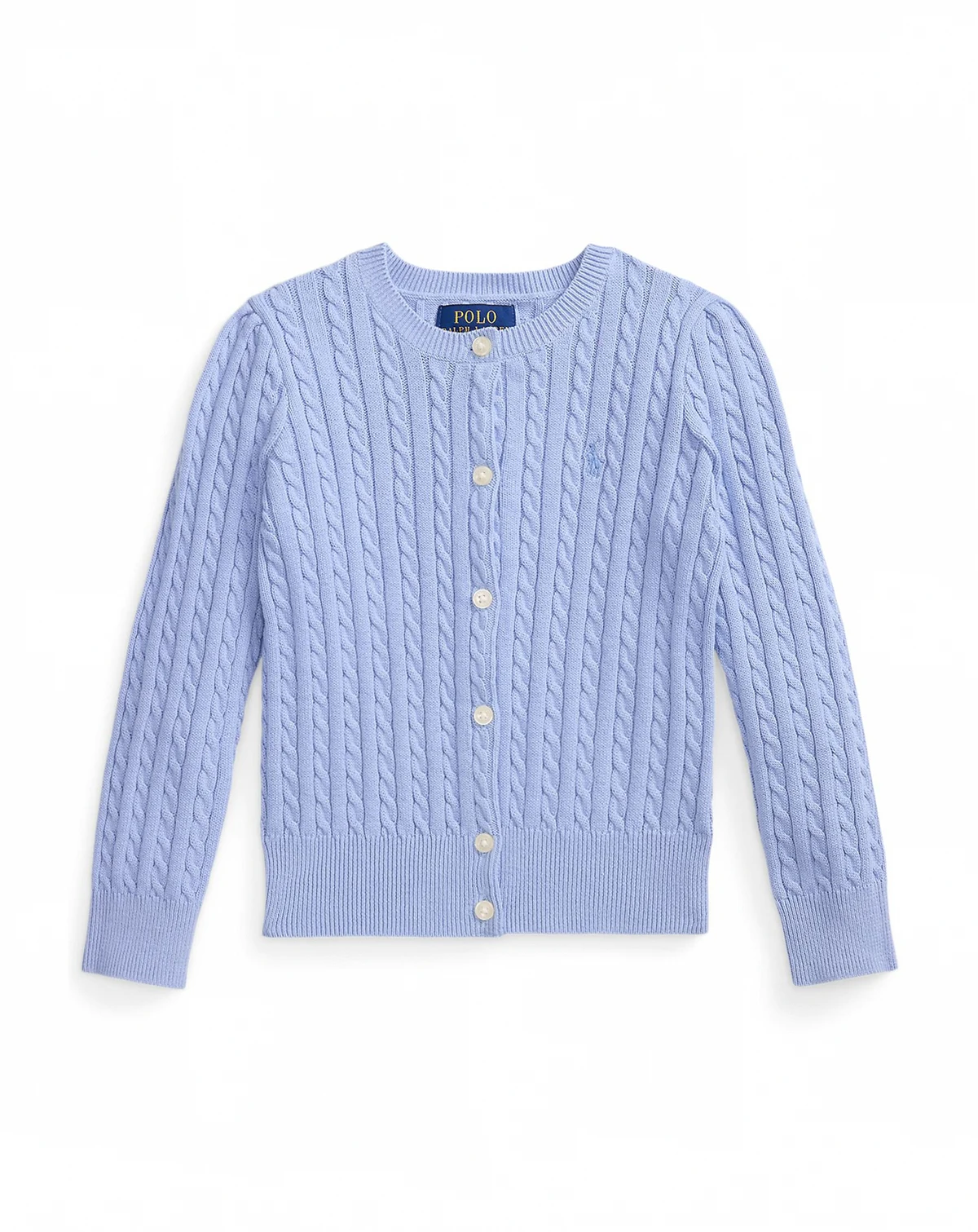 Button up for cute comfort in this Polo Ralph Lauren cardigan, featuring a charming mini-cable design. With long sleeves and a classic silhouette, it's a sweet, season-spanning layer she can wear.