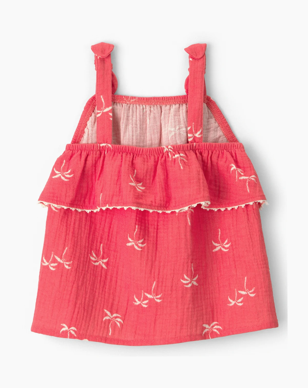 Dress your little one in effortless comfort with this delightful tank top. Made from lightweight gauze, it's perfect for warm days, allowing breathability and ease of movement. The charming palm tree microprint adds a touch of fun, while the ruffled design makes dressing a breeze. Ideal for playdates or family outings, this piece combines fashion and functionality for both kids and parents. A must-have for every toddler's wardrobe.