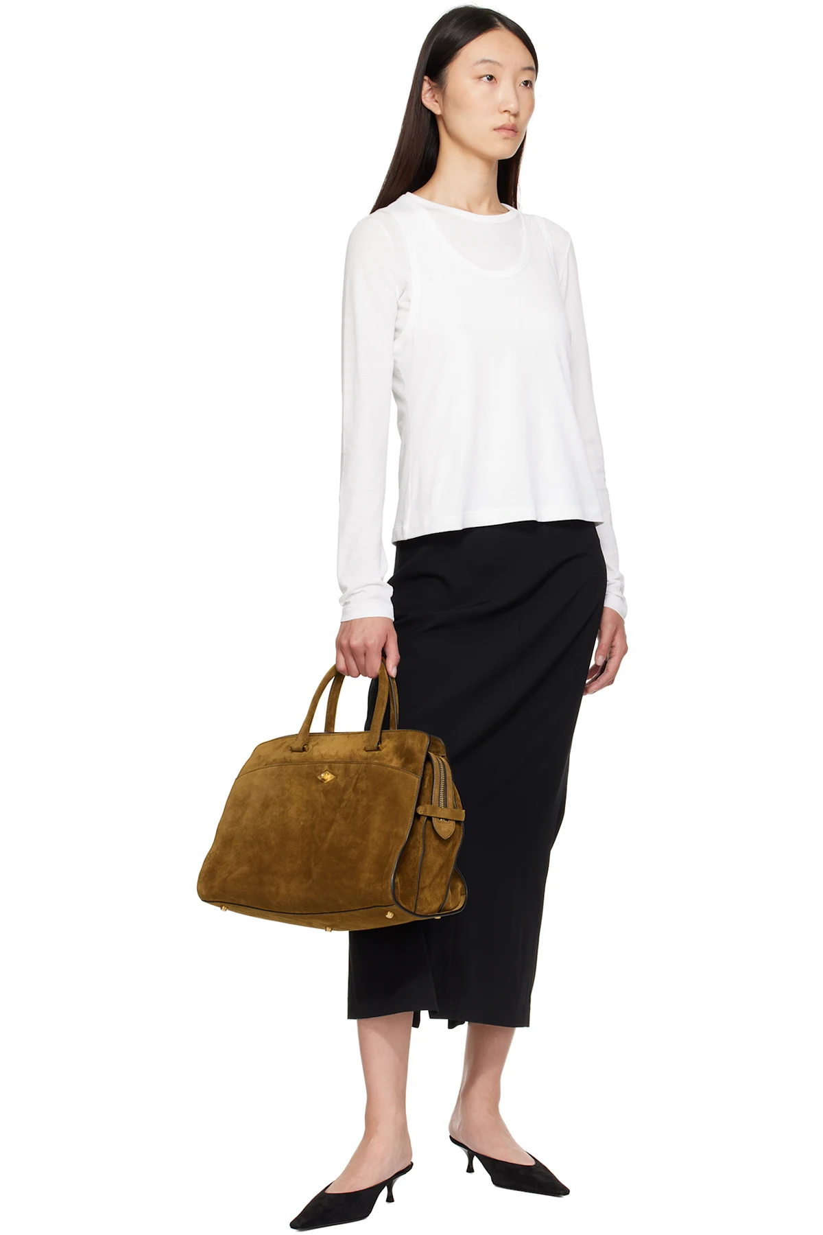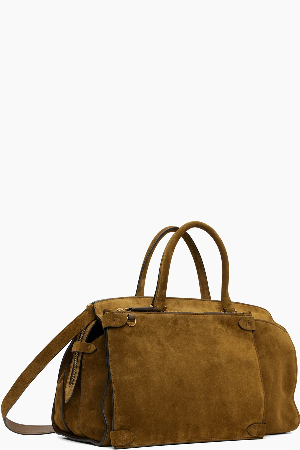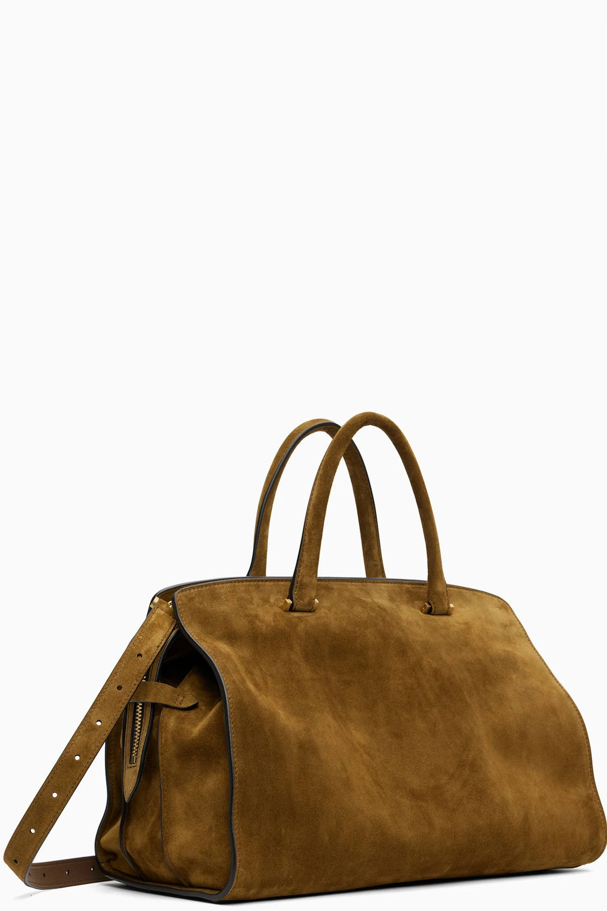 Calfskin suede carryall tote. Detachable interior-compartment divider converts to crossbody pouch.