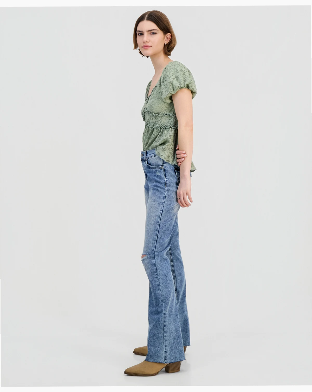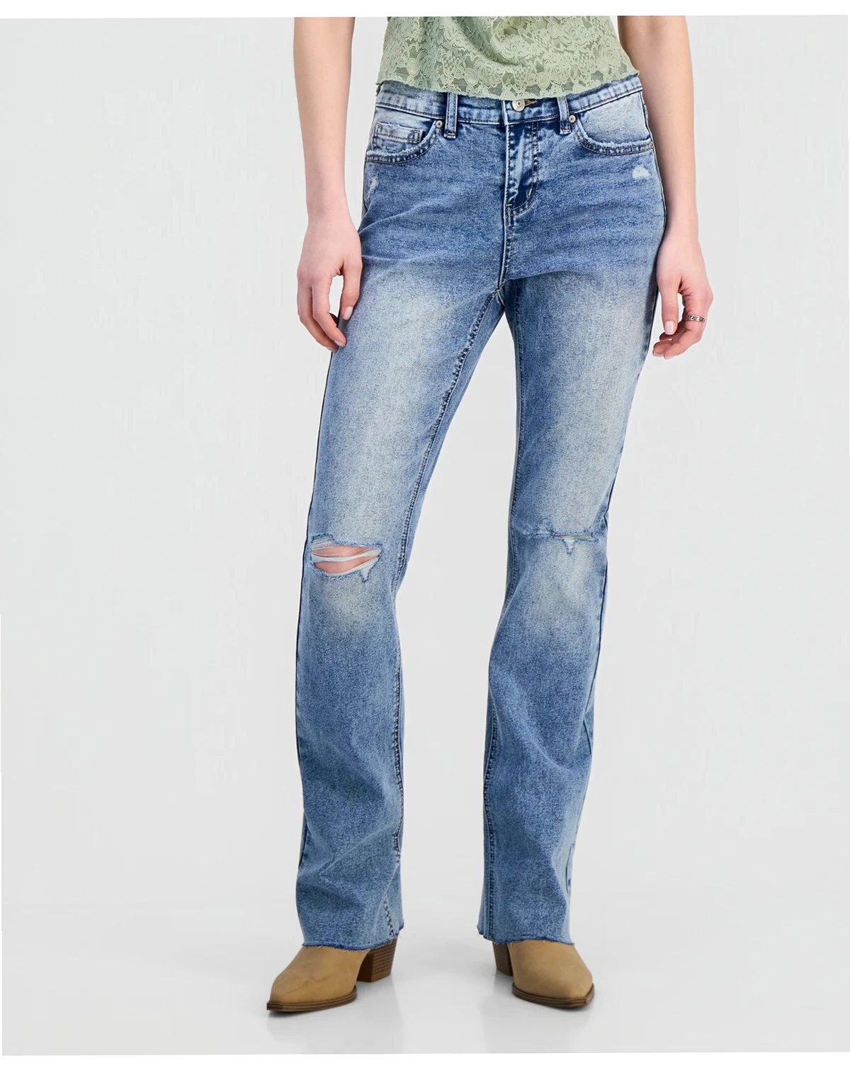 Machine wash; Whiskered and faded wash; scattered distressing throughout; ripped at leg