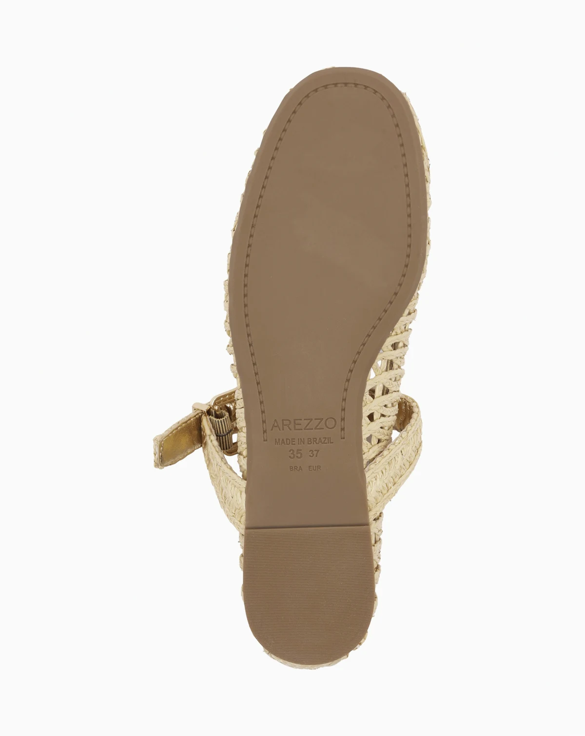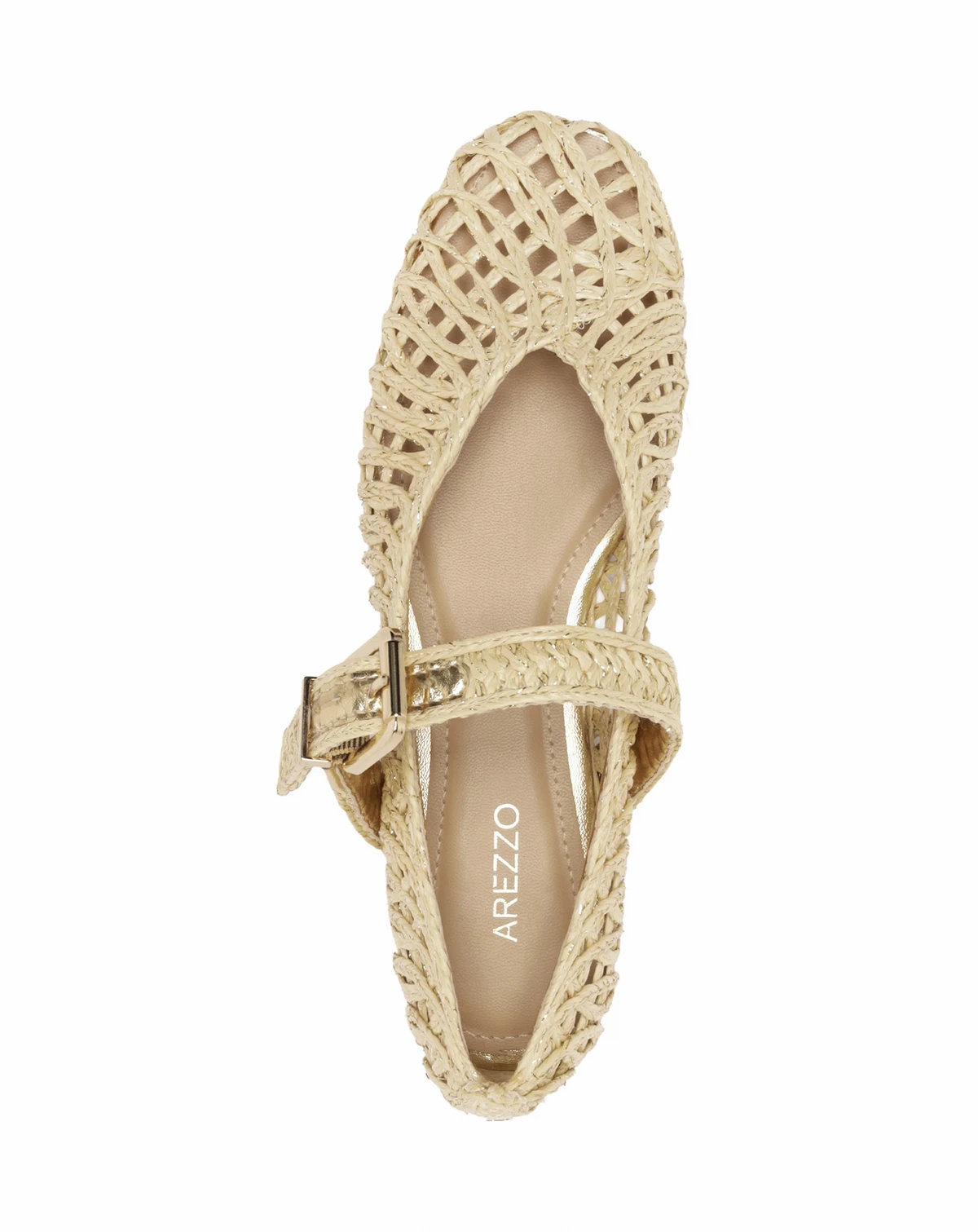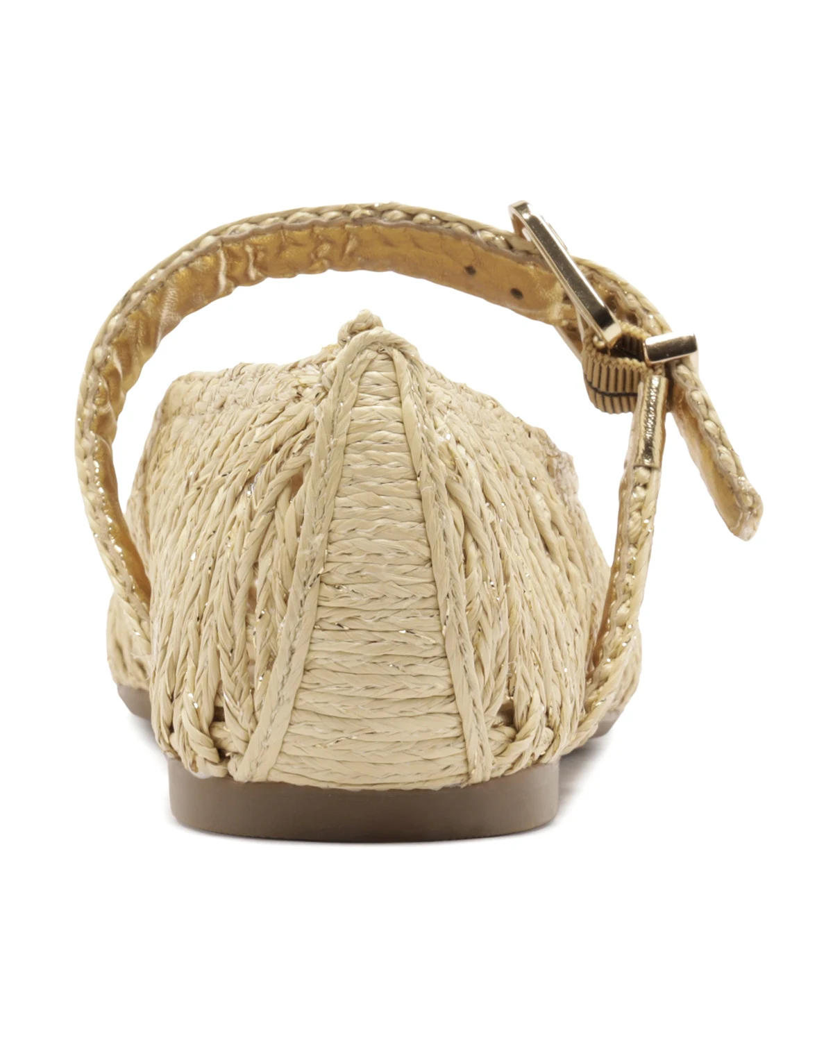A delicate dance of texture and shimmer. Crafted with natural material with golden threads throughout, the Ciara Ballet brings timeless charm with a touch of sunlight romance to your wardrobe.