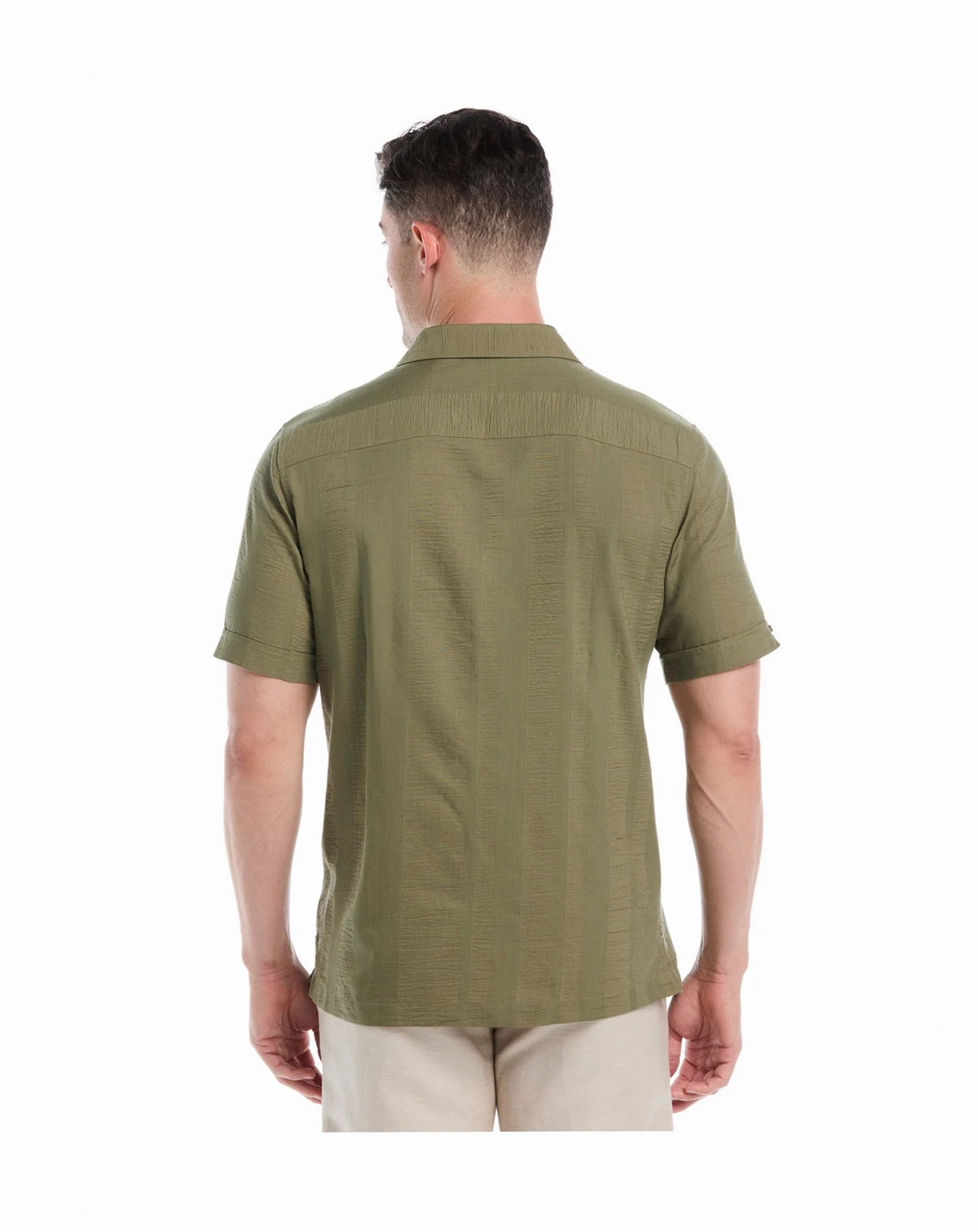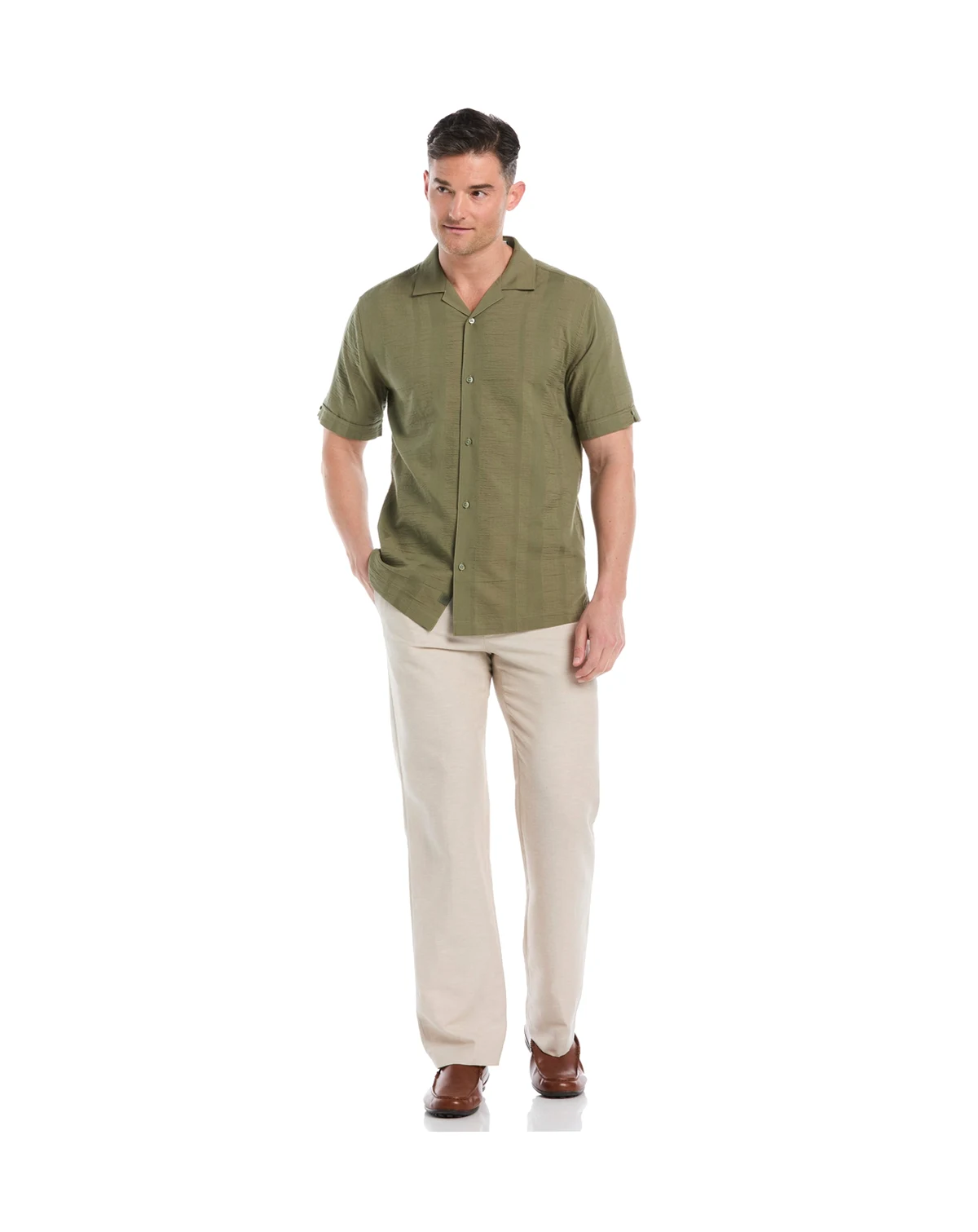 Step up your warm-weather style in this Cubavera button-up shirt, featuring a camp collar that adds a retro edge. The textured stripes provide subtle dimension, pairing easily with shorts or chinos.
