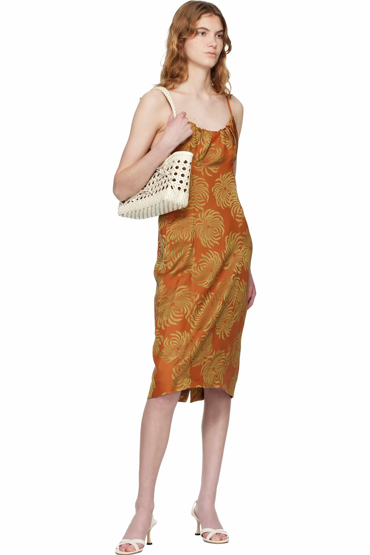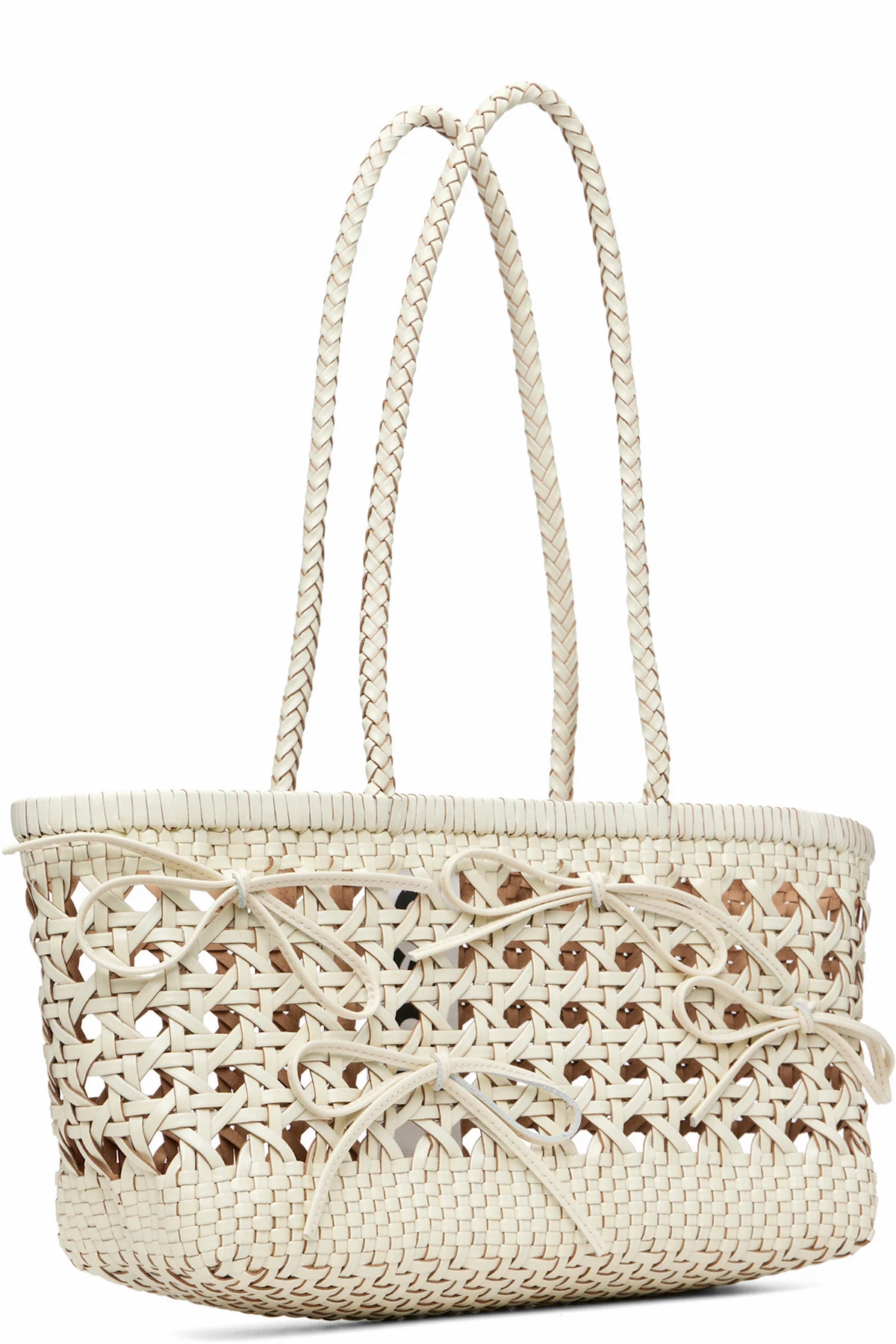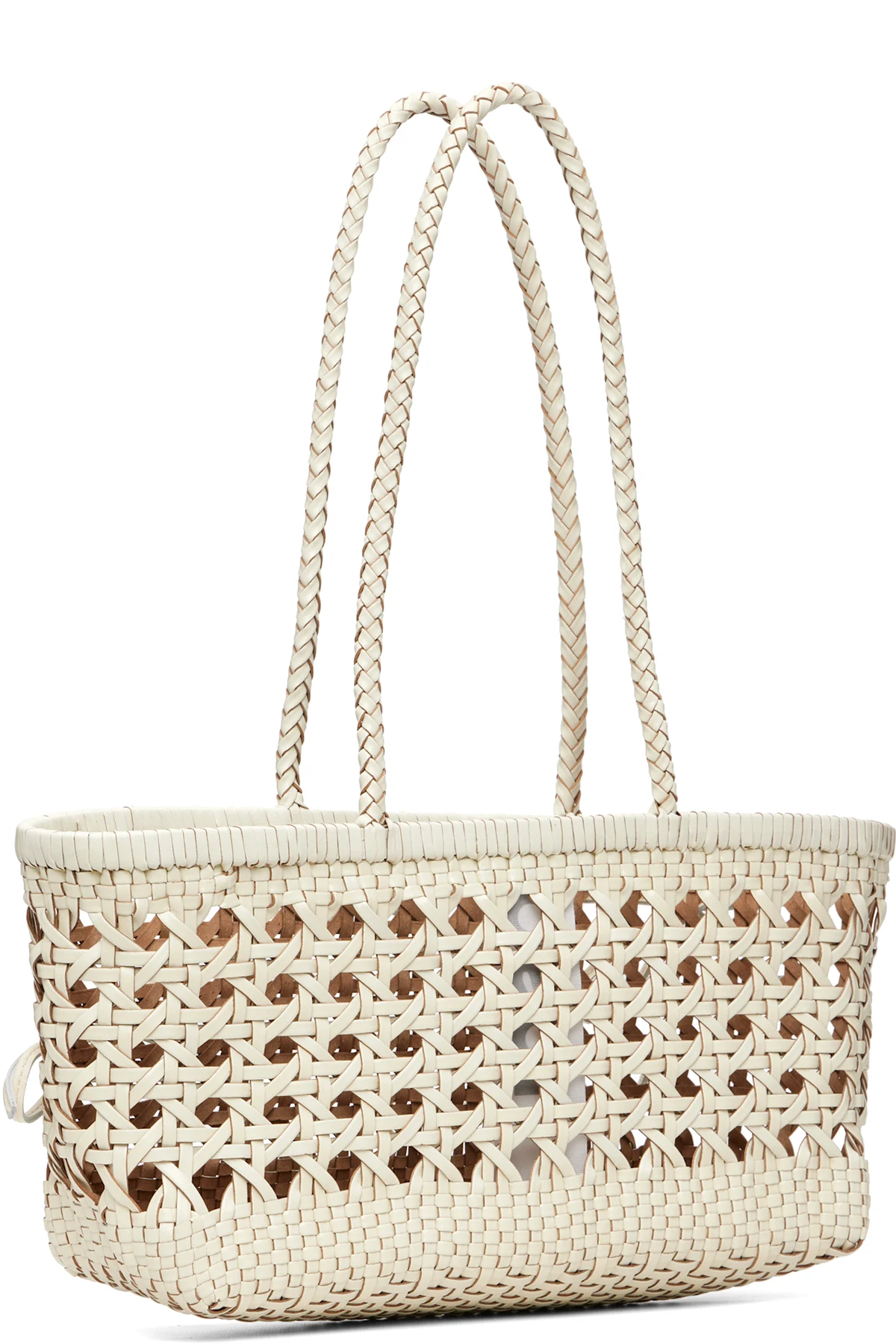 Basket-woven recycled leather shoulder bag.