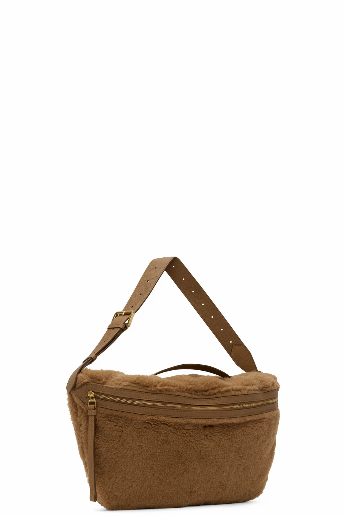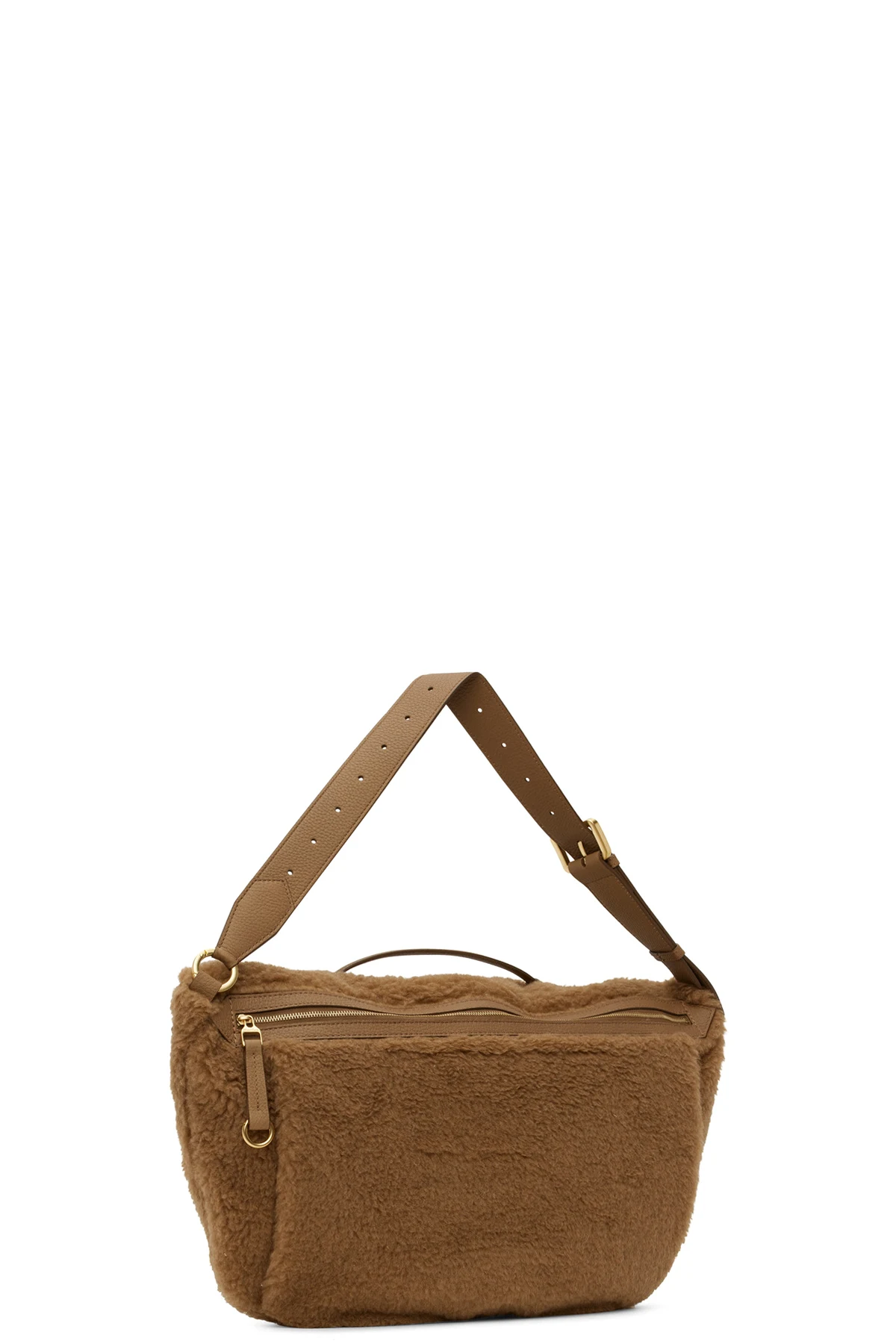 Alpaca, virgin wool, and silk-blend sherpa fleece shoulder bag in brown. Grained deerskin trim throughout.