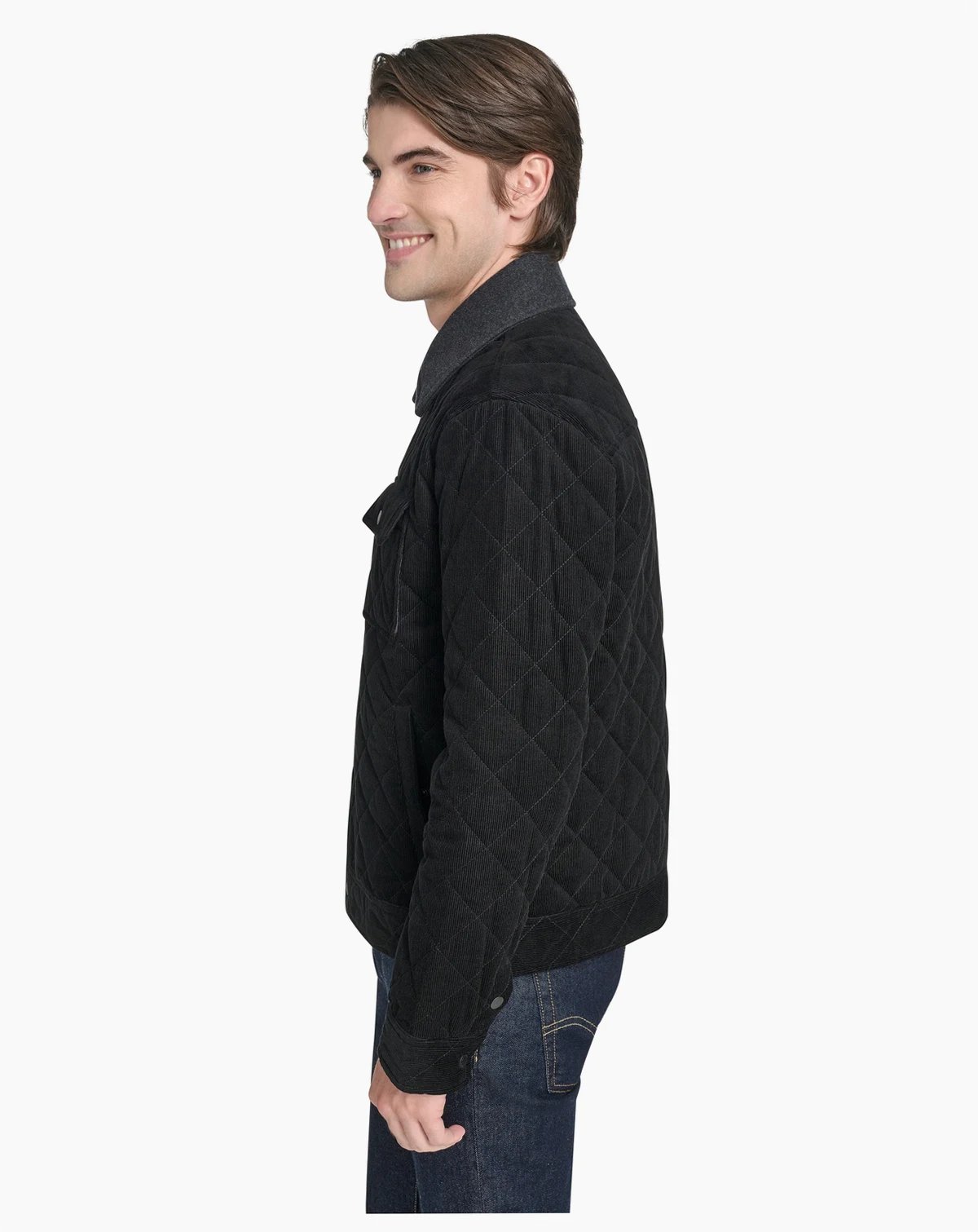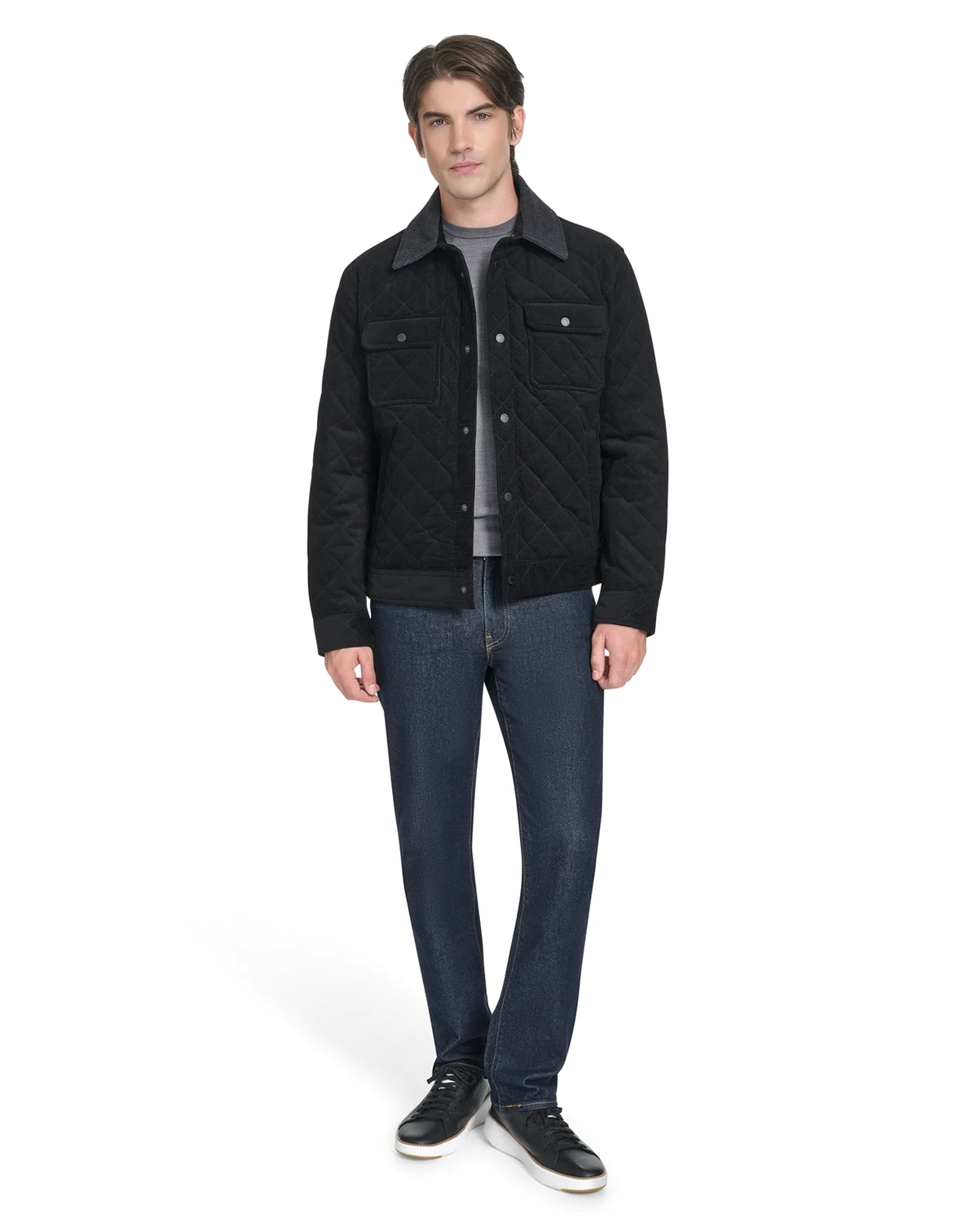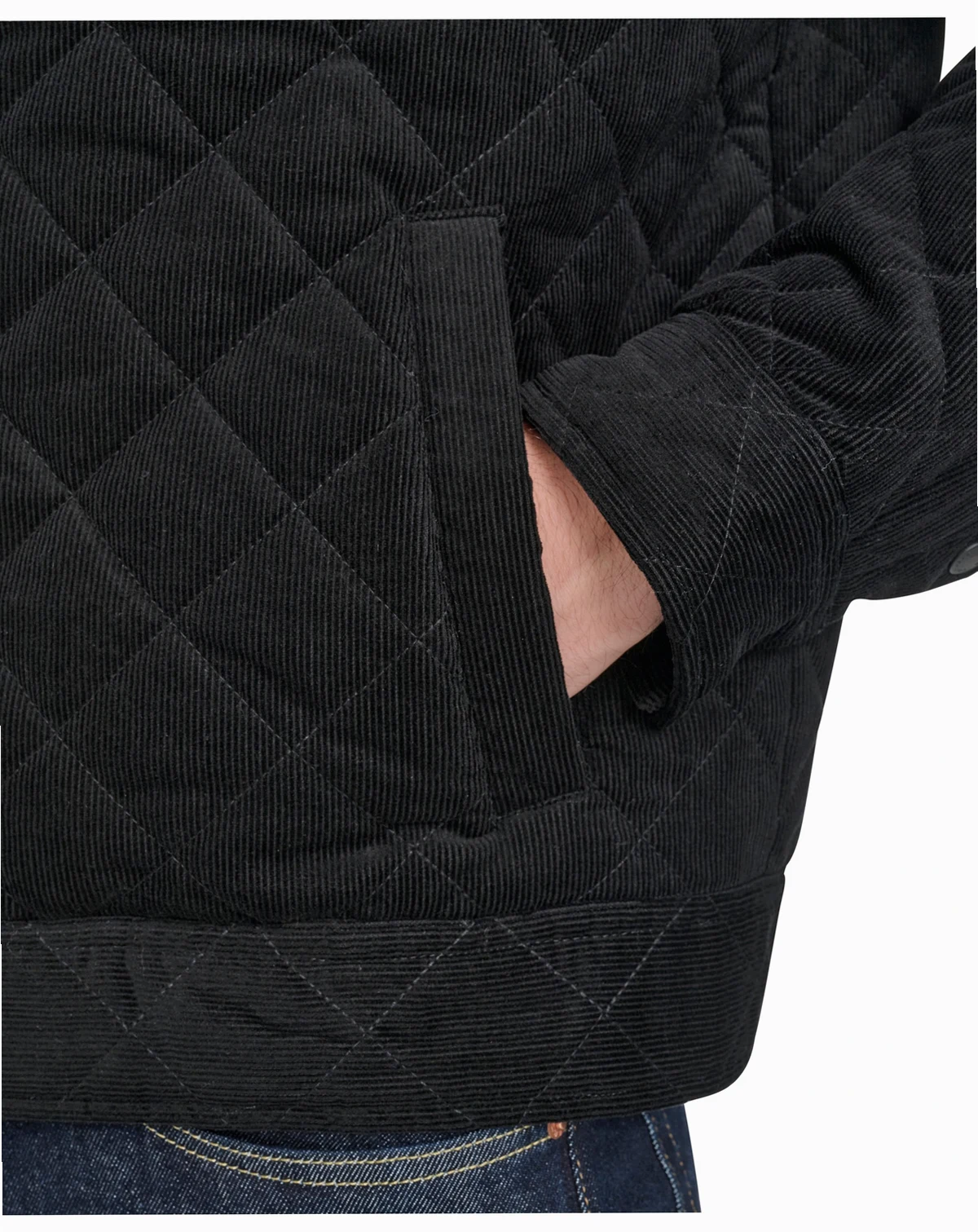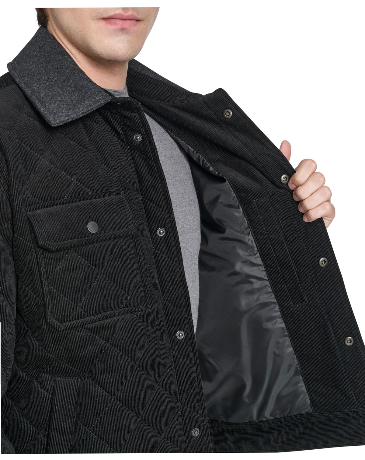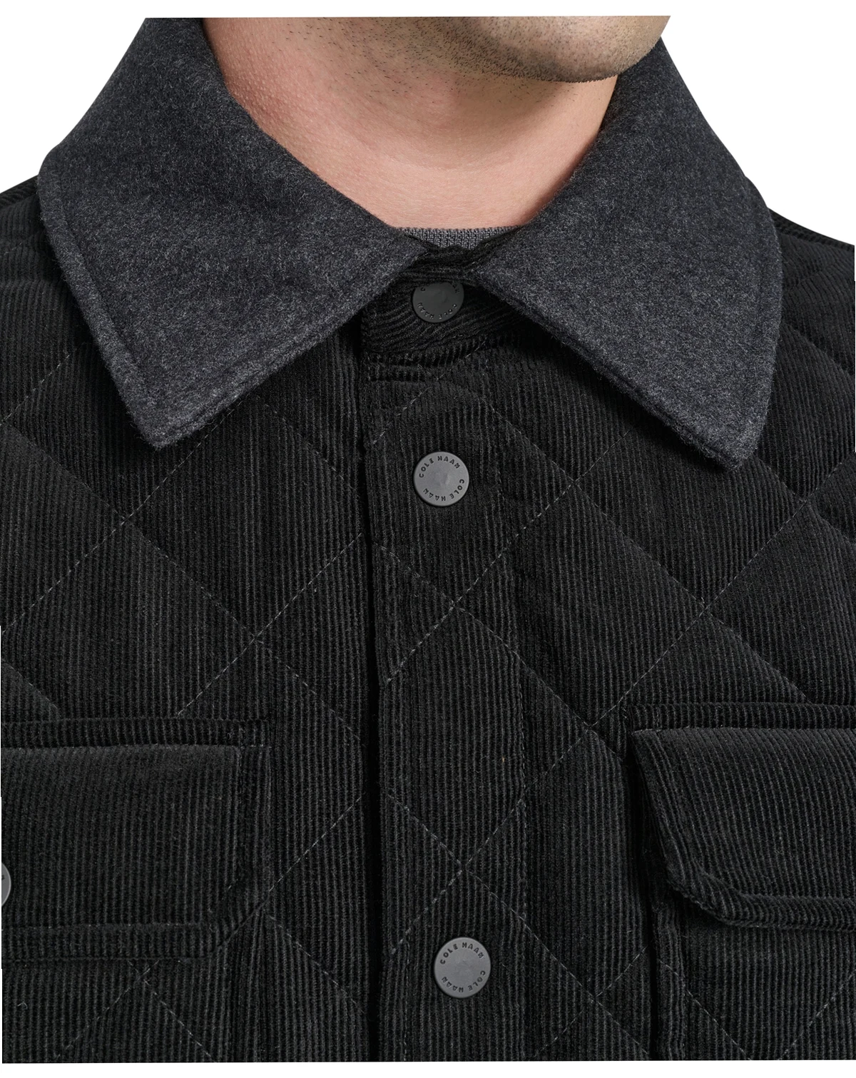 Step up your style with this diamond quilted corduroy jacket from Cole Haan. Crafted with precision from premium corduroy, it boasts chest patch pockets, welt body pockets, and a sleek snap closure for a contemporary edge.
