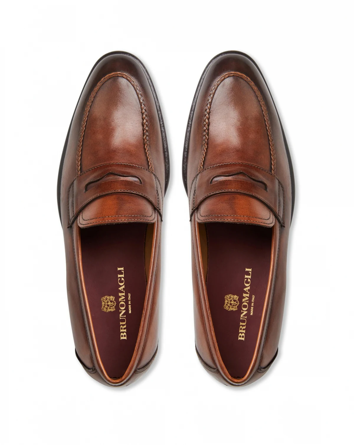 Presenting our newest loafer, meticulously crafted with a contemporary reinterpretation of its silhouette. Hand-burnished to achieve an antiqued effect, this loafer features premium Italian leather construction. A braided leather wrap on the keeper adds a special touch of elegance. Fully leather-lined and set upon a full leather outsole, it complements the upper and finish for a refined look.