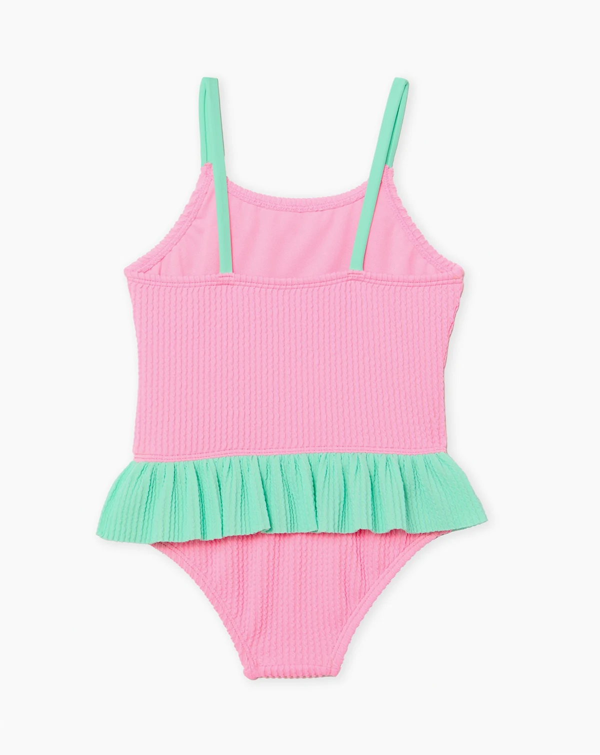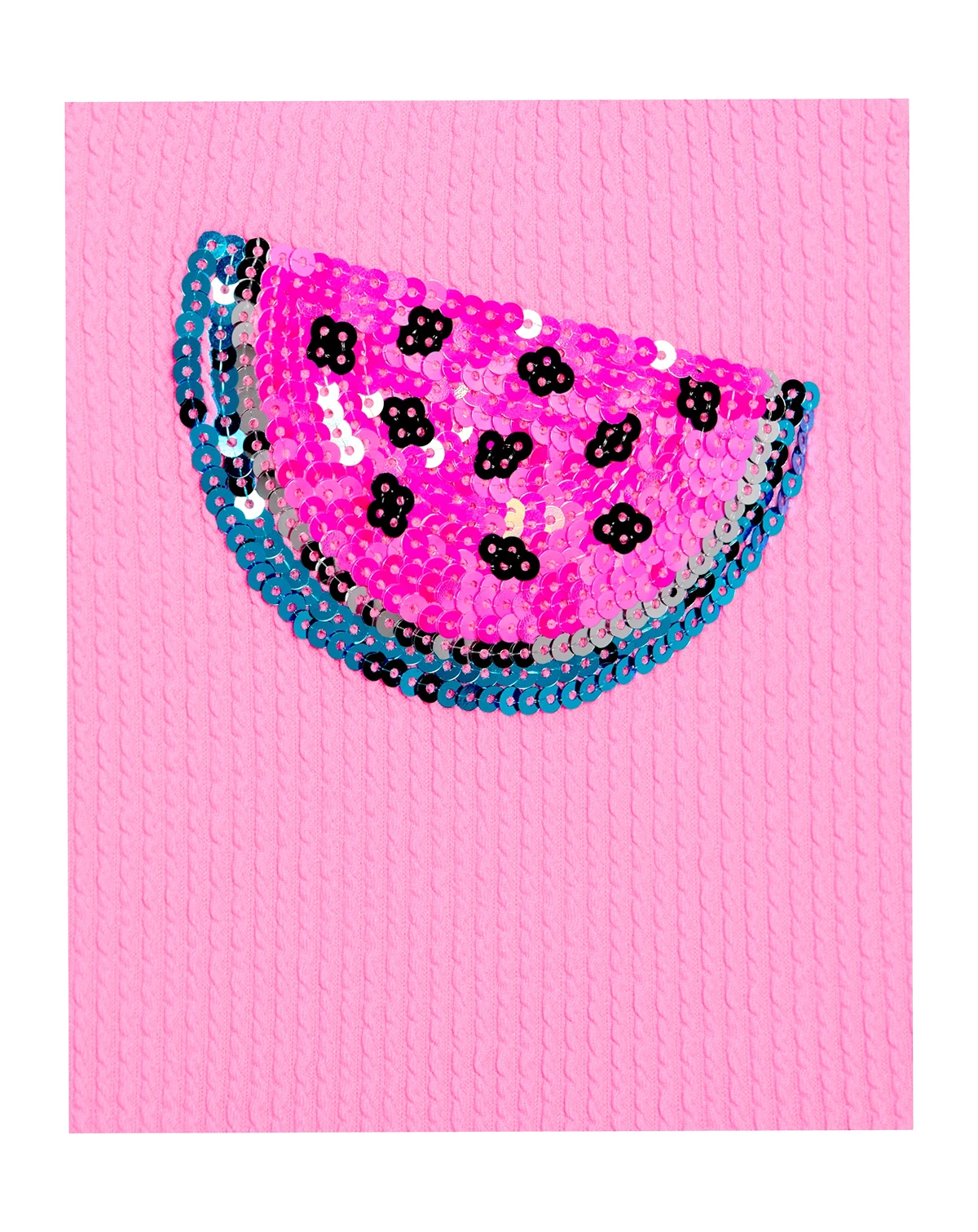Make a sweet statement with a sequin melon applique on this scrunch popcorn texture one-piece swimsuit from Angel Beach, featuring a scoop neck. A ruffle waist and over-the-shoulder straps make it an adorable swim option.