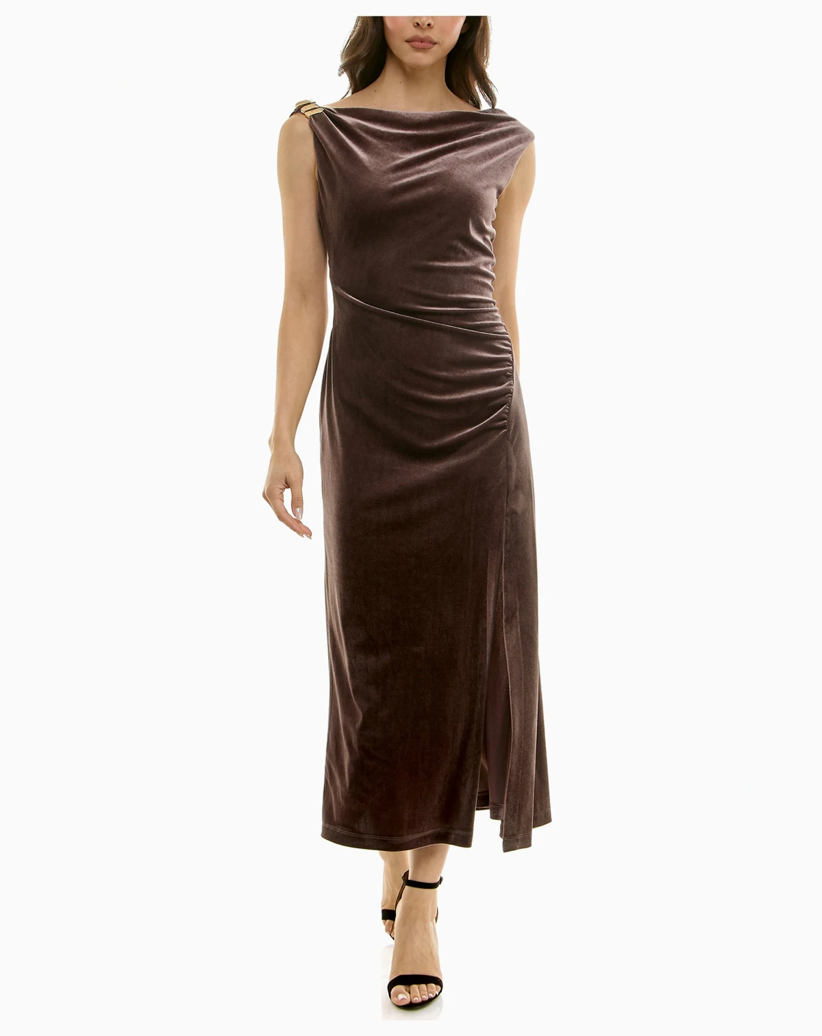 Command attention in this Taylor midi dress, designed with side ruching and a slit that create a stunning, elegant silhouette. The sleeveless cut and a graceful boat neck add to its polished feel, while a chic hardware detail on one shoulder ensures you make a memorable entrance.