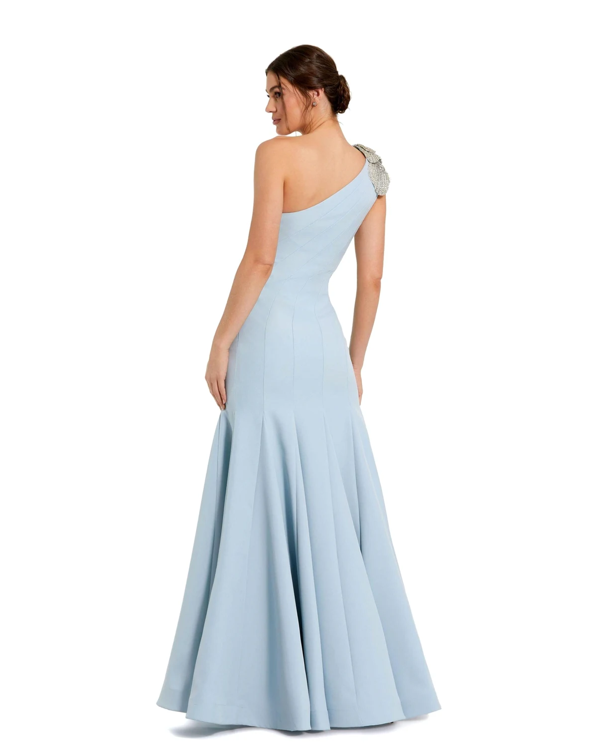 Captivate effortlessly in this crepe one-shoulder gown featuring a sleek asymmetrical neckline and a flattering trumpet silhouette. Designed to highlight your shape with modern elegance, it is an ideal choice for formal events, galas, and special occasions.