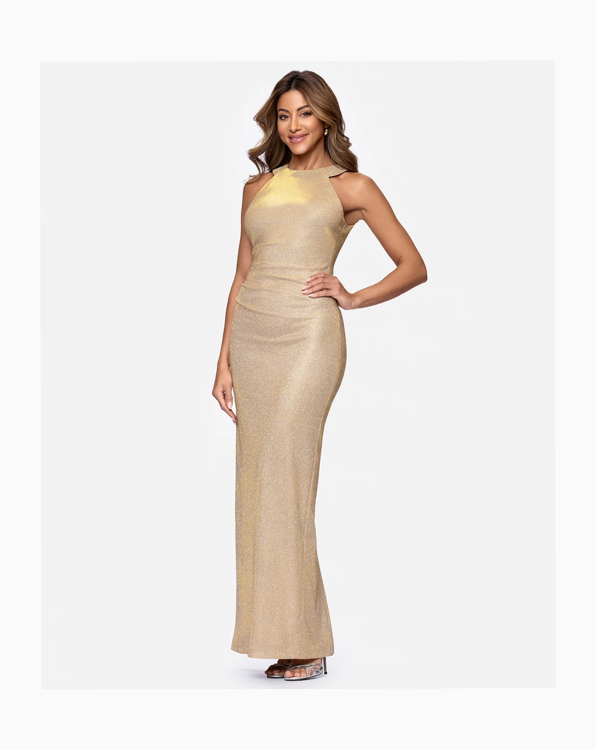 Glimmering with allover glitter, this long halter gown from XSCAPE offers a sheath silhouette for a sleek, modern look. A back zipper closure provides a secure, streamlined fit.