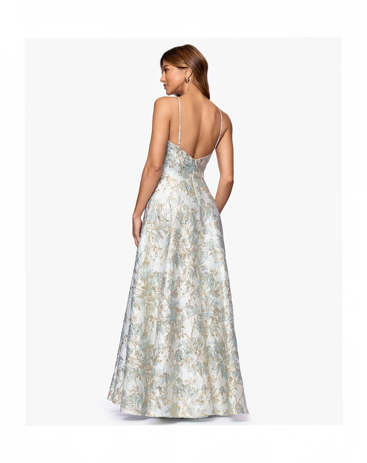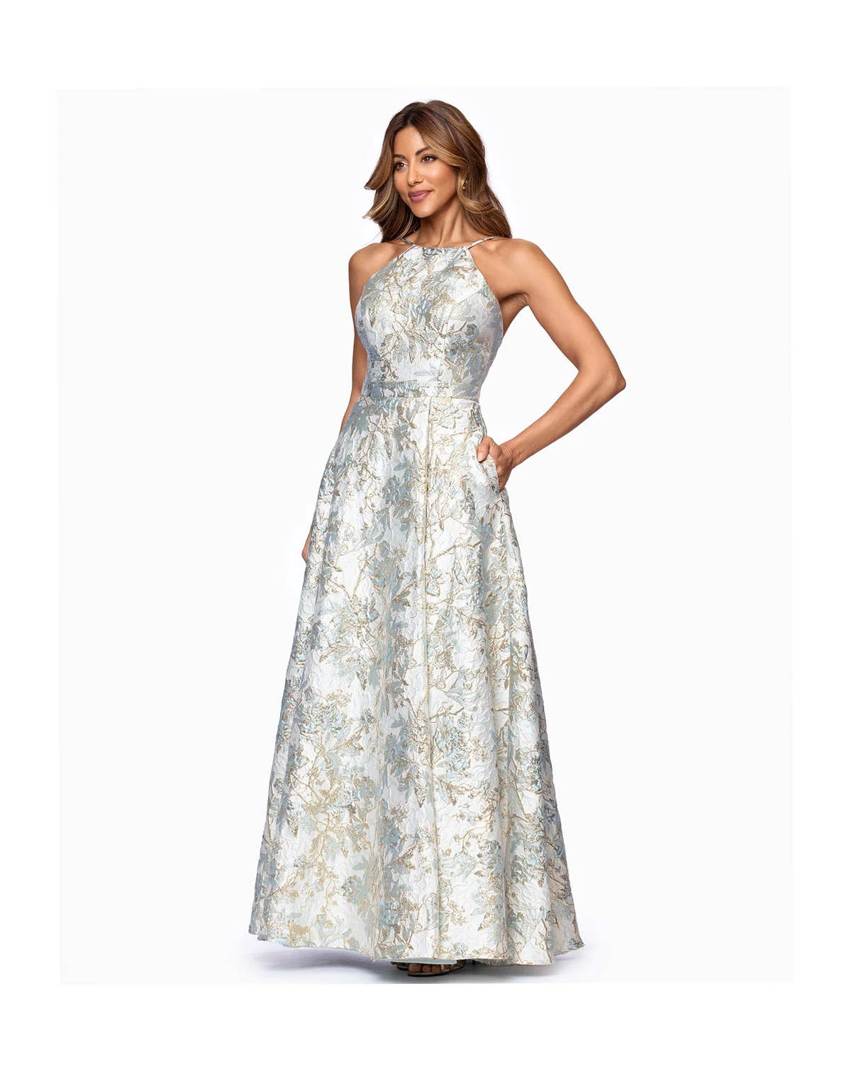 Experience a glamorous style in this long gown by XSCAPE featuring a striking halter neckline. Its elegant sleeveless design creates a memorable look for special celebrations.