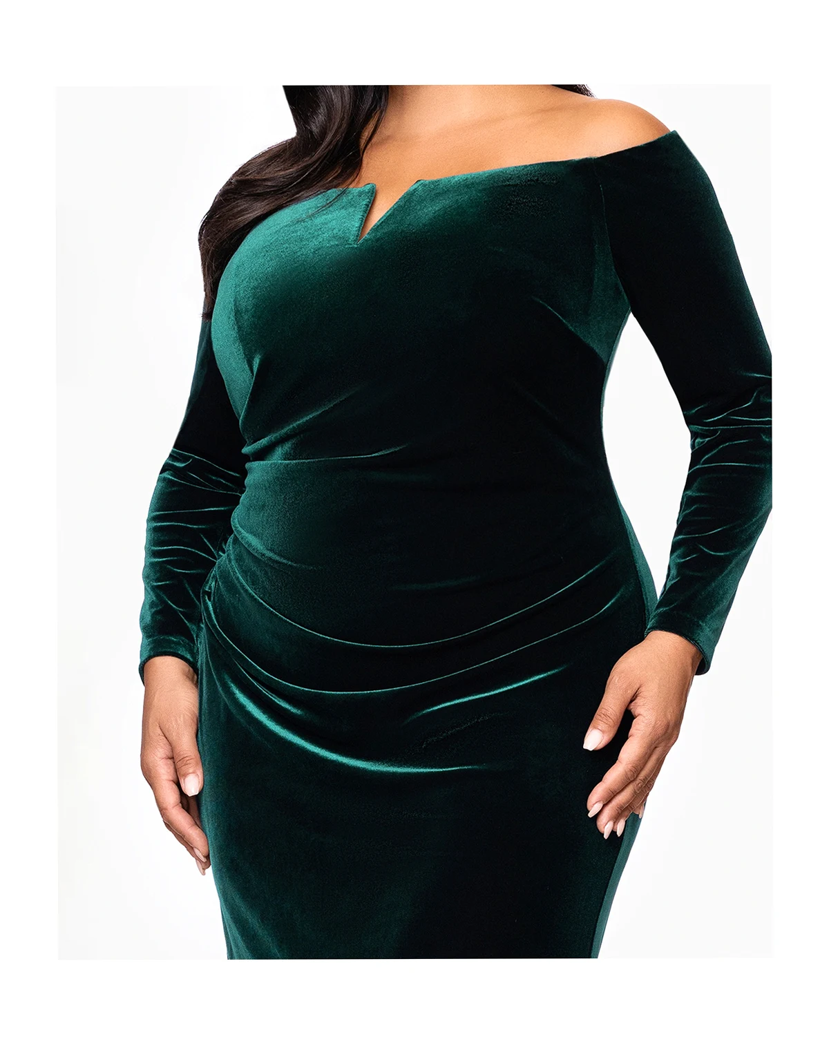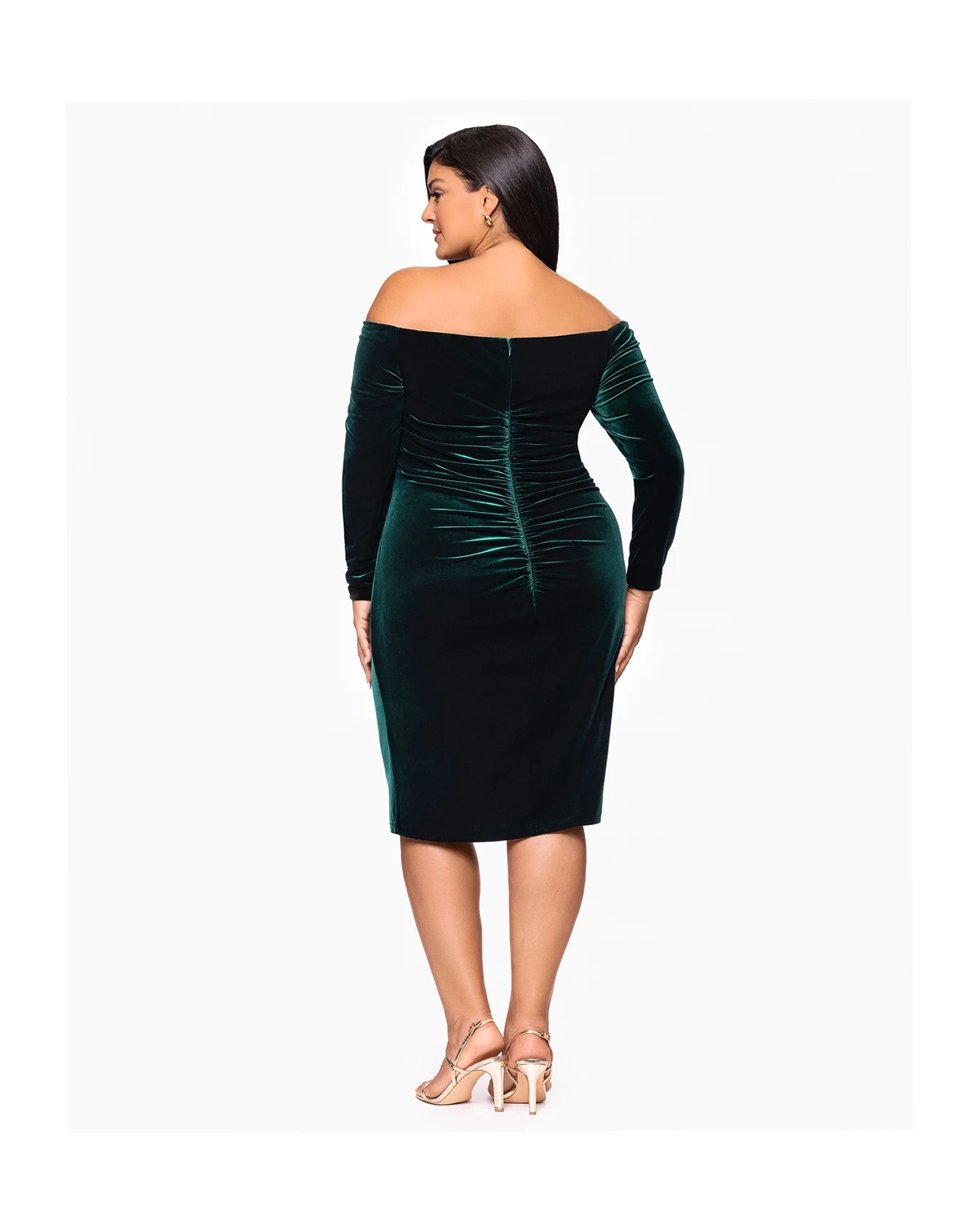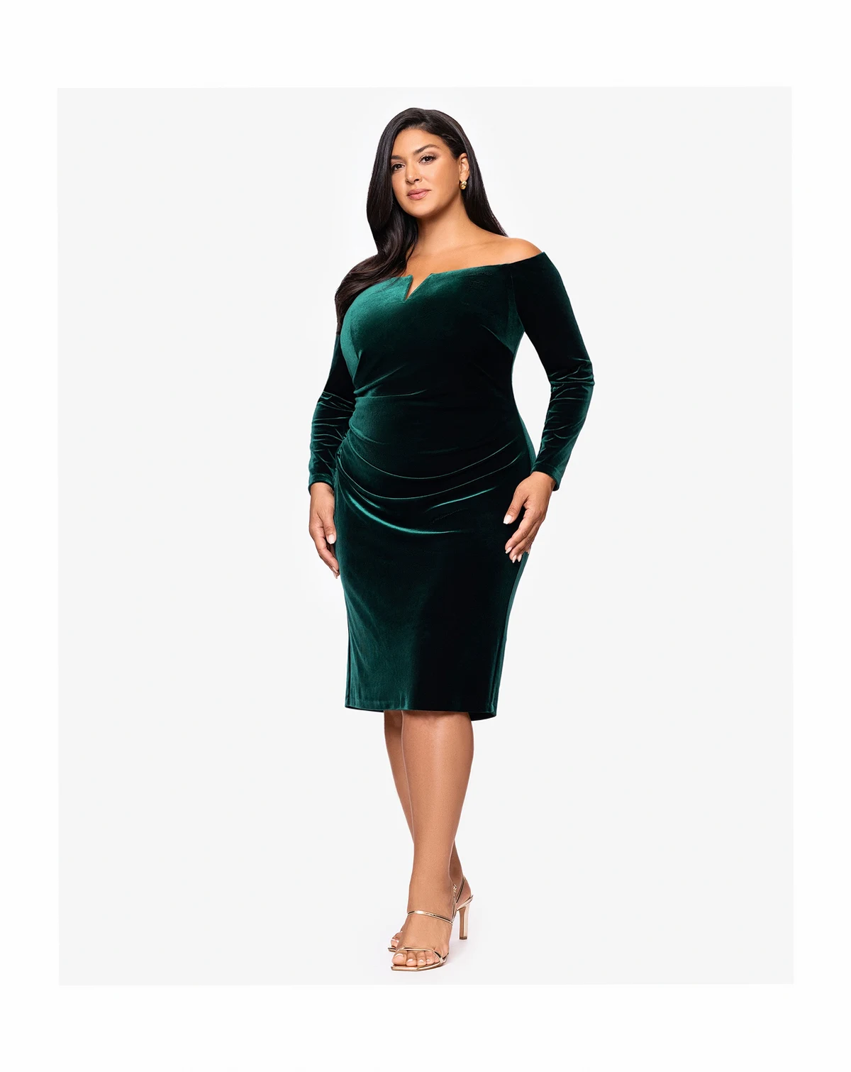 Flaunt your figure in XSCAPE's off-the-shoulder sheath dress, crafted from plush velvet.