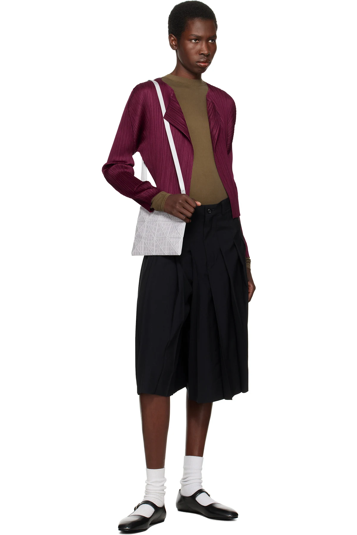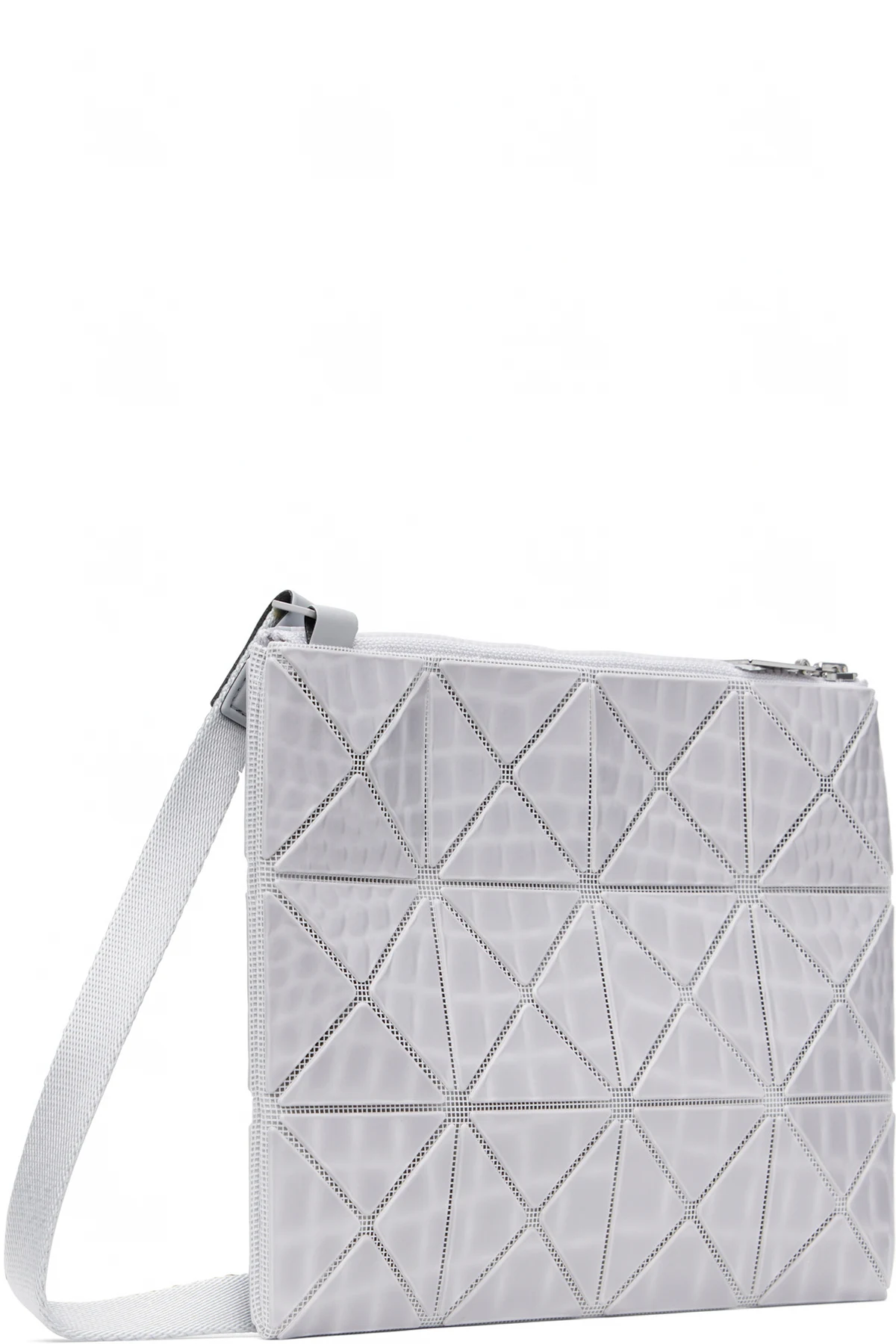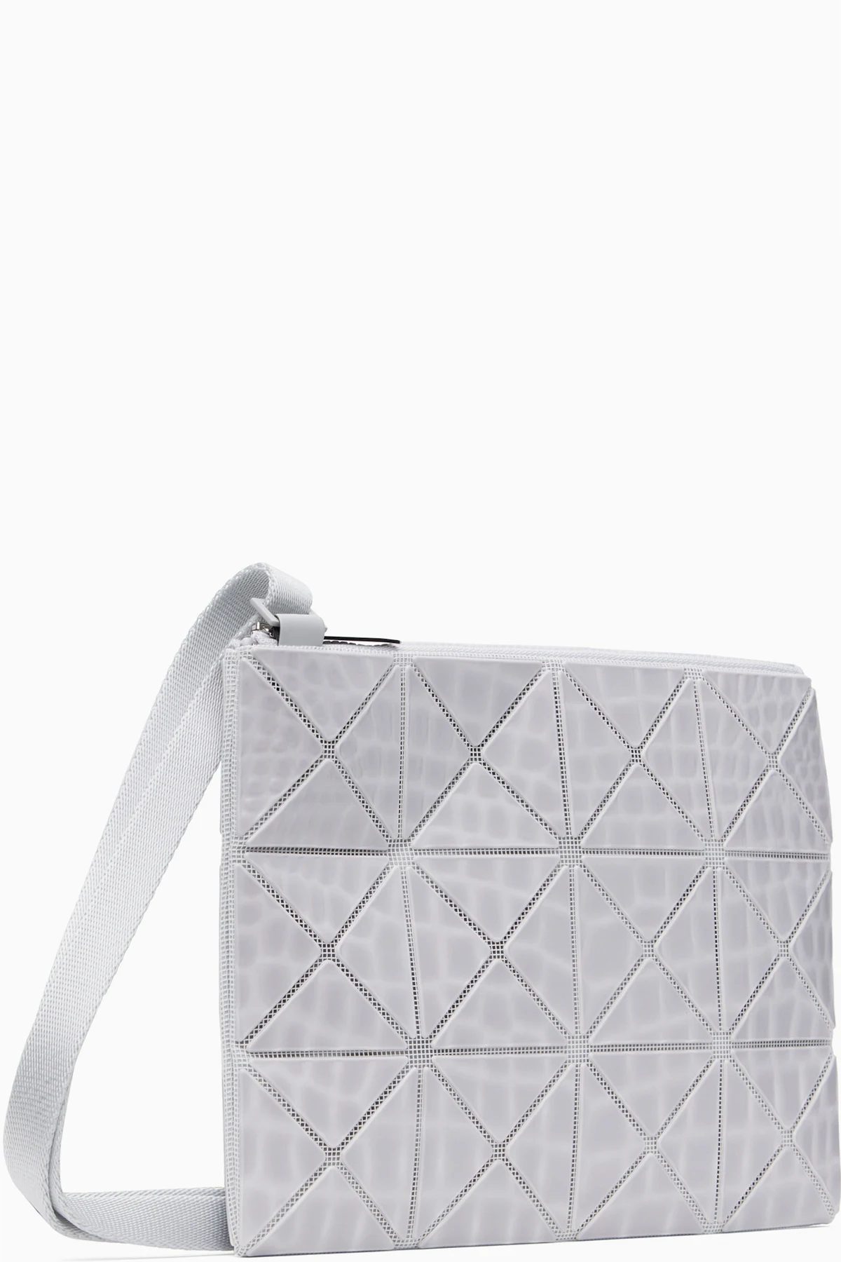 Mesh shoulder bag in white. Croc-embossed signature triangular vinyl appliqués in gray throughout.
