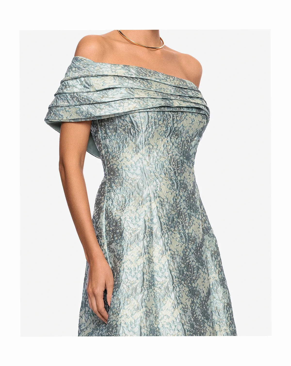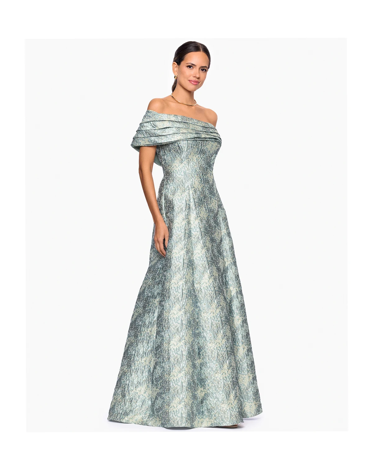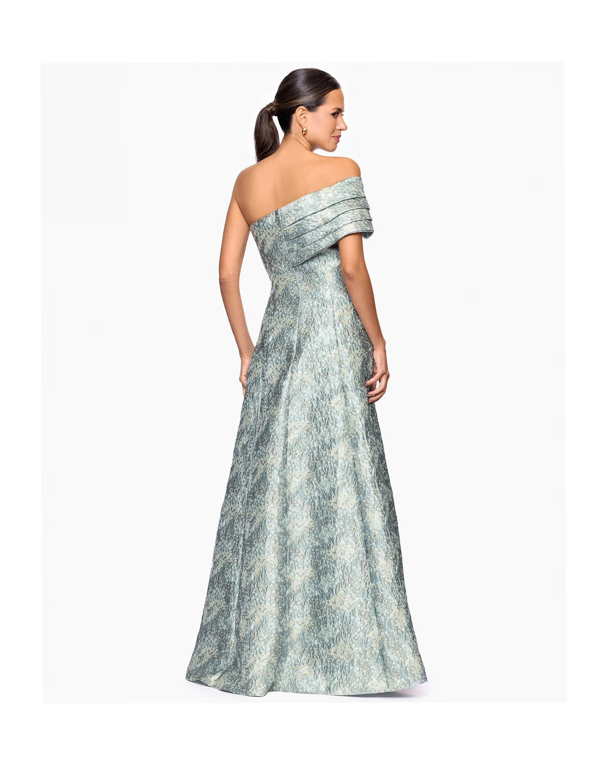 Flowing with an asymmetrical hemline and off-the-shoulder neckline, this long A-line dress by Betsy & Adam creates a striking silhouette. A back zipper ensures a secure and comfortable fit for special events.