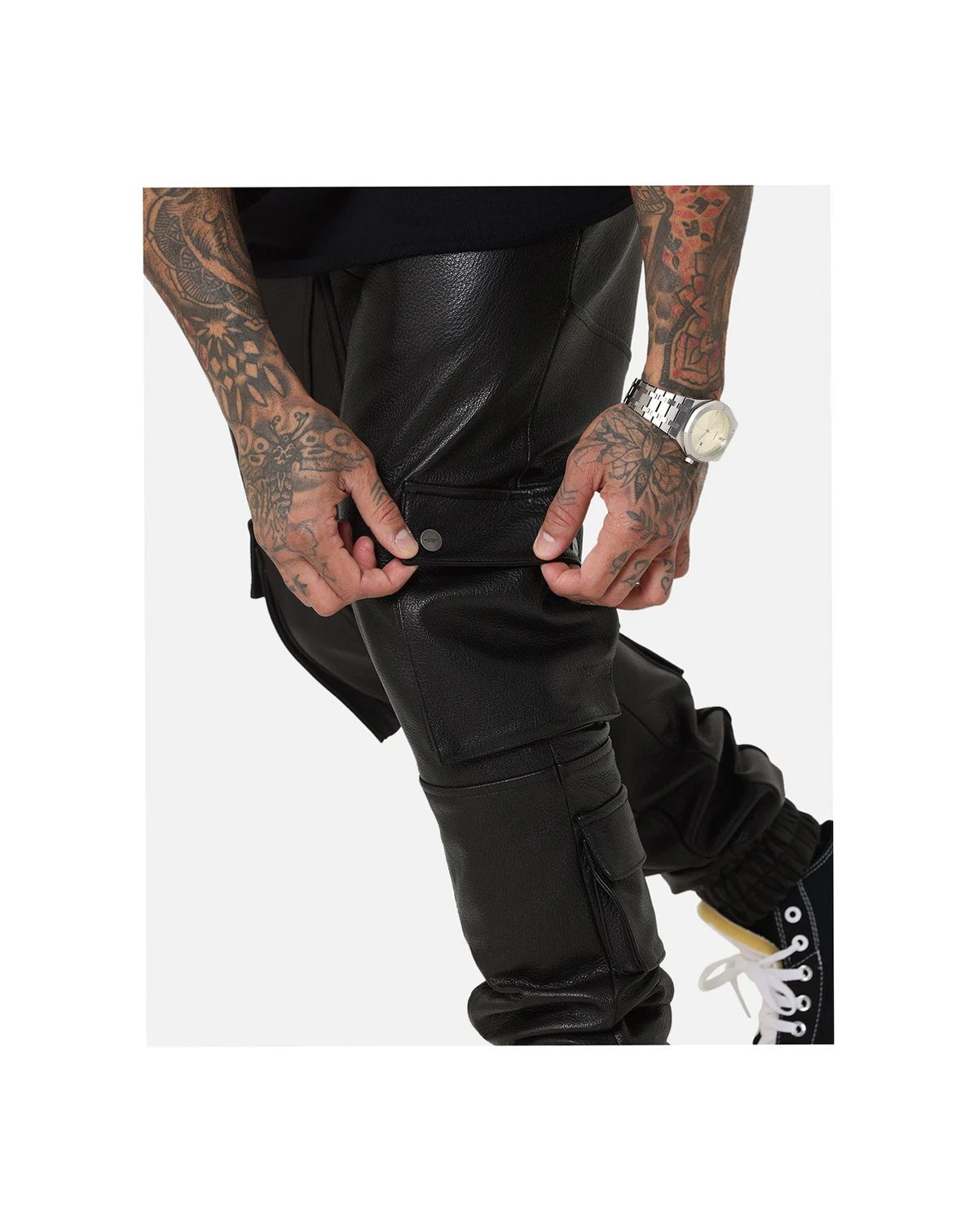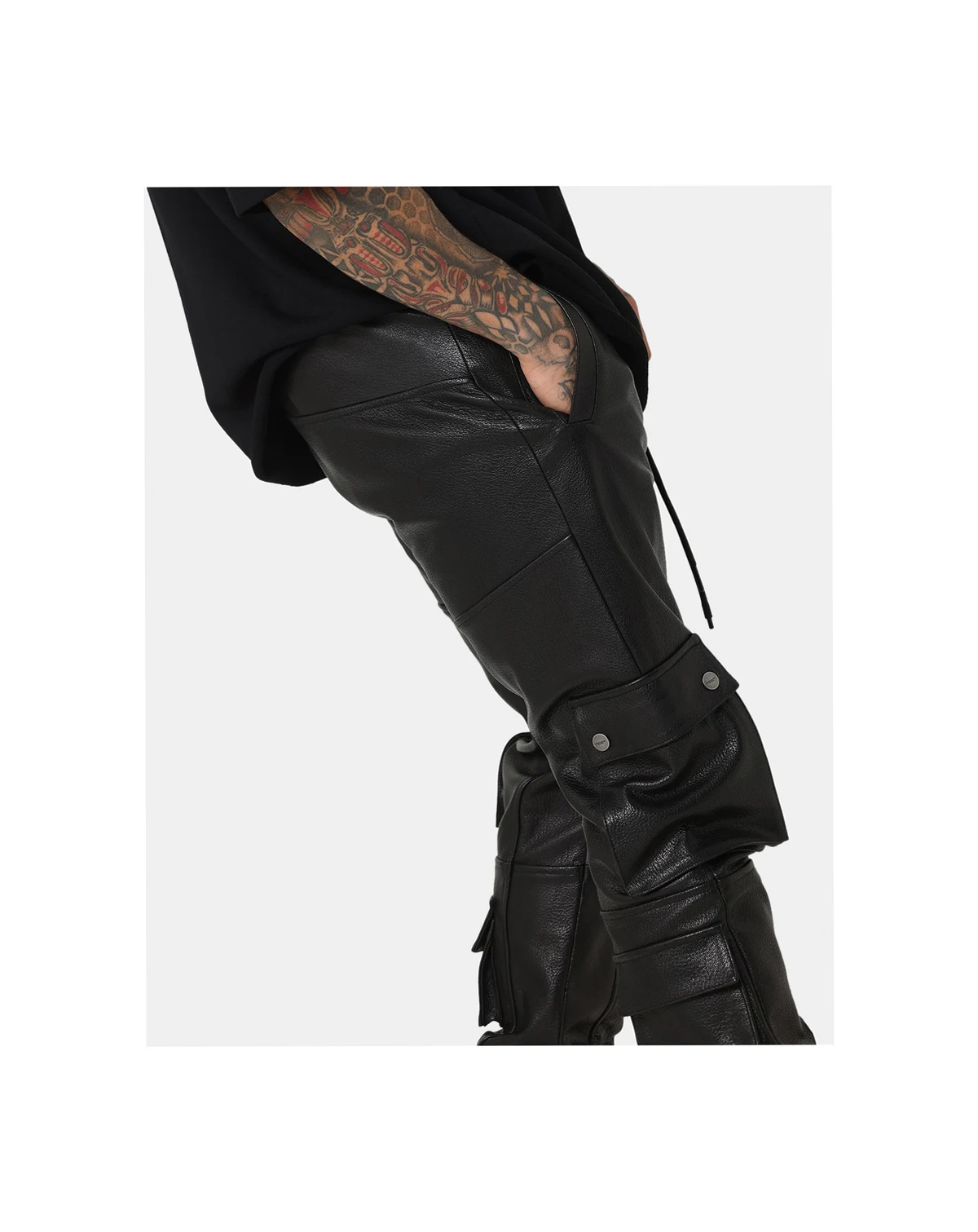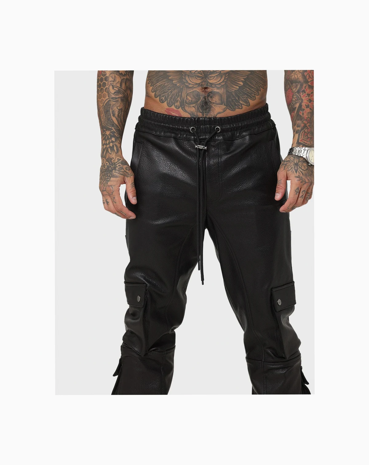 Elevate your game with the Leather Cargo Jogger. Adding a touch of class to the staples of street fashion, these pants are decked out in pockets with a comfortable, baggy fit. These are a must-have this season.