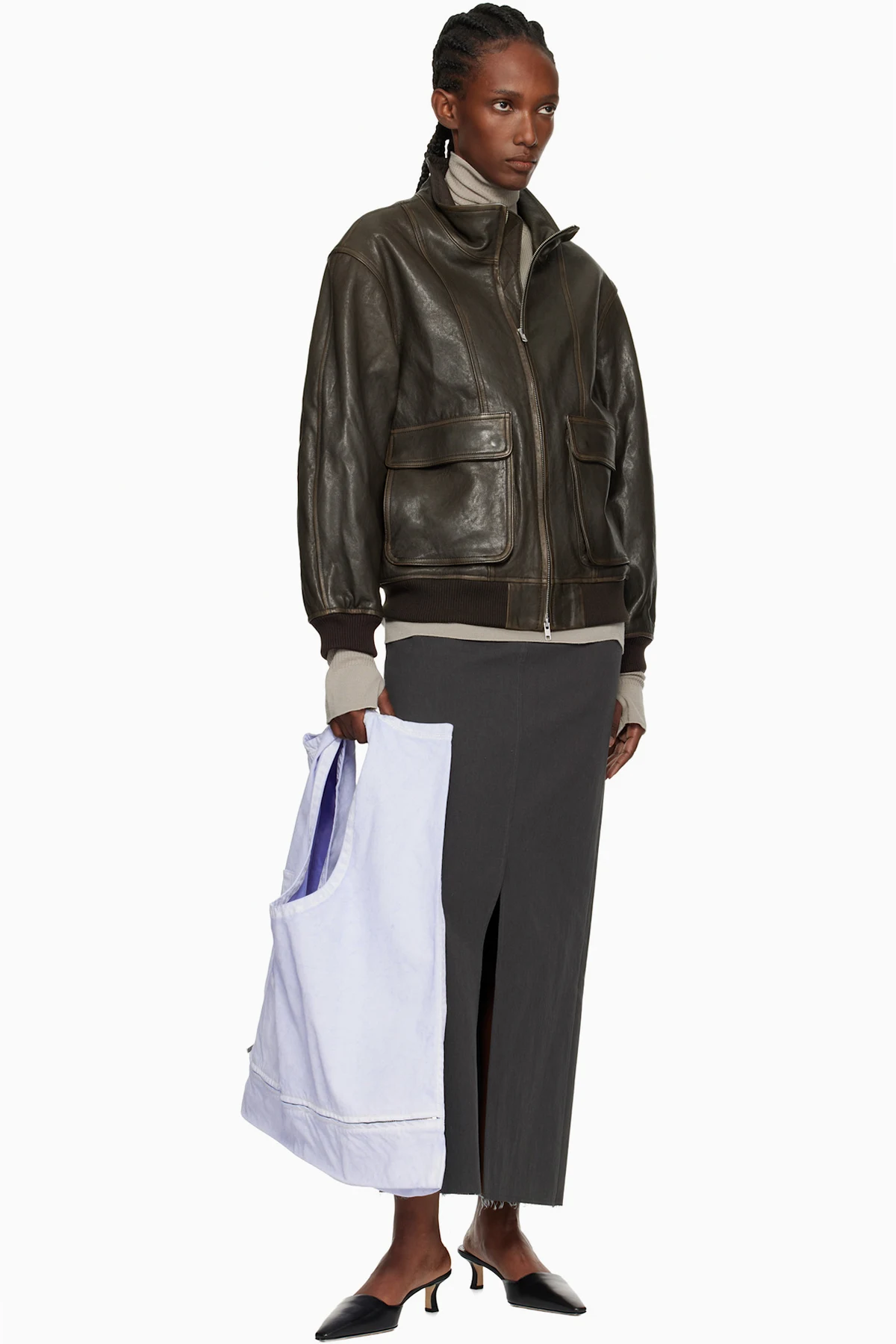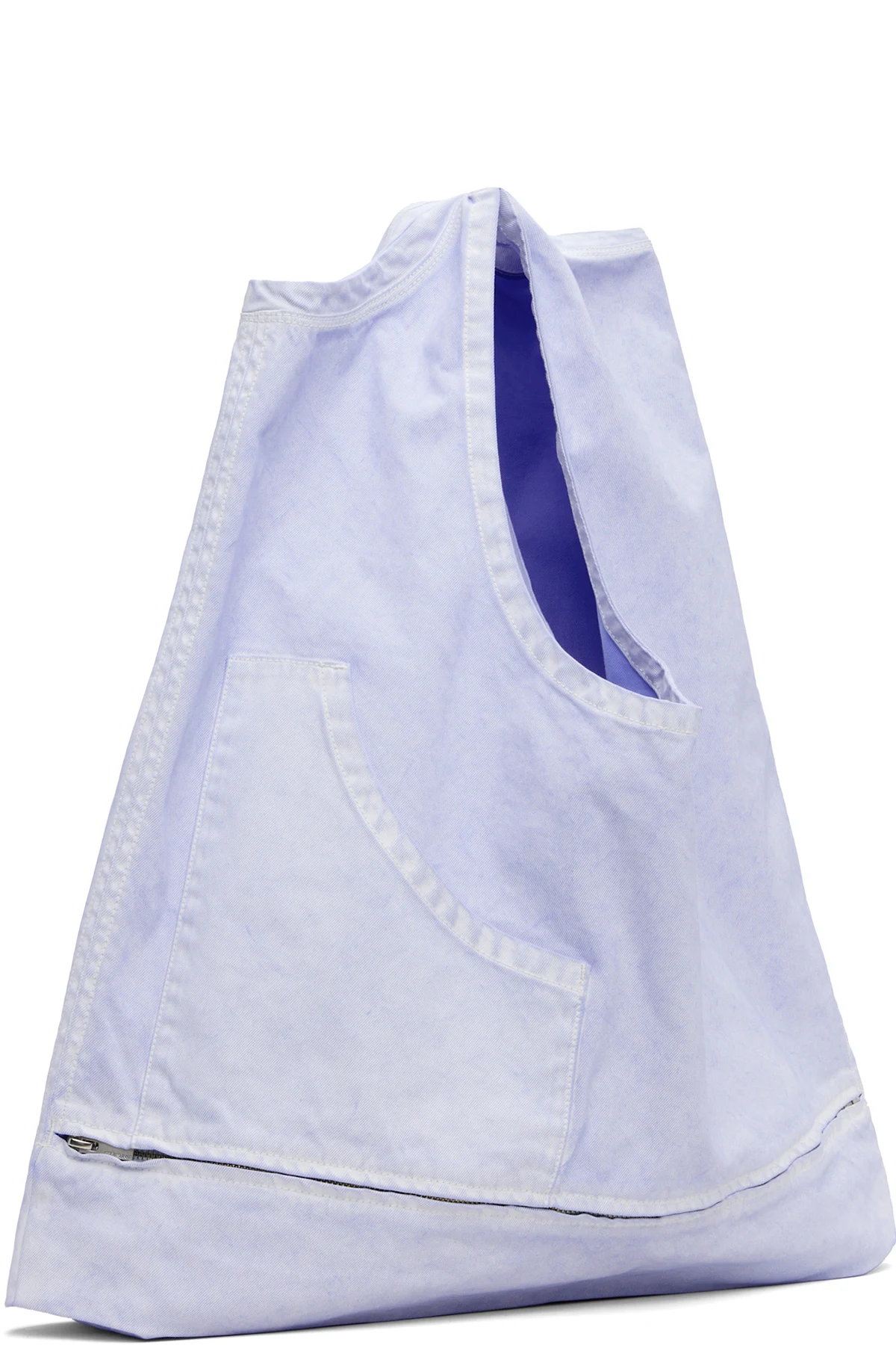 Convertible denim shoulder bag. Converts to sleeveless top with zip fastening at waist.