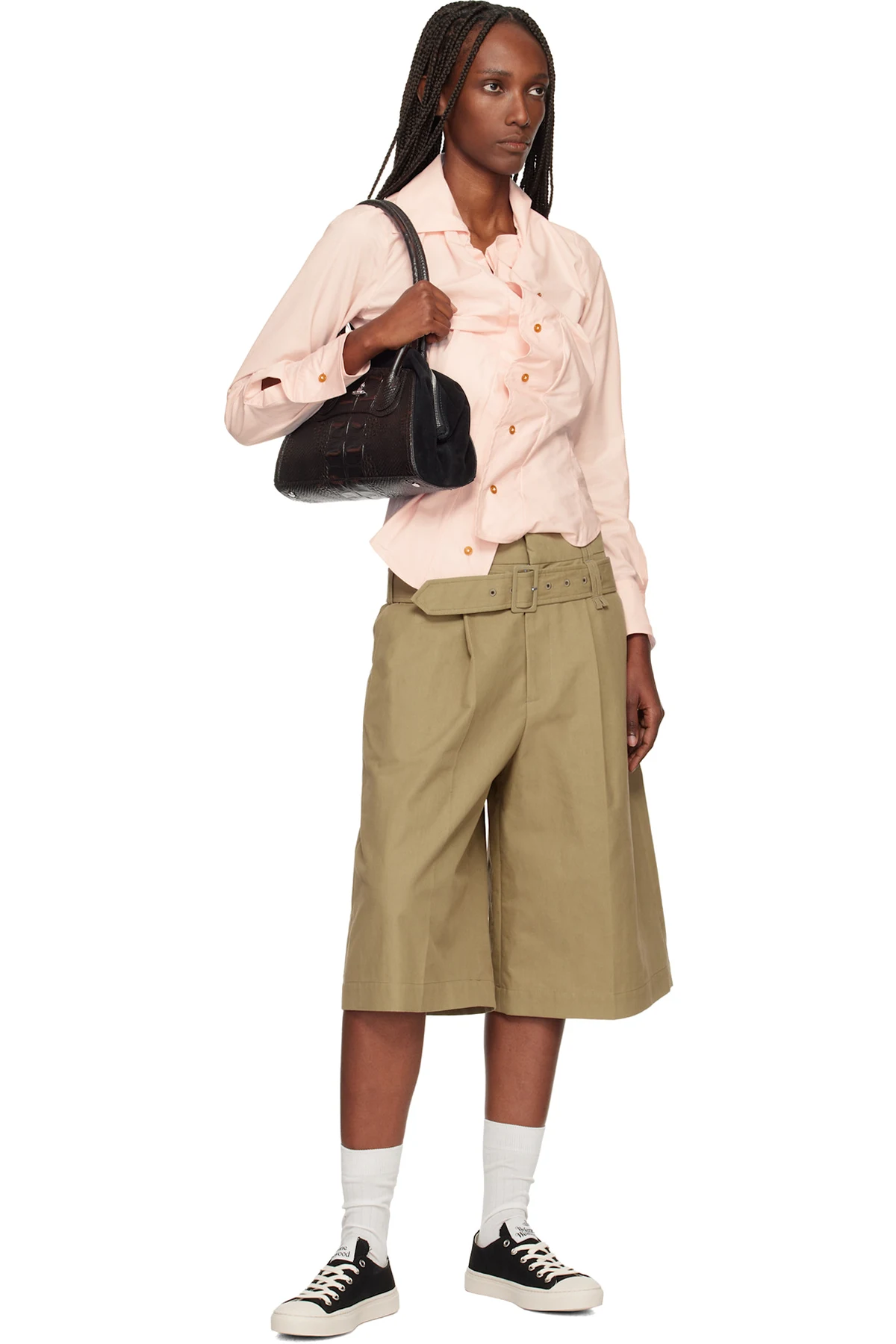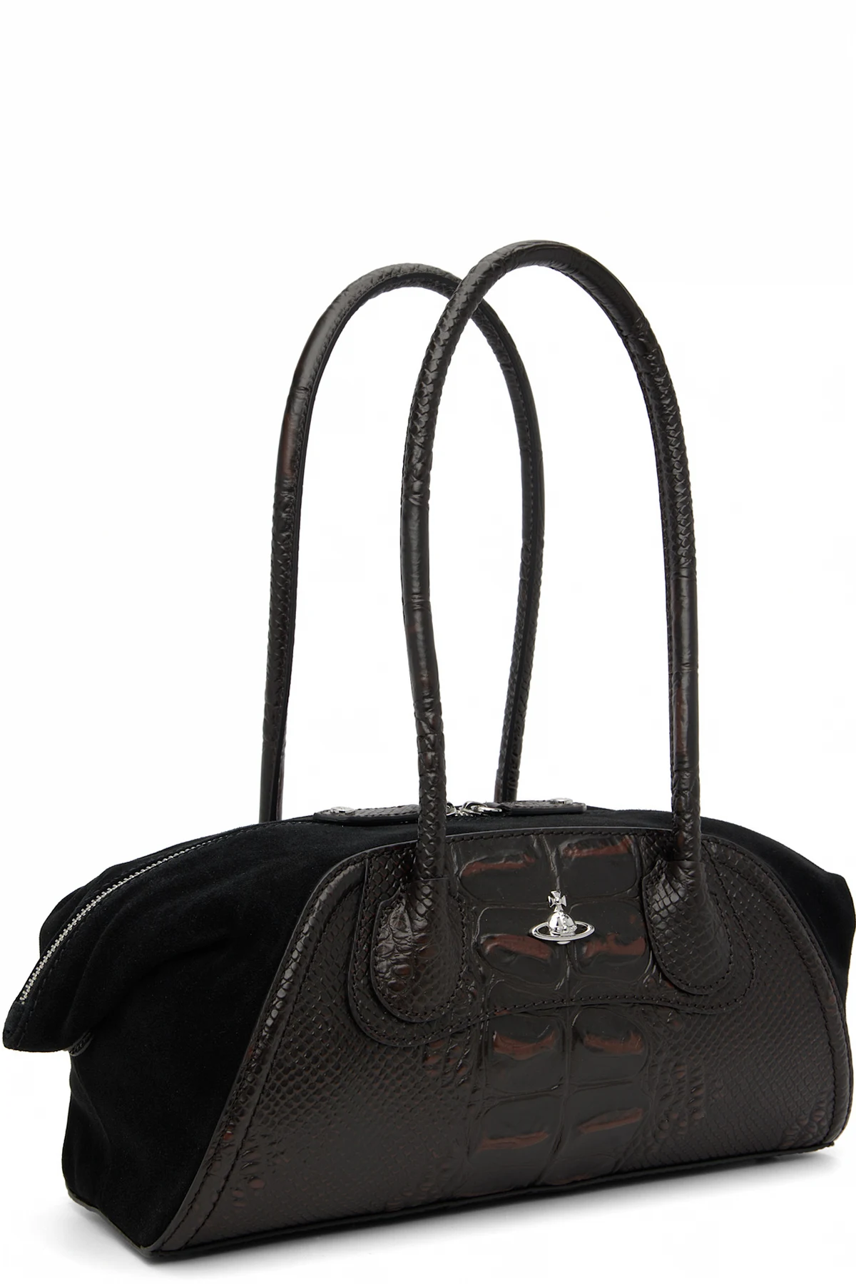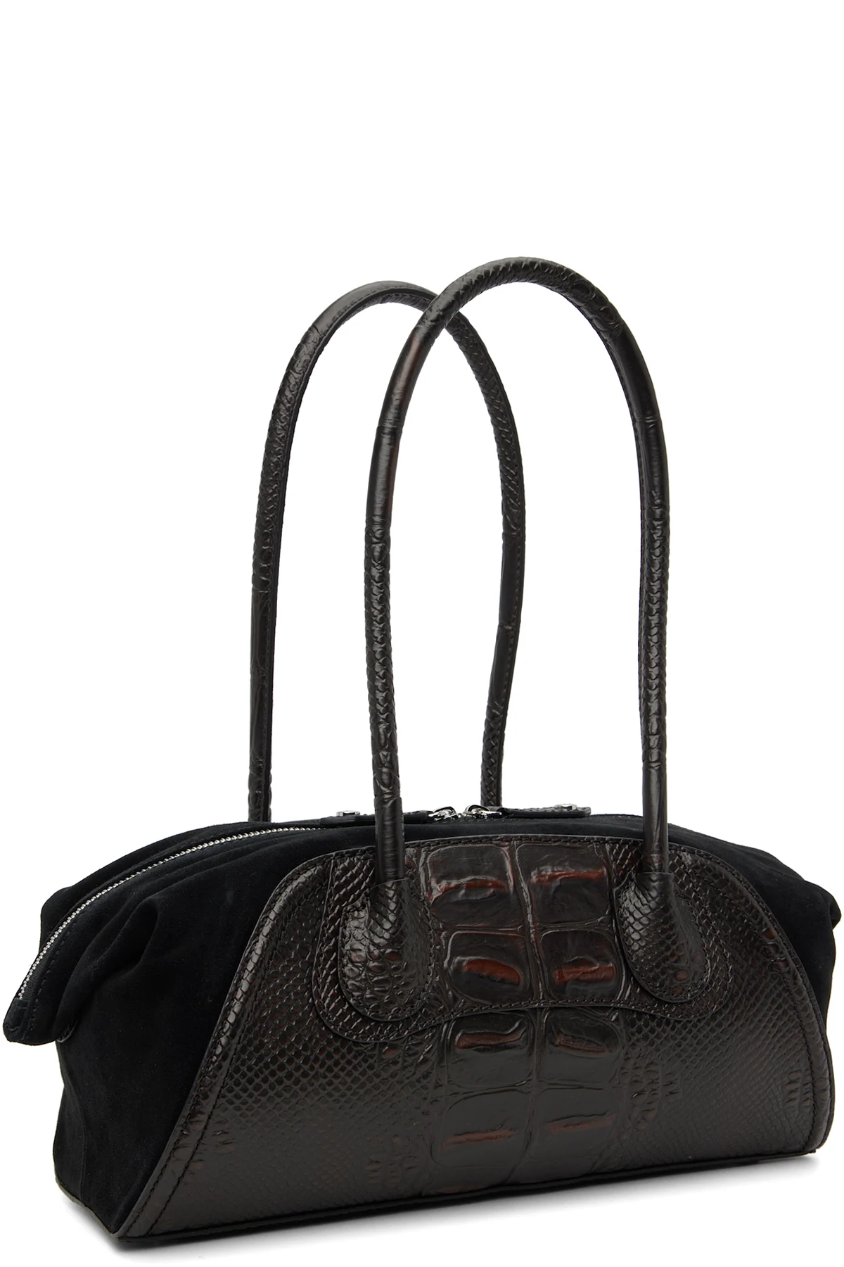 Croc-embossed calfskin and calfskin suede shoulder bag.