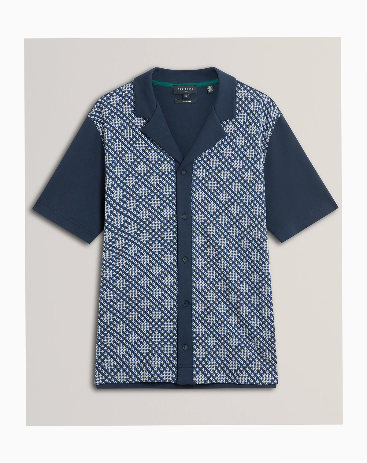 Bring a touch of sophistication to your wardrobe with this Ted Baker Danlibe short-sleeves shirt, highlighted by a bold argyle patterned front panel. The regular fit, button-through design, and camp collar make it a versatile choice for any casual occasion.