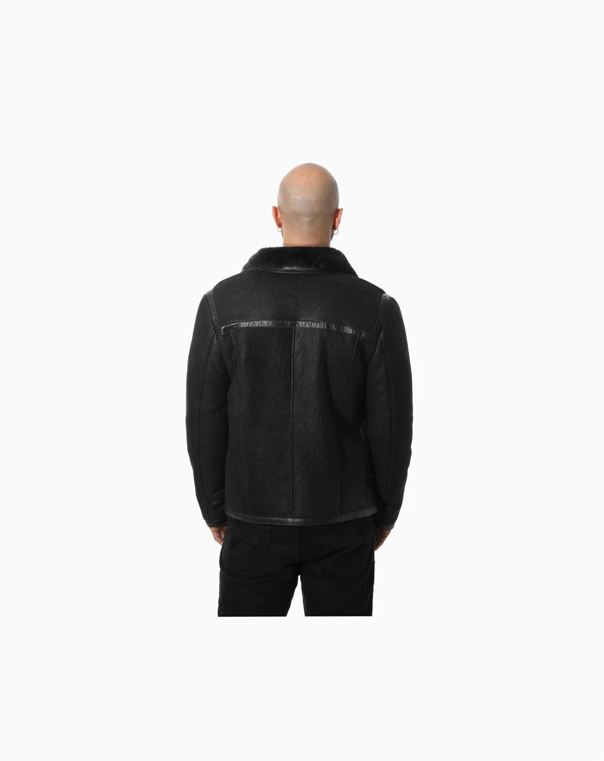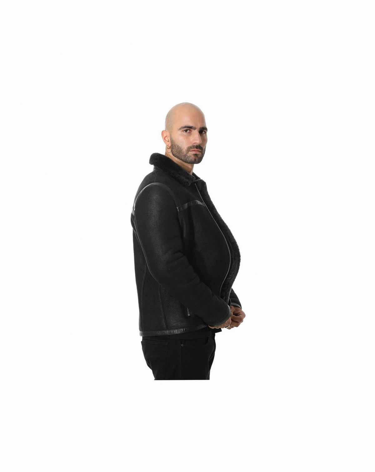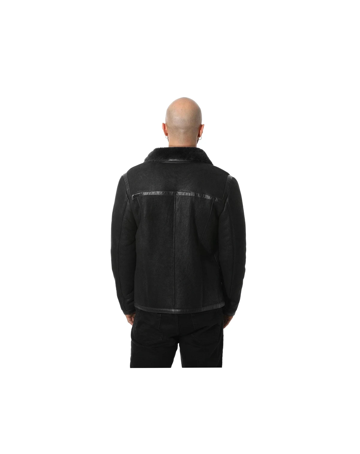 Men's Leather Banded Sheepskin Casual Jacket, Washed Black with Black Wool