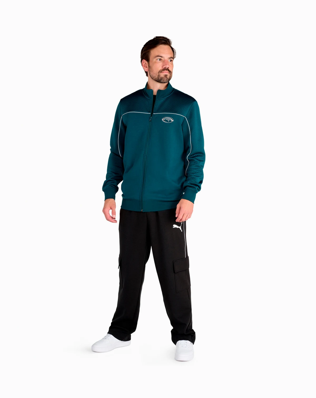 Including a metallic heat transfer badge on the left chest, this Puma jacket offers reflective piping for increased visibility. Quilting details throughout the fabric provide visual interest and a modern sporty appeal.
