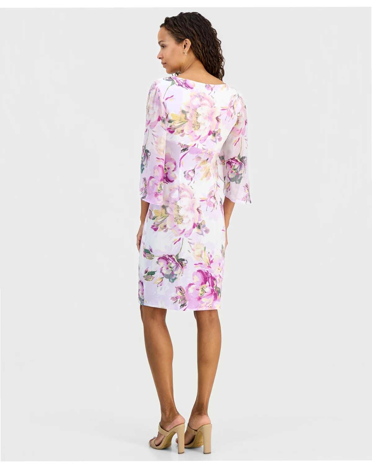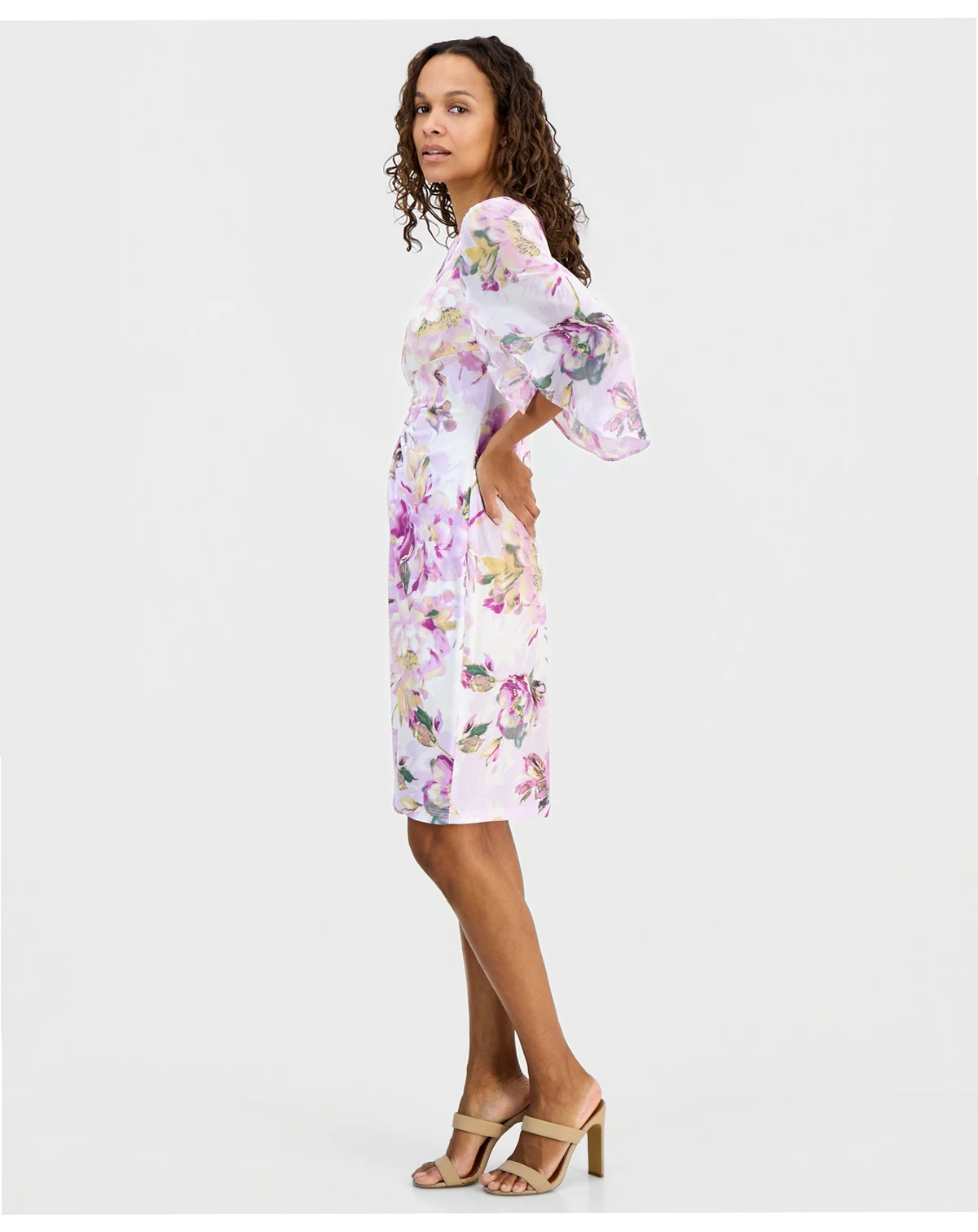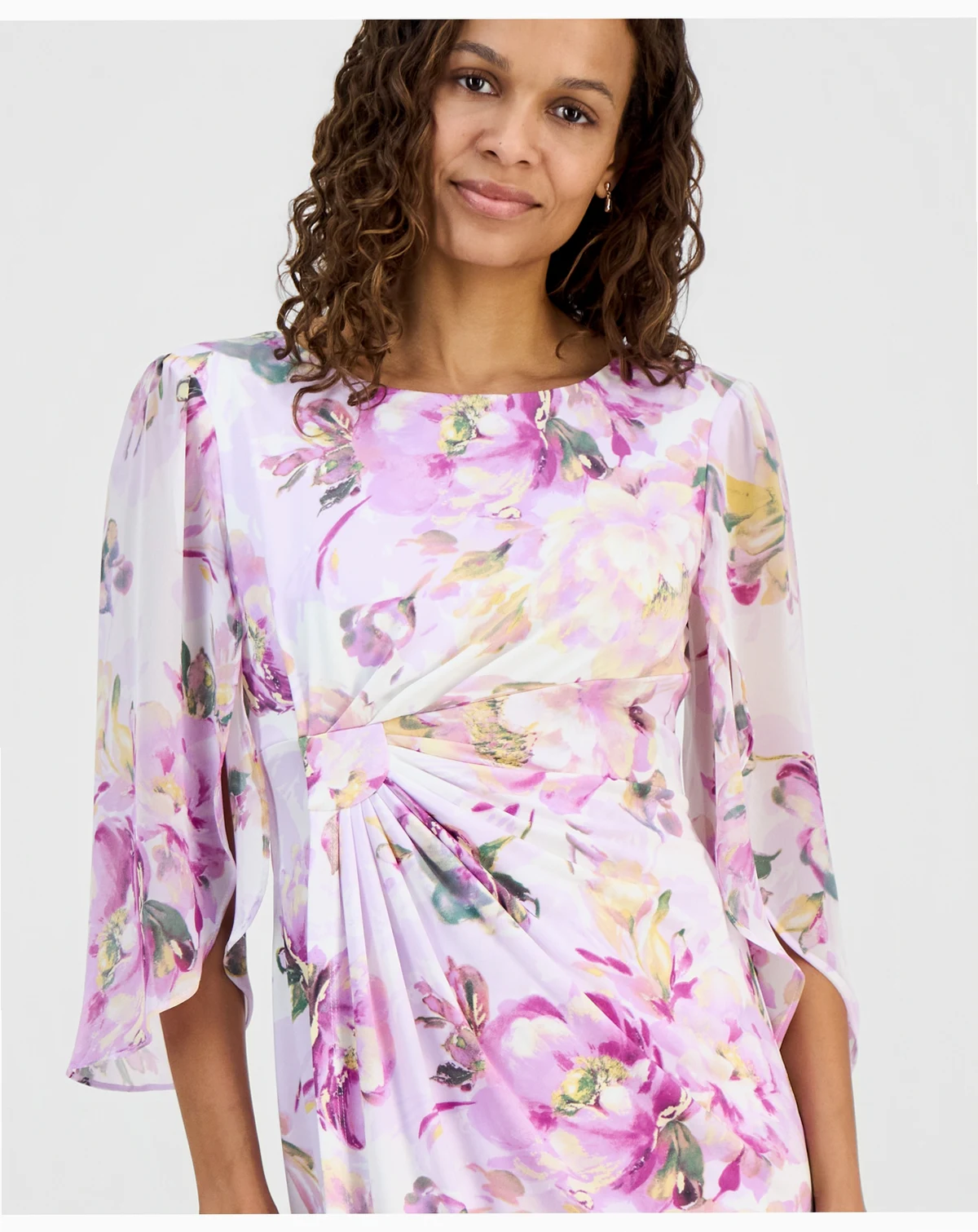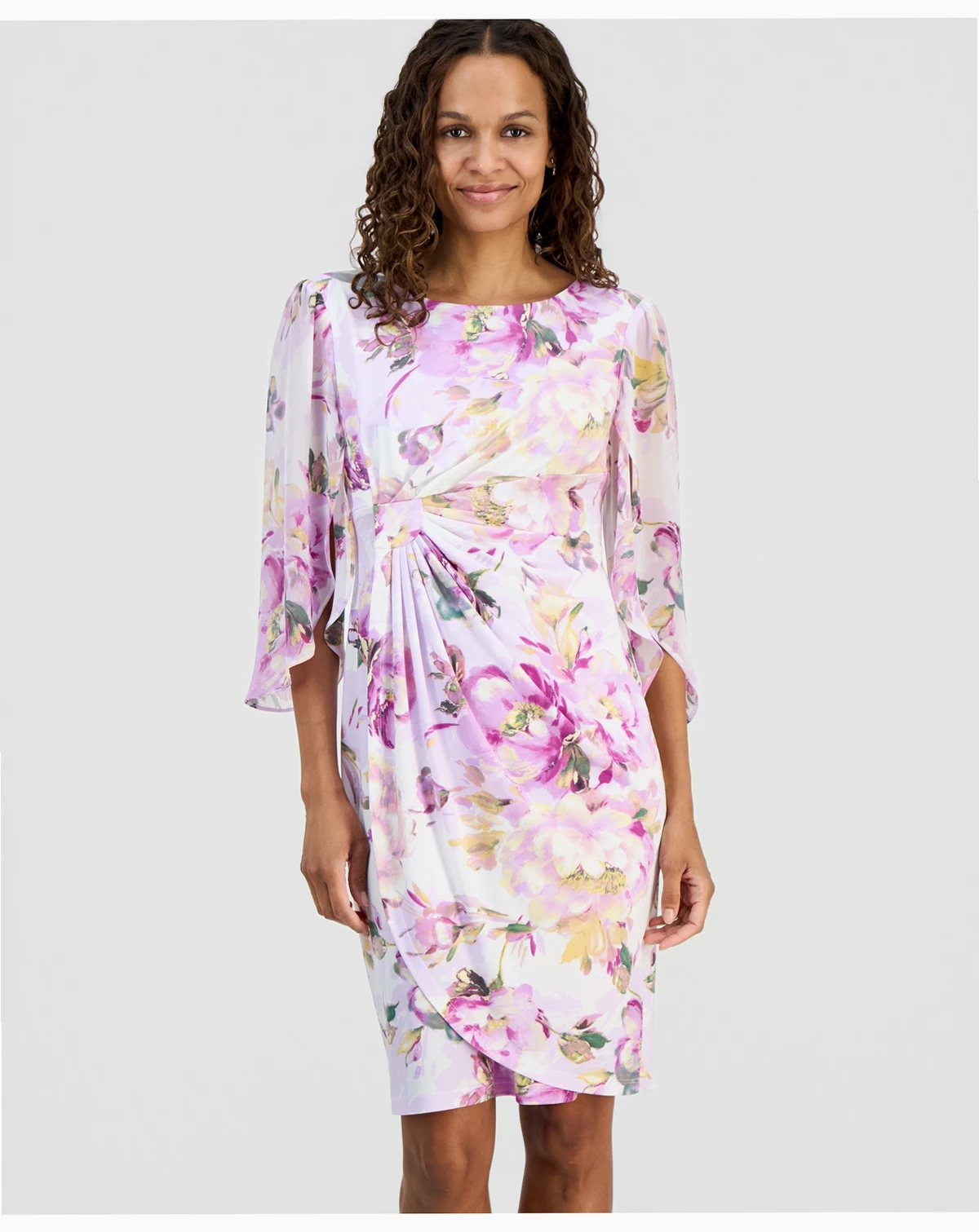 Drama meets delicacy in this cape sleeve dress by Connected. This head-turning piece combines a sophisticated silhouette with a romantic botanical print, designed specifically to celebrate and complement the petite frame.