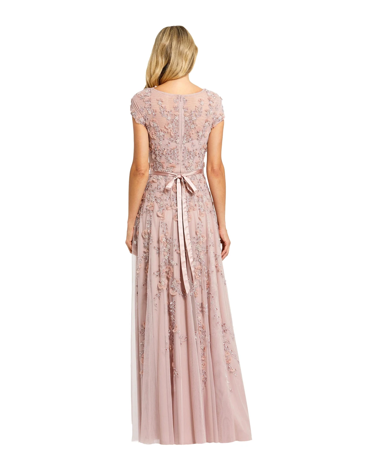 Embroidered floral gown with a sheer illusion neckline, cap sleeves, and a flowing floor-length silhouette. Finished with intricate detailing and soft movement, this elegant style is ideal for weddings, formal events, and special occasions.