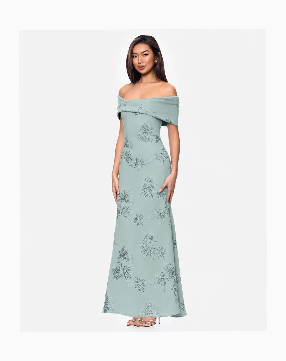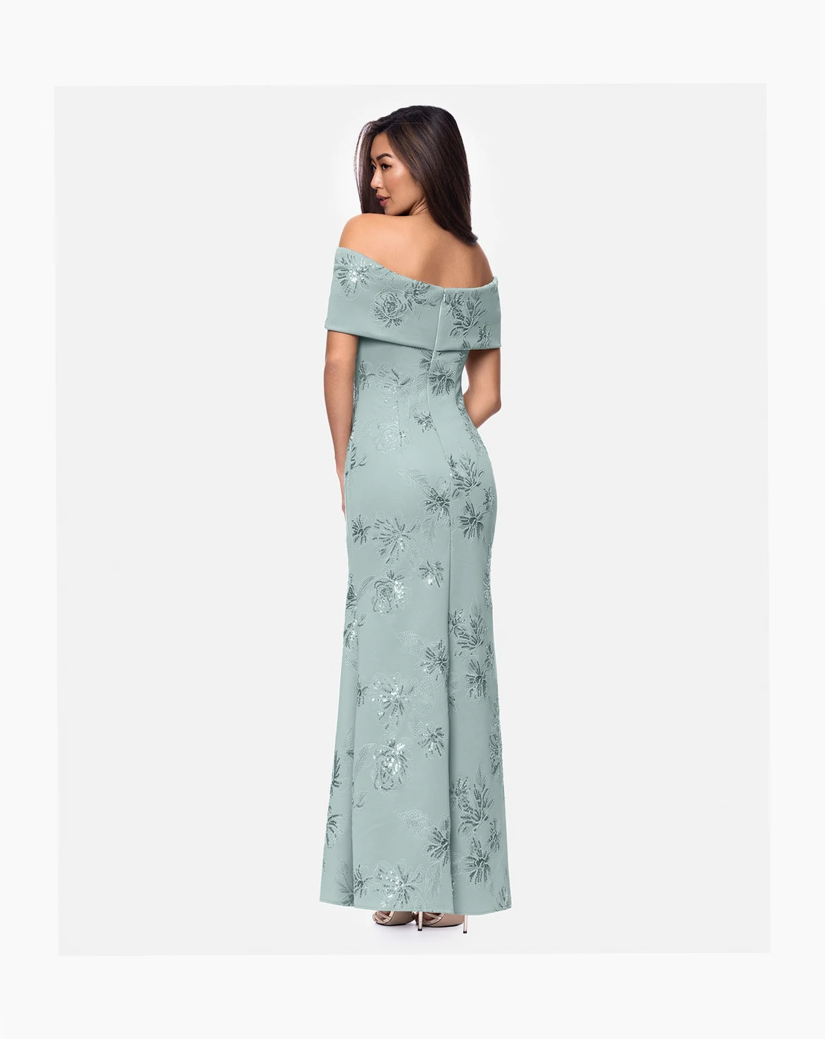 Evening-ready charm shines through this Betsy & Adam off-the-shoulder dress with a clean, sculpted neckline that highlights the shoulders. A center back zipper closure ensures a secure, streamlined fit that keeps the silhouette polished from every angle.