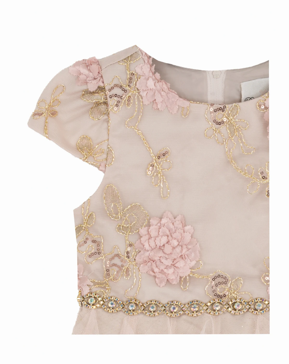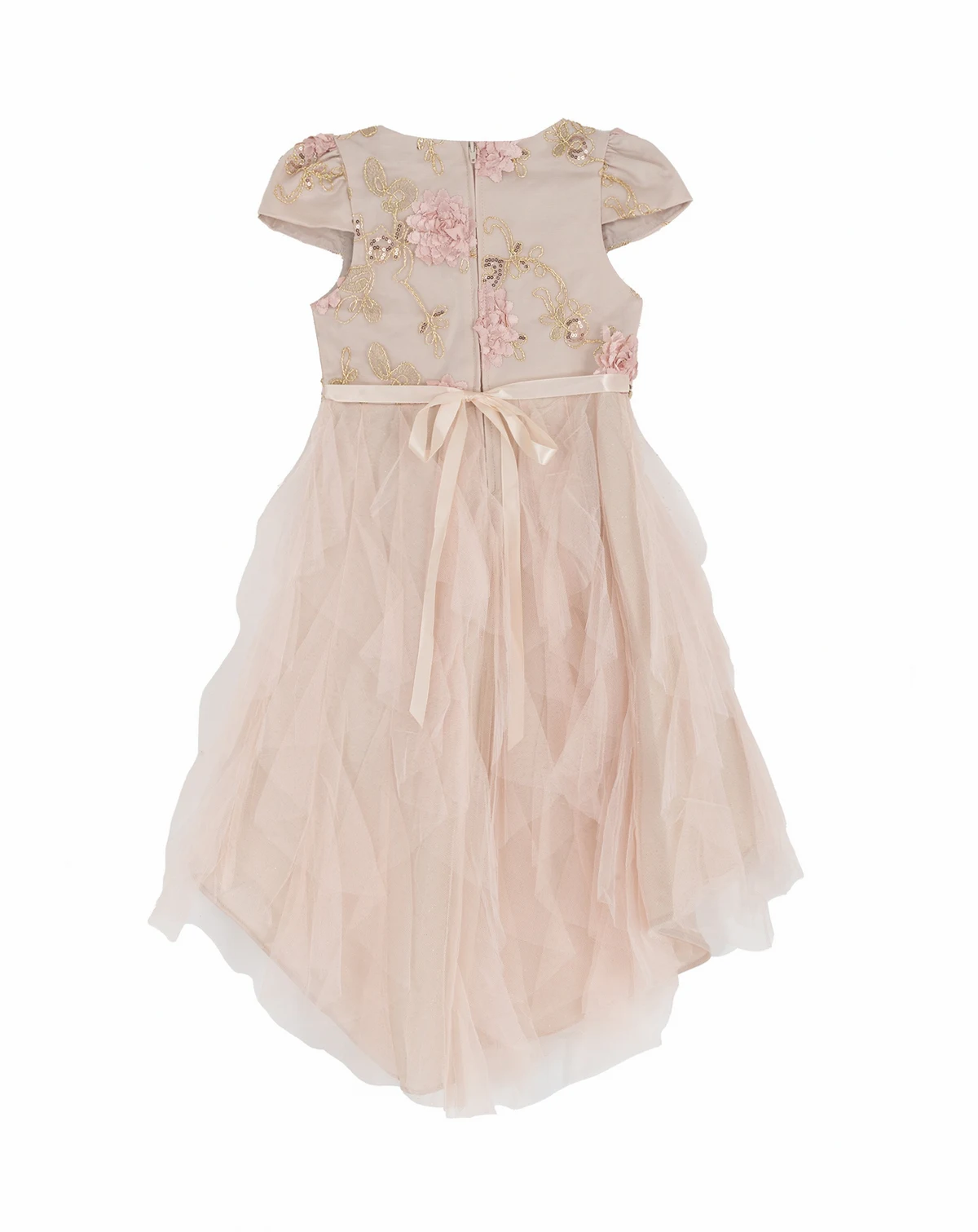 Dreaming in blush, this Rare Editions high-low dress sparkles with an embroidered soutache floral bodice. Glittering sequins, delicate cap sleeves, and a jeweled waist create extra twinkles.