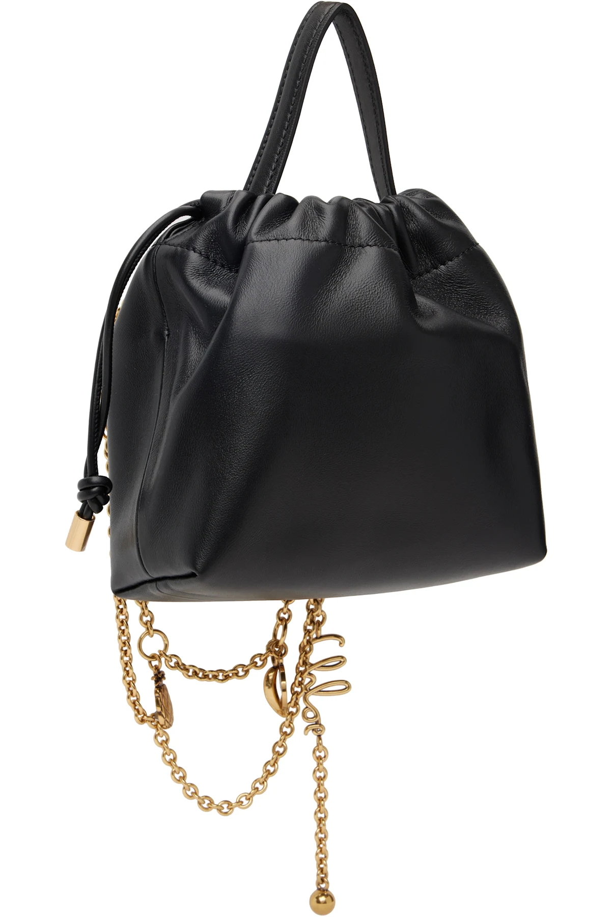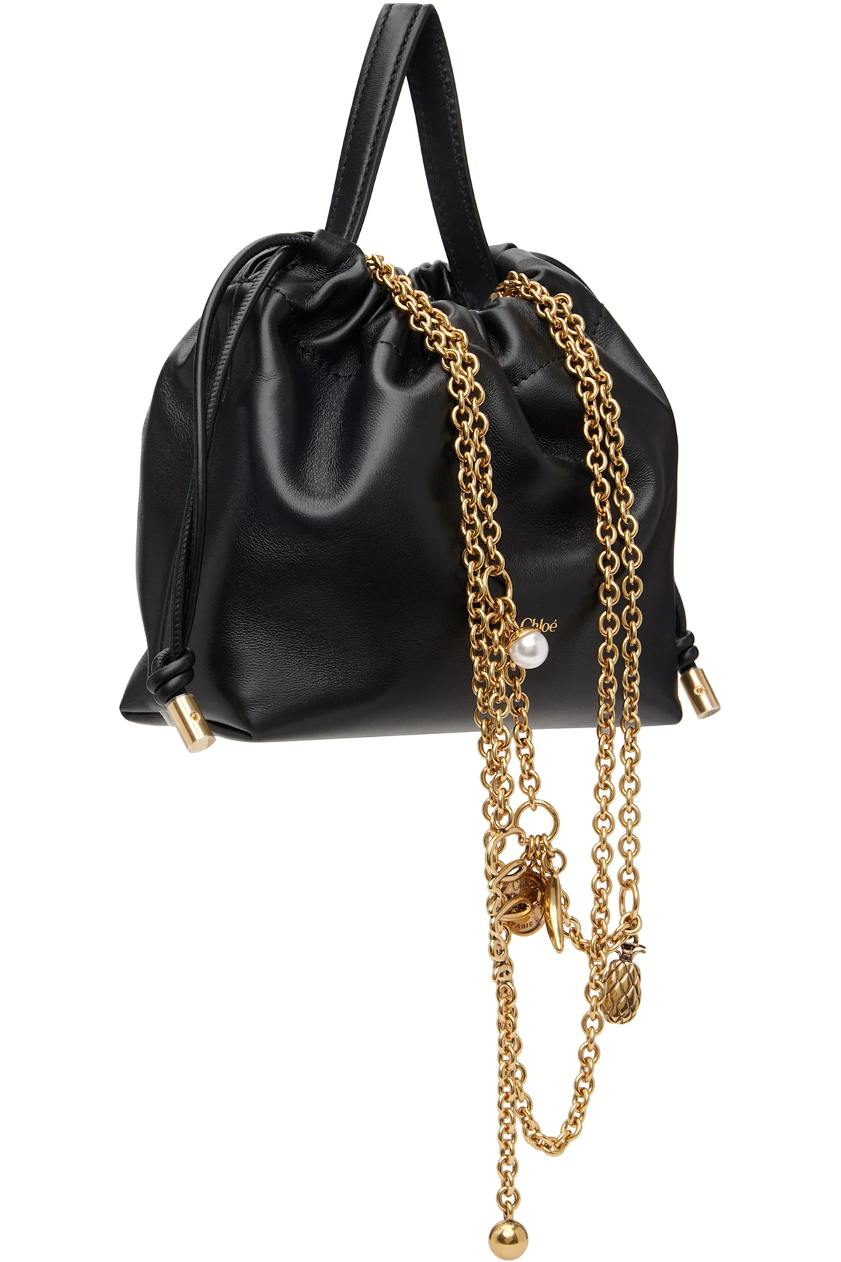 · Logo disc, faux pearl, and graphic charms at strap