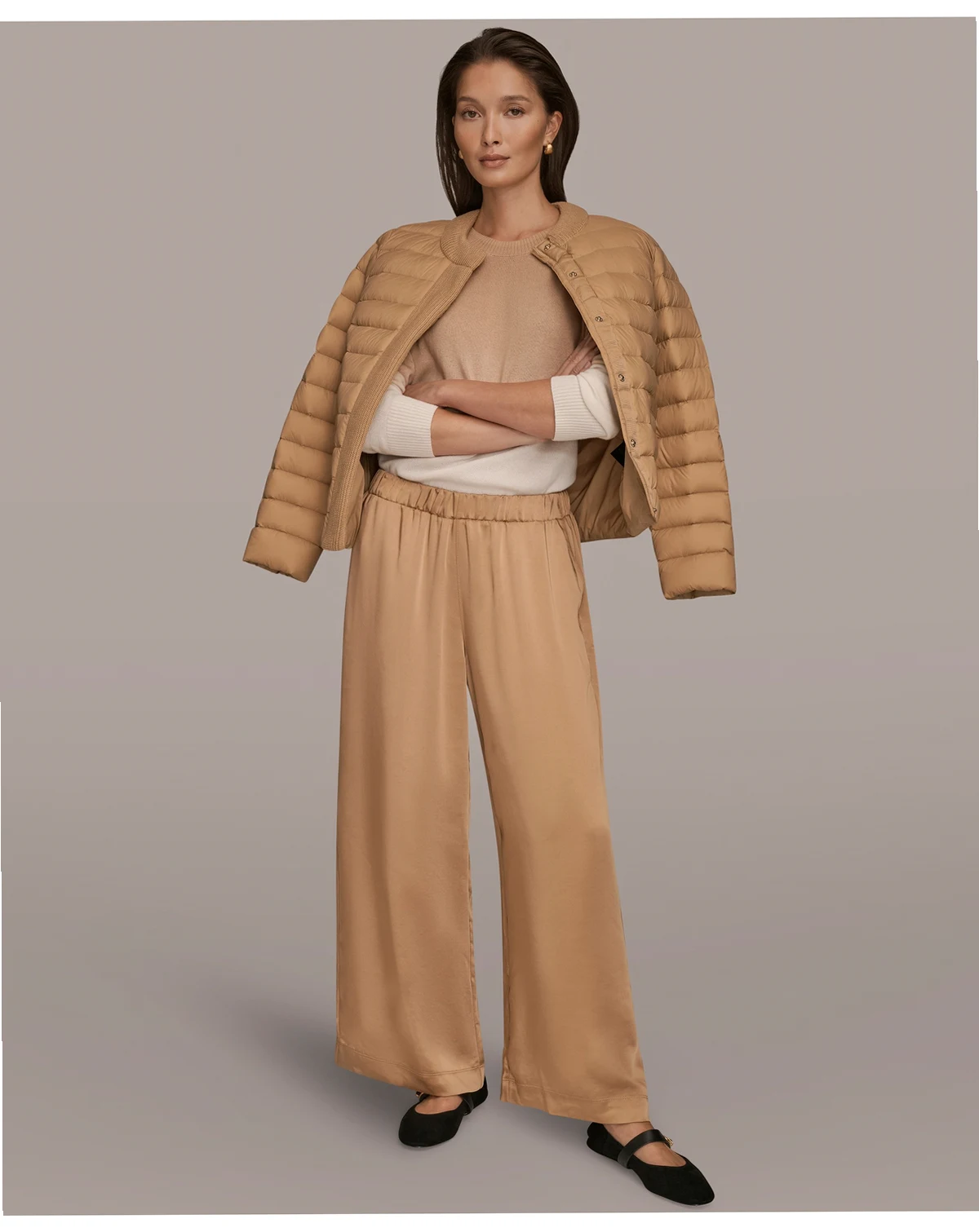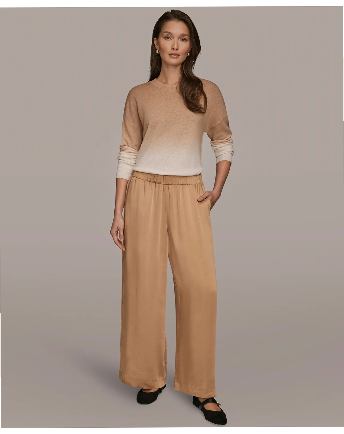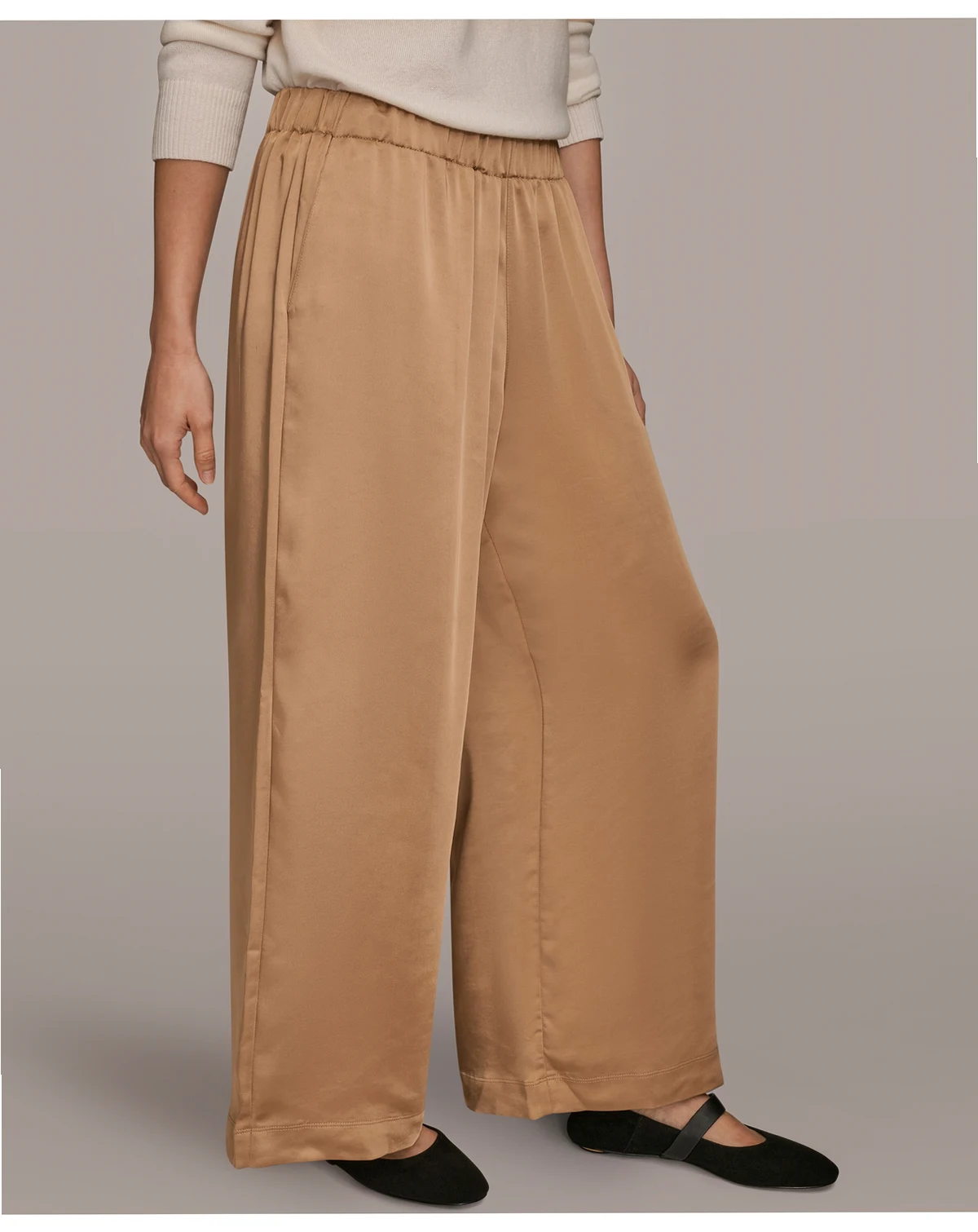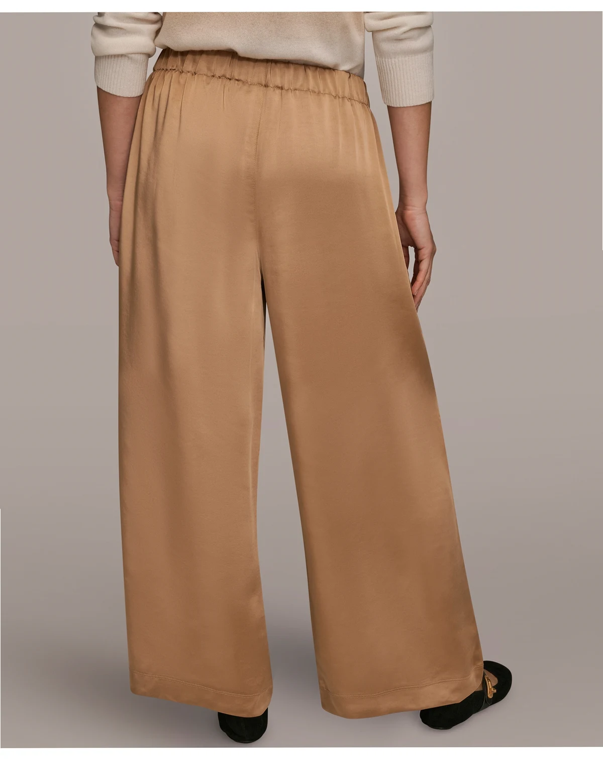 Effortless luxury defines the Donna Karan New York Women's Pull-On Satin Mid Rise Wide Leg Pants, featuring fluid satin fabric, a mid-rise pull-on waist, wide-leg silhouette, and slant pockets. Ideal for evening dinners, resort holidays, or day-to-night dressing.