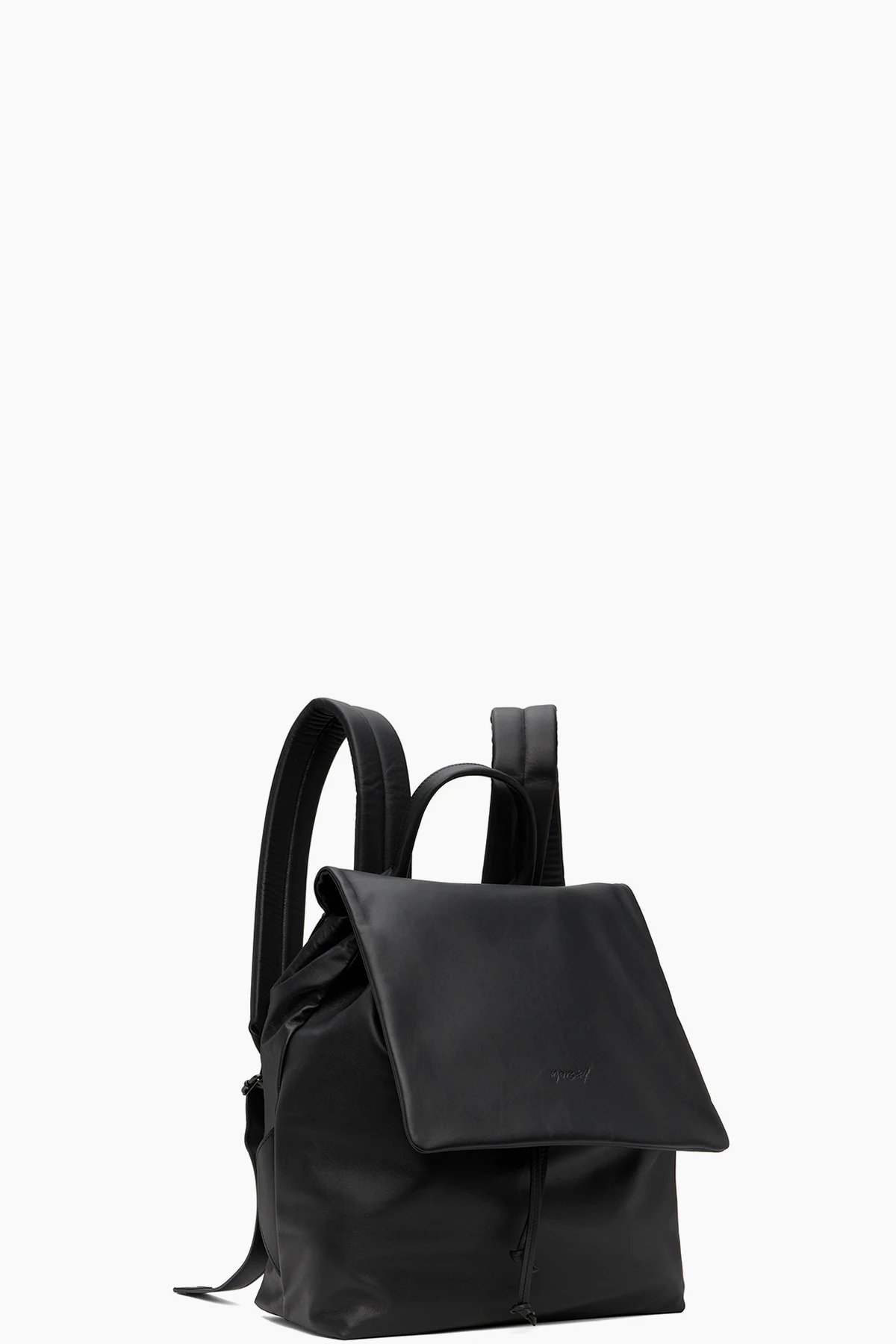 · Logo-embossed foldover flap at face
