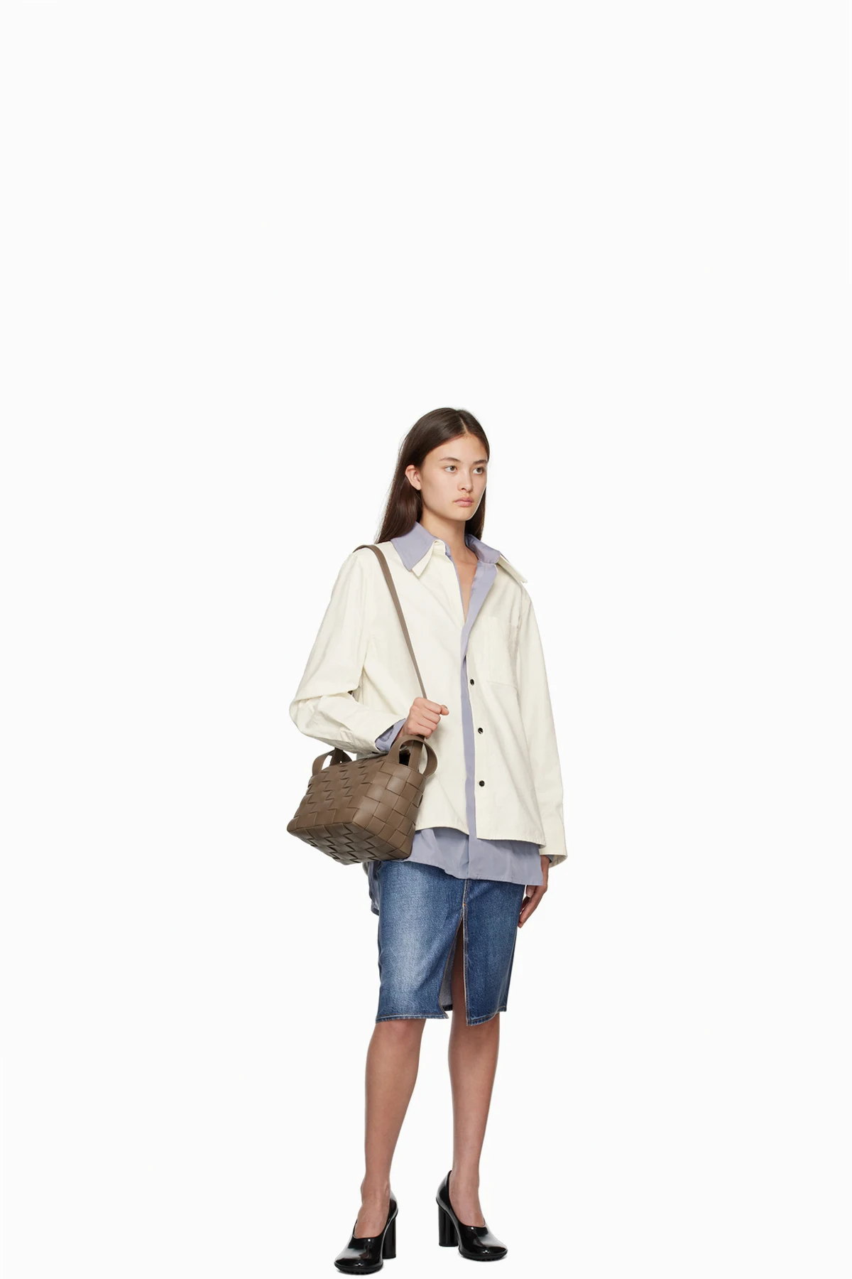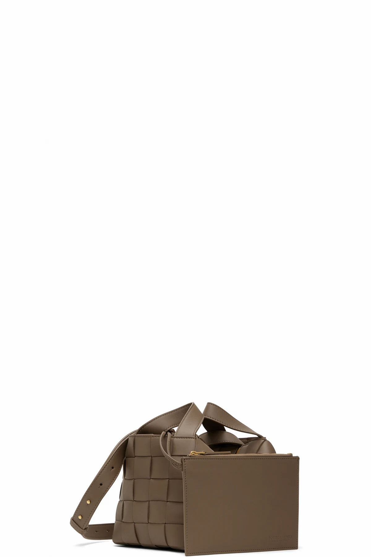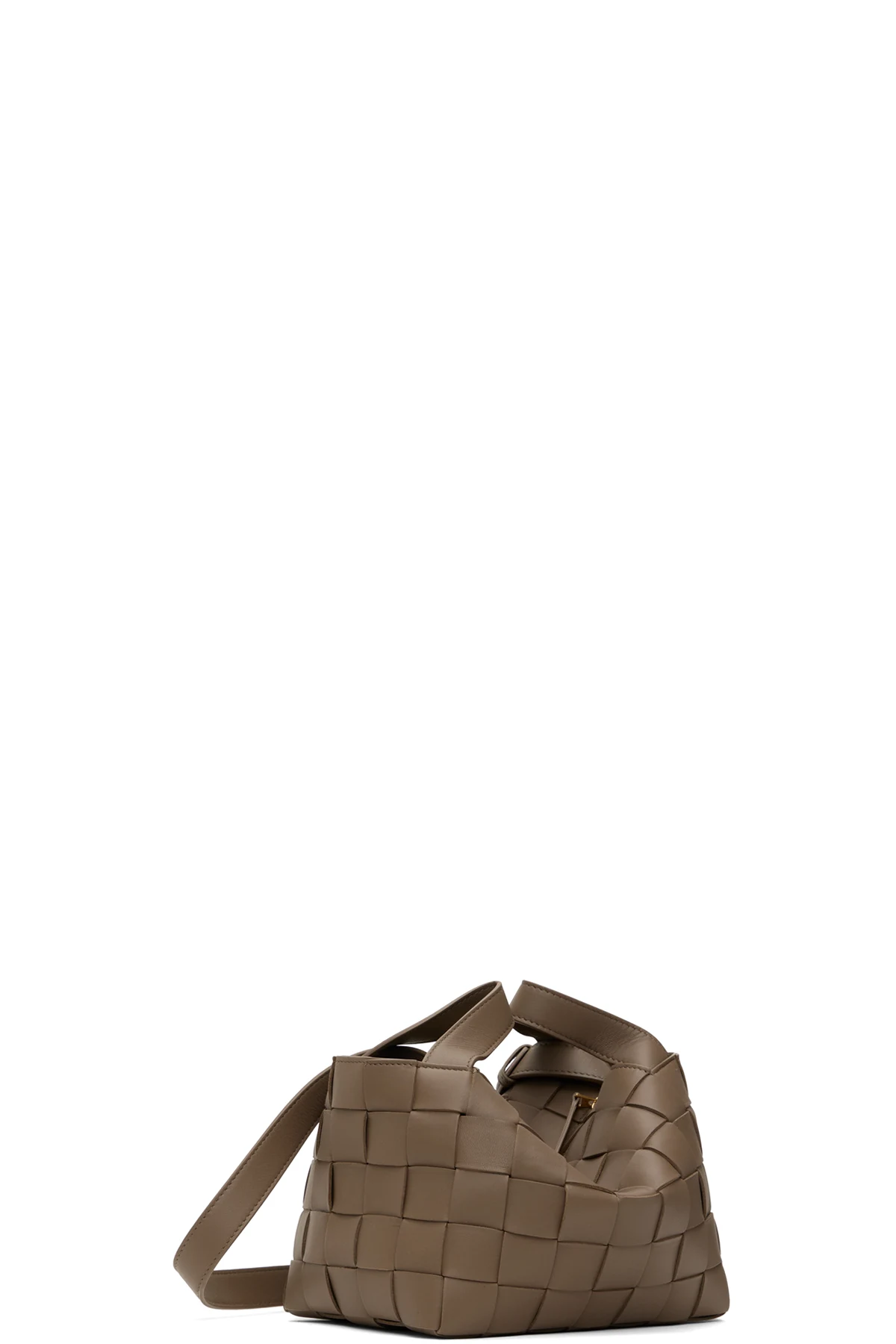 Intreccio-woven grained lambskin top handle bag in taupe.